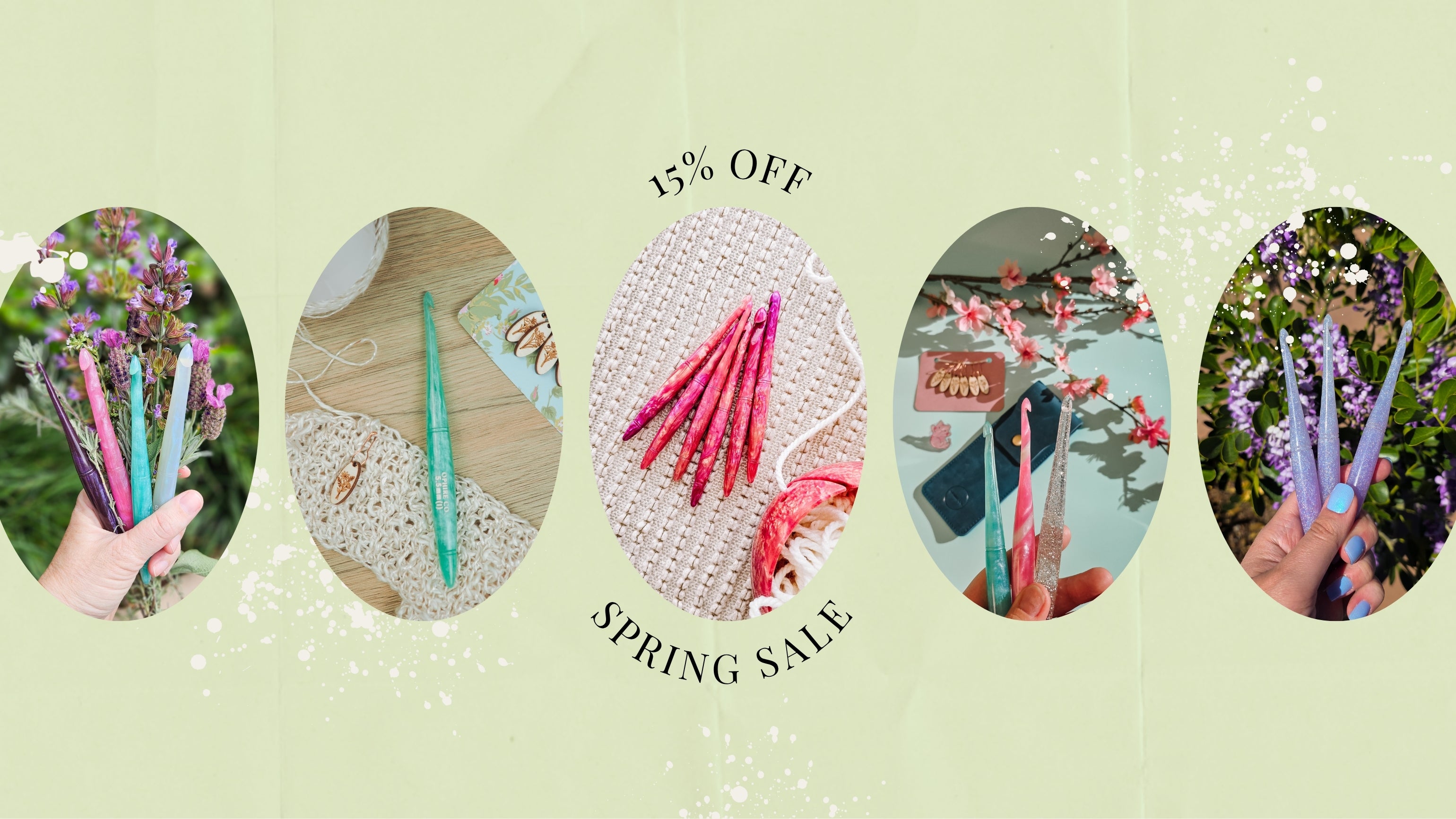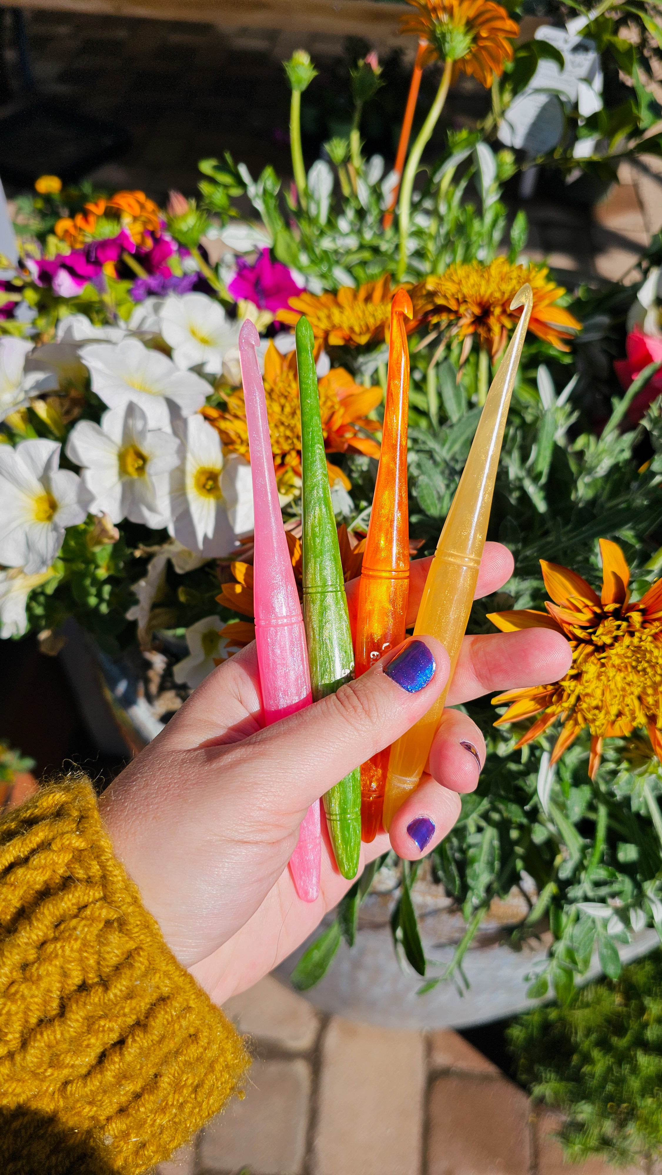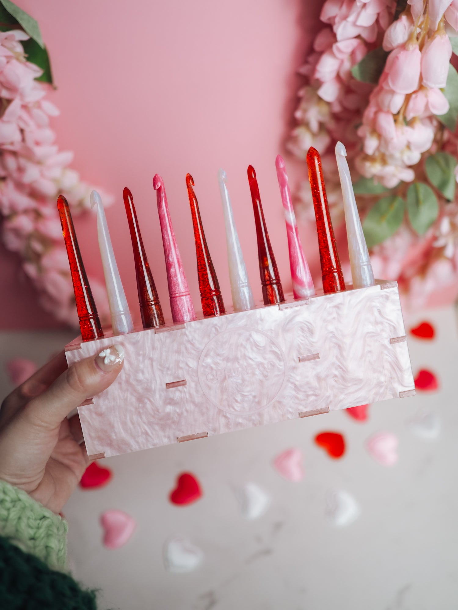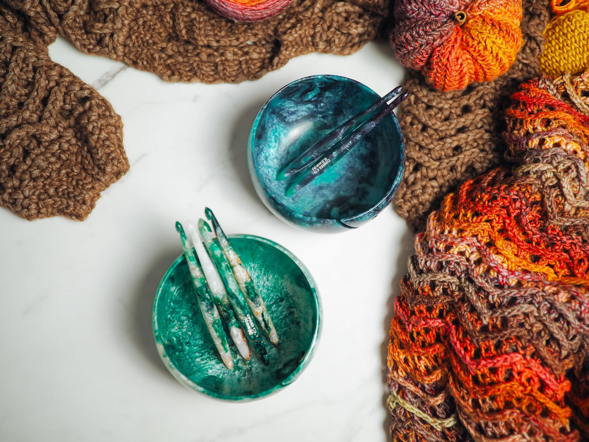 Each crochet hook is hand poured and carved one by one. Each color is hand spiraled which means each hook is completely unique!
