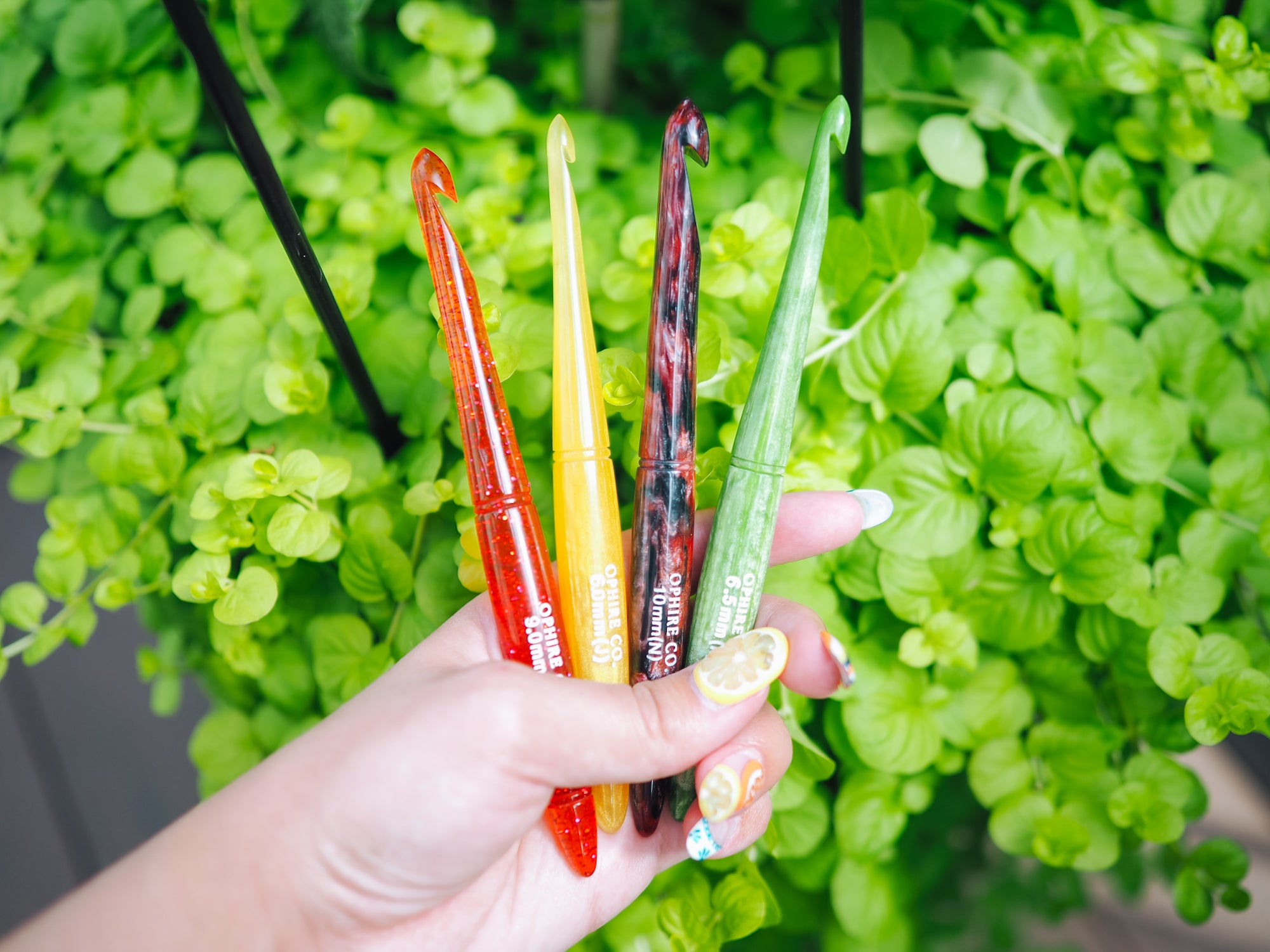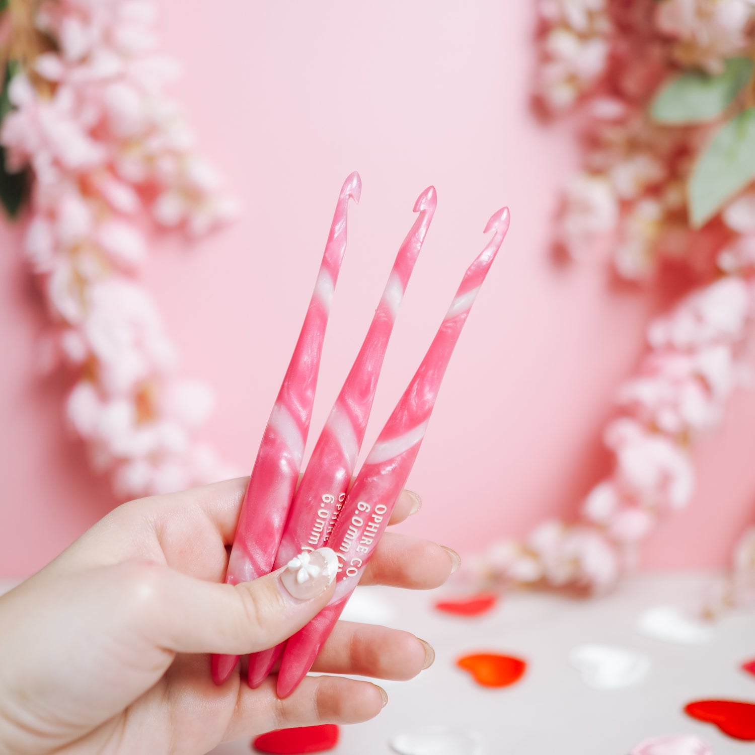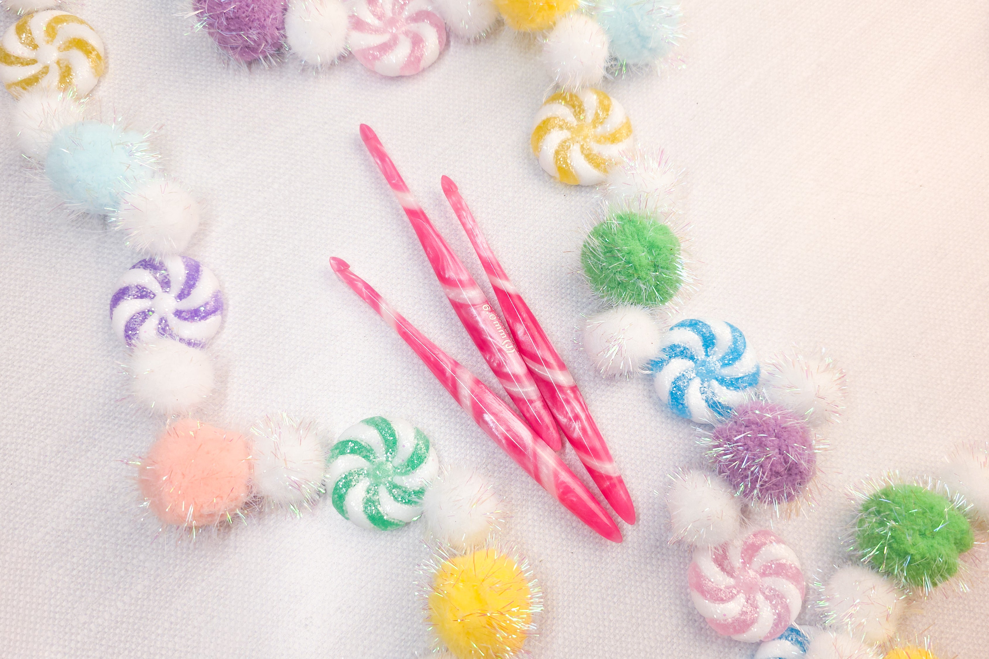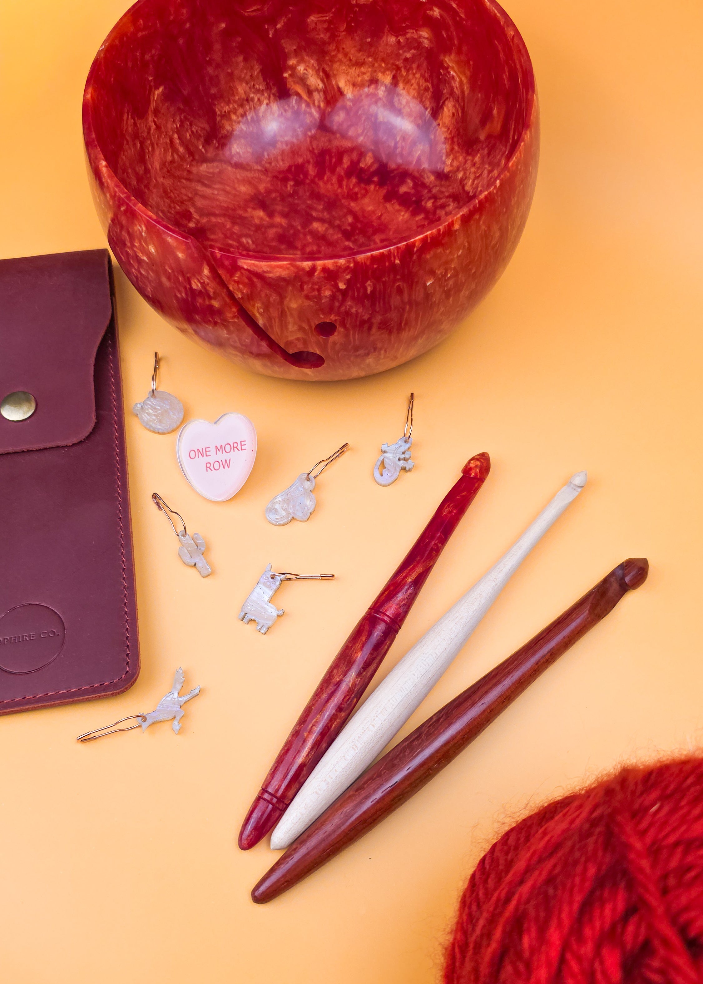 Each crochet hook is hand poured and carved one by one. Each color is hand spiraled which means each hook is completely unique!