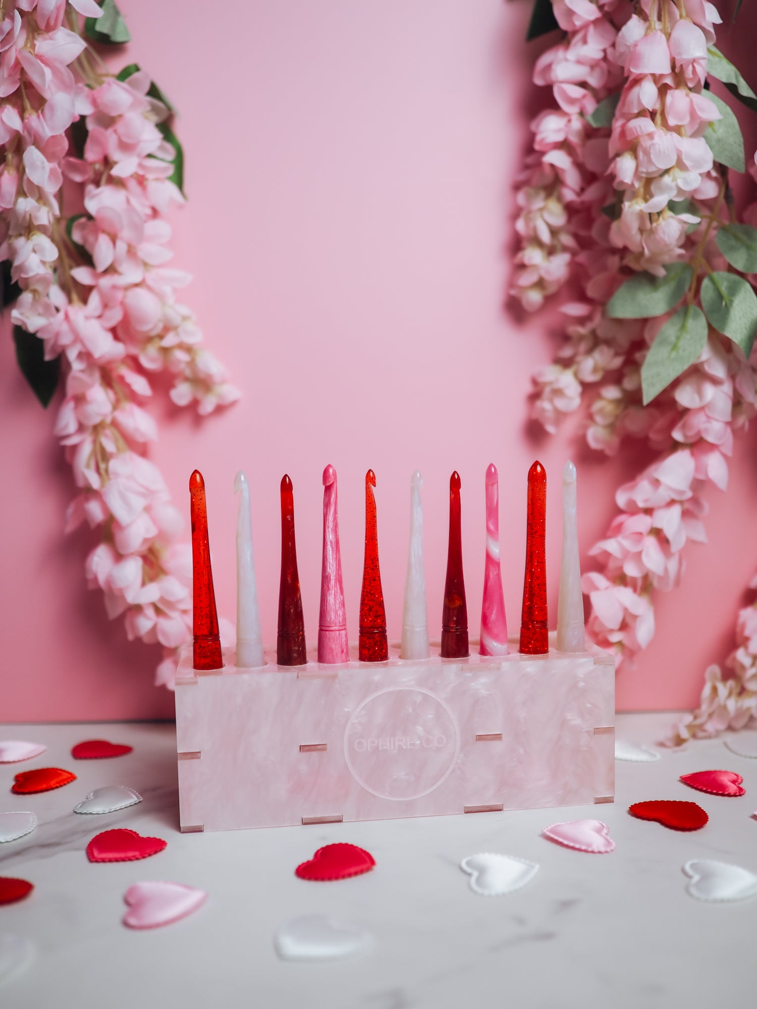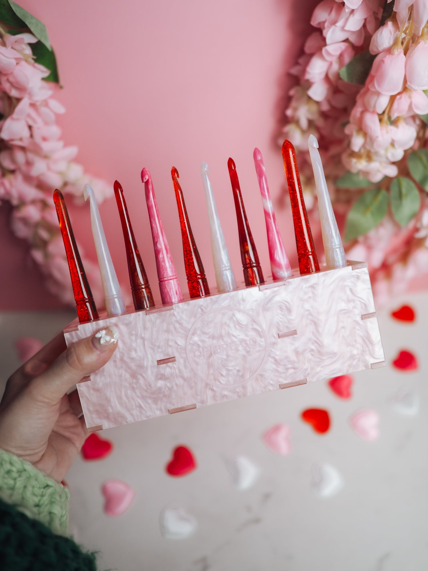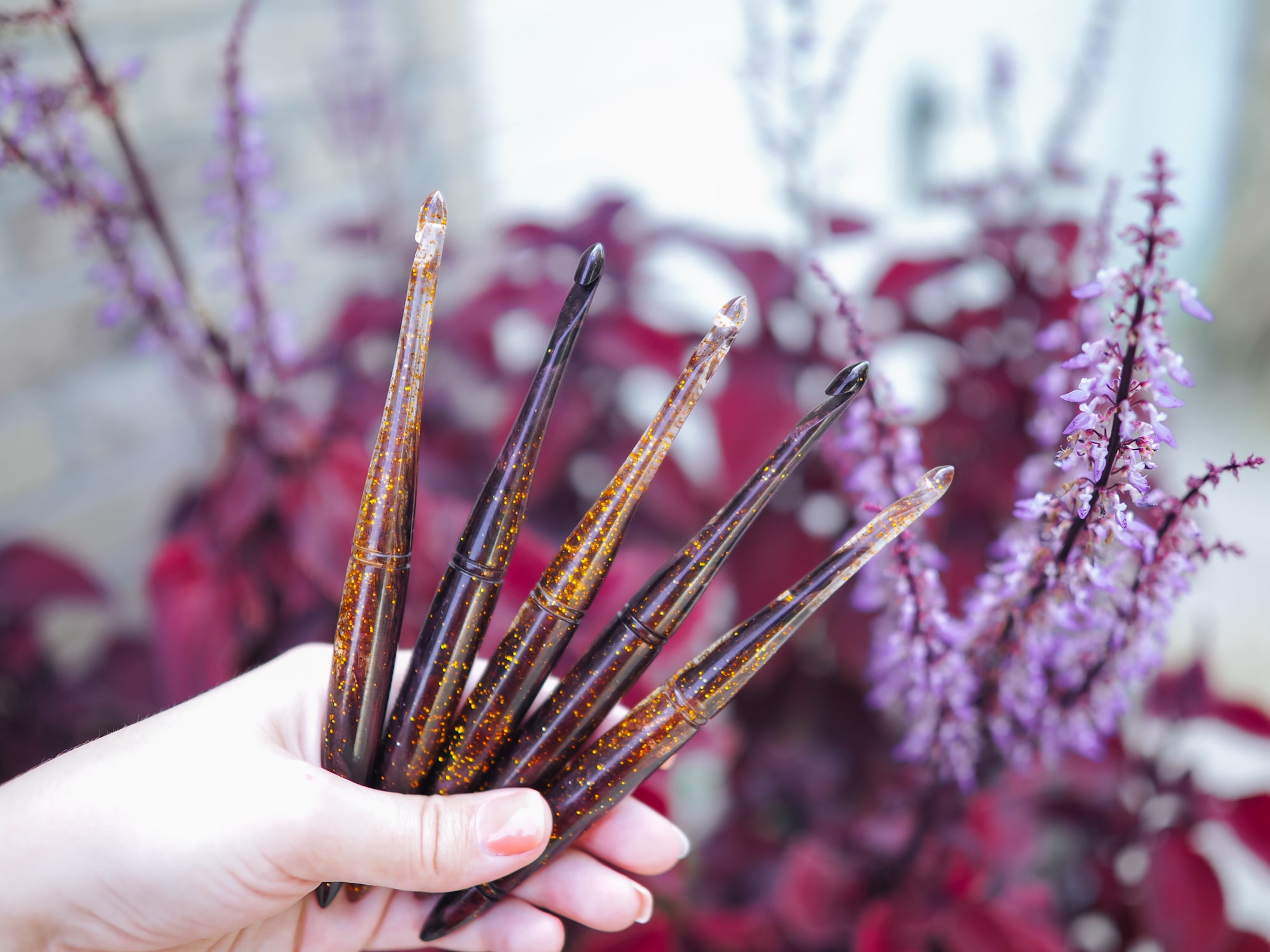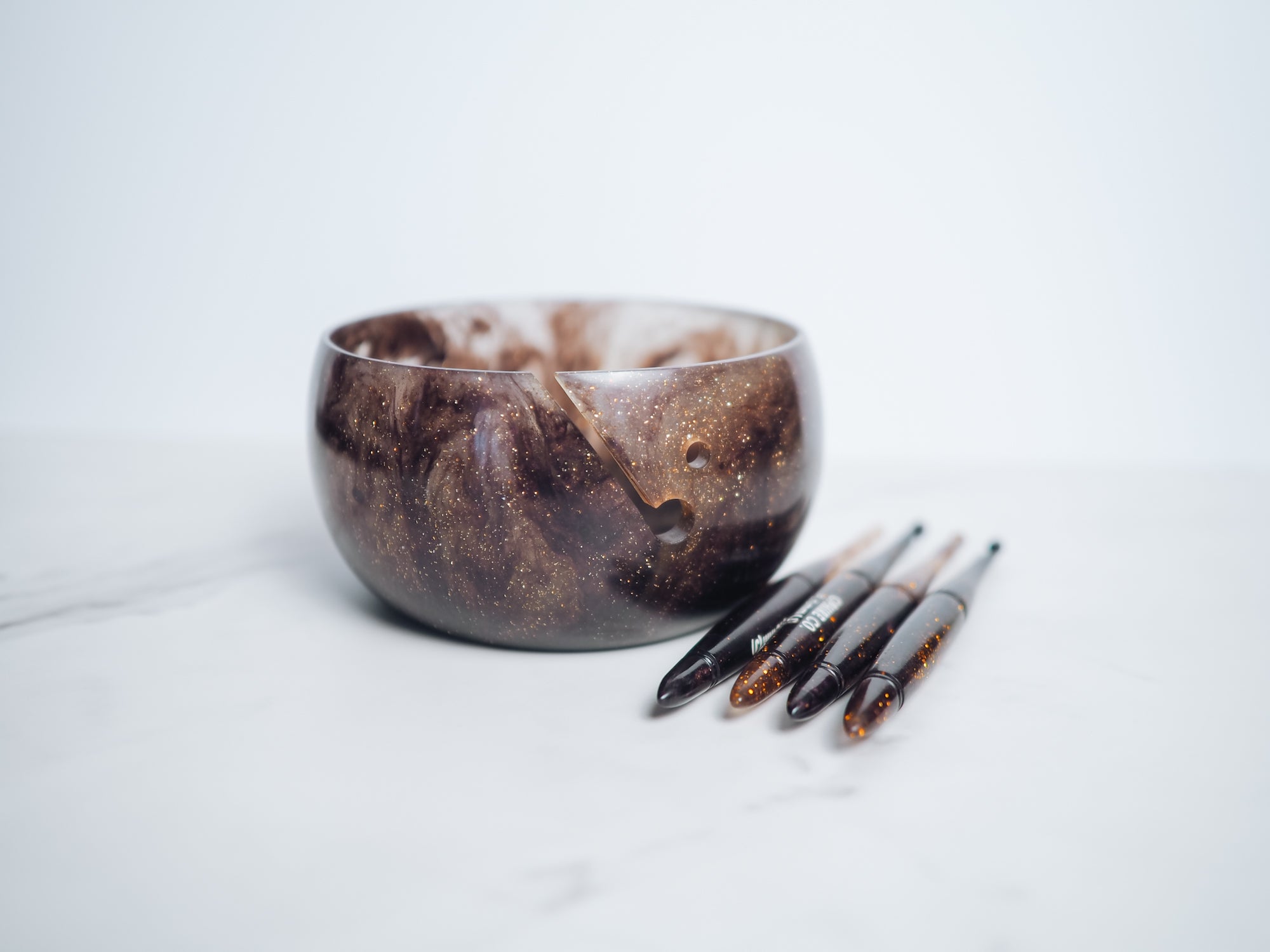 Each crochet hook is hand poured and carved one by one. Each color is hand spiraled which means each hook is completely unique!