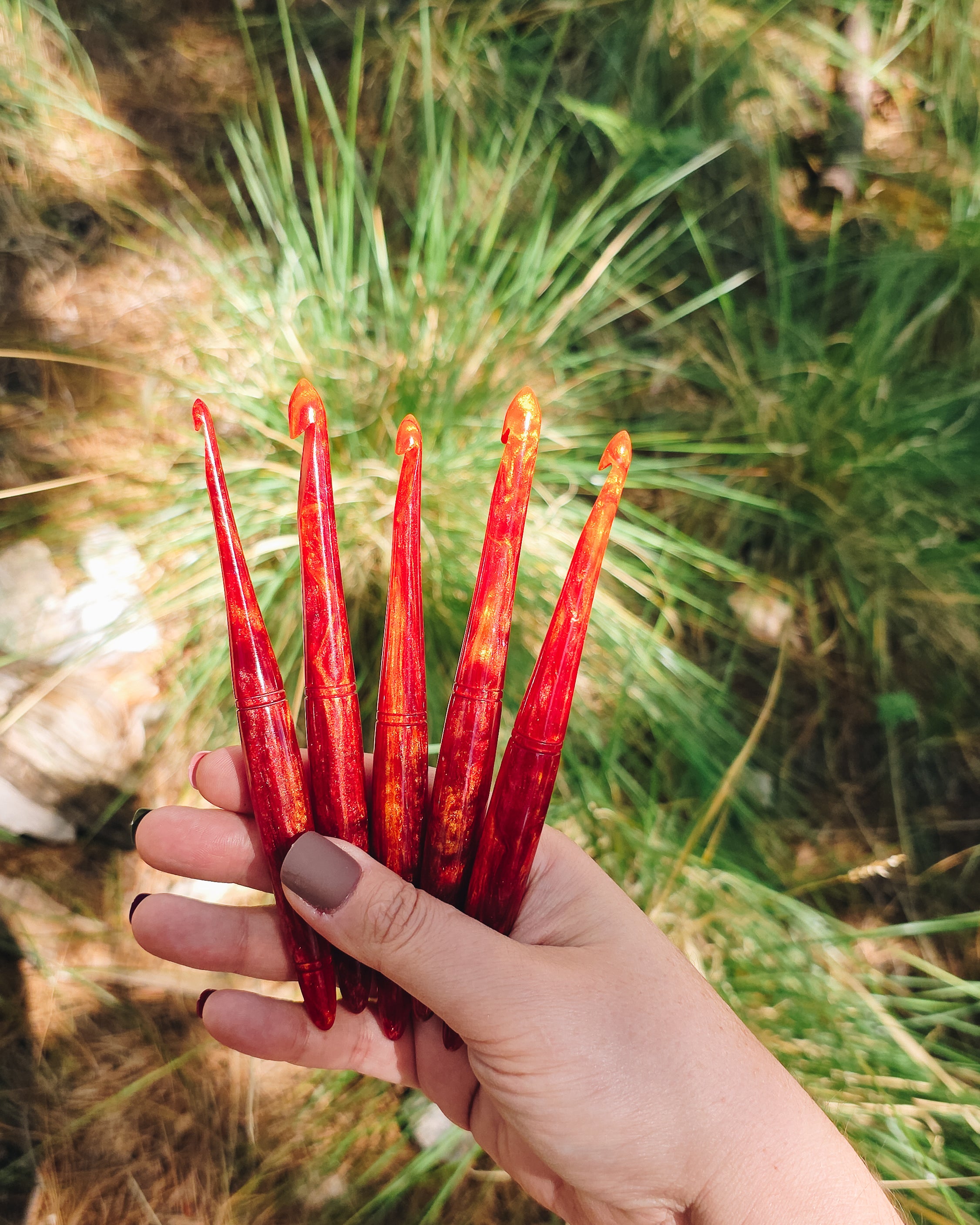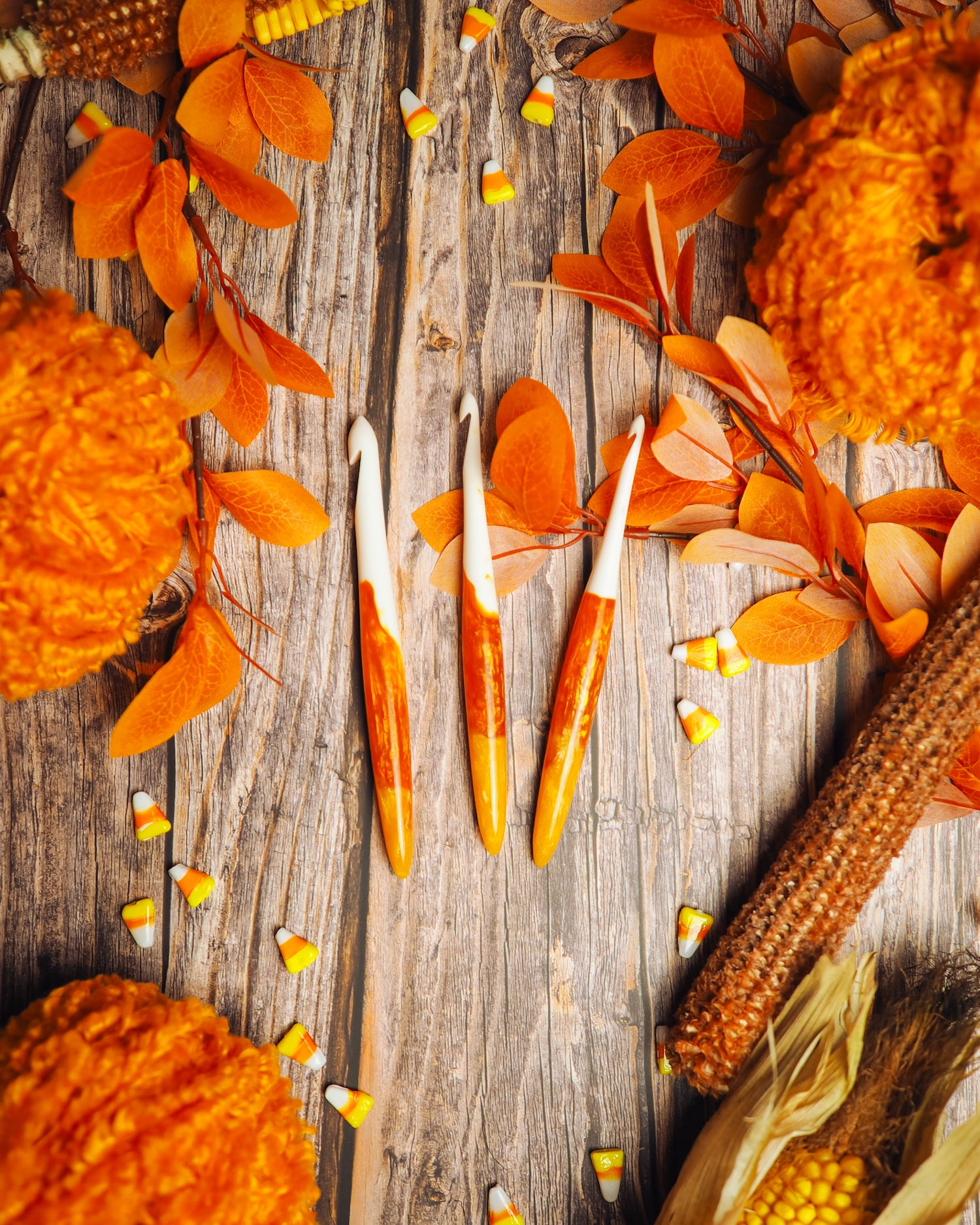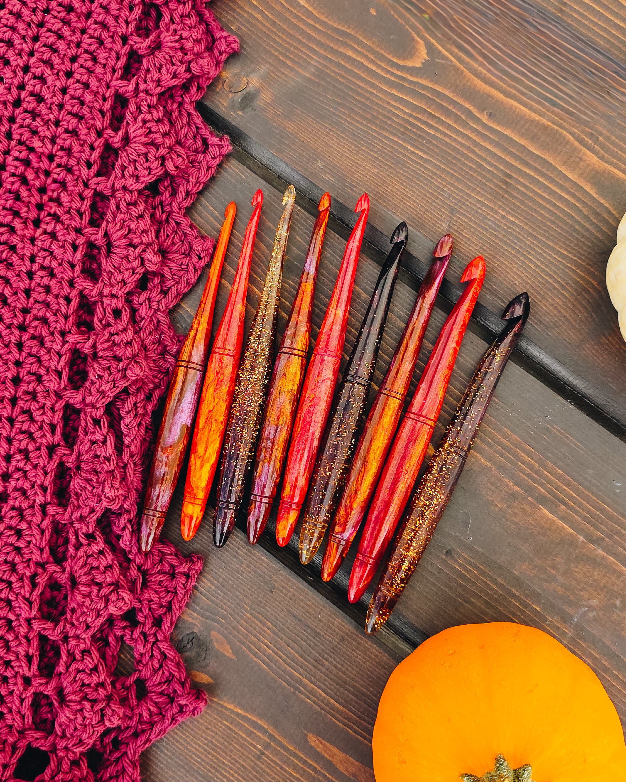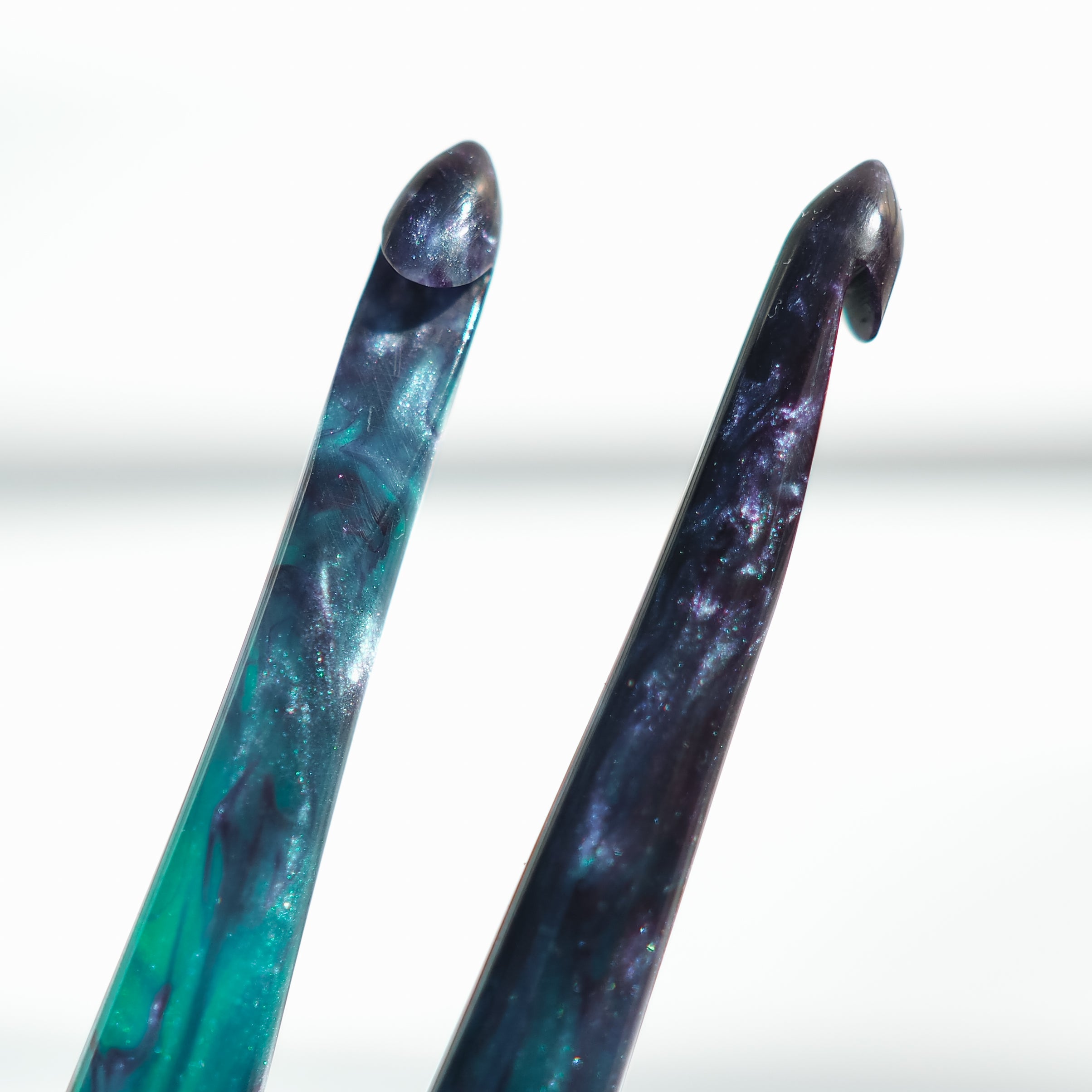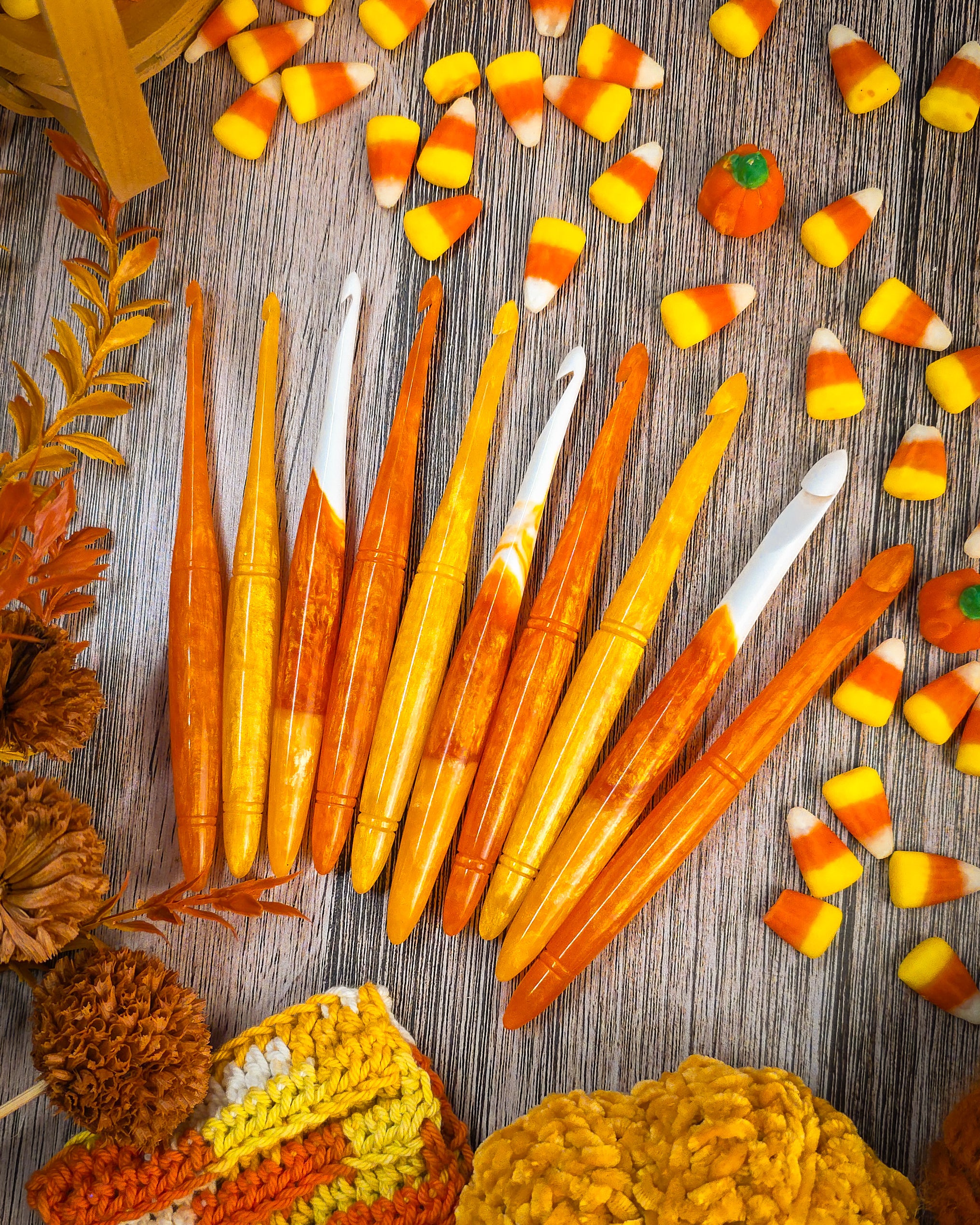 Each crochet hook is hand poured and carved one by one. Each color is hand spiraled which means each hook is completely unique!