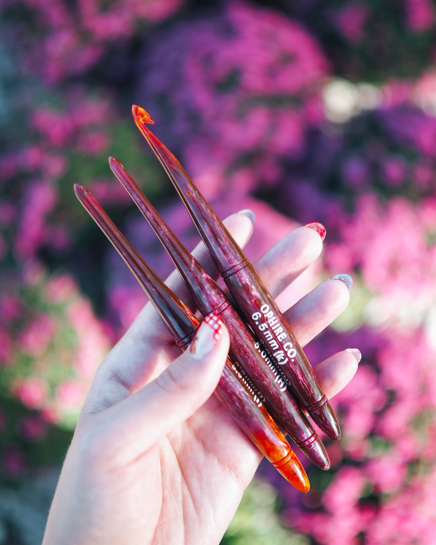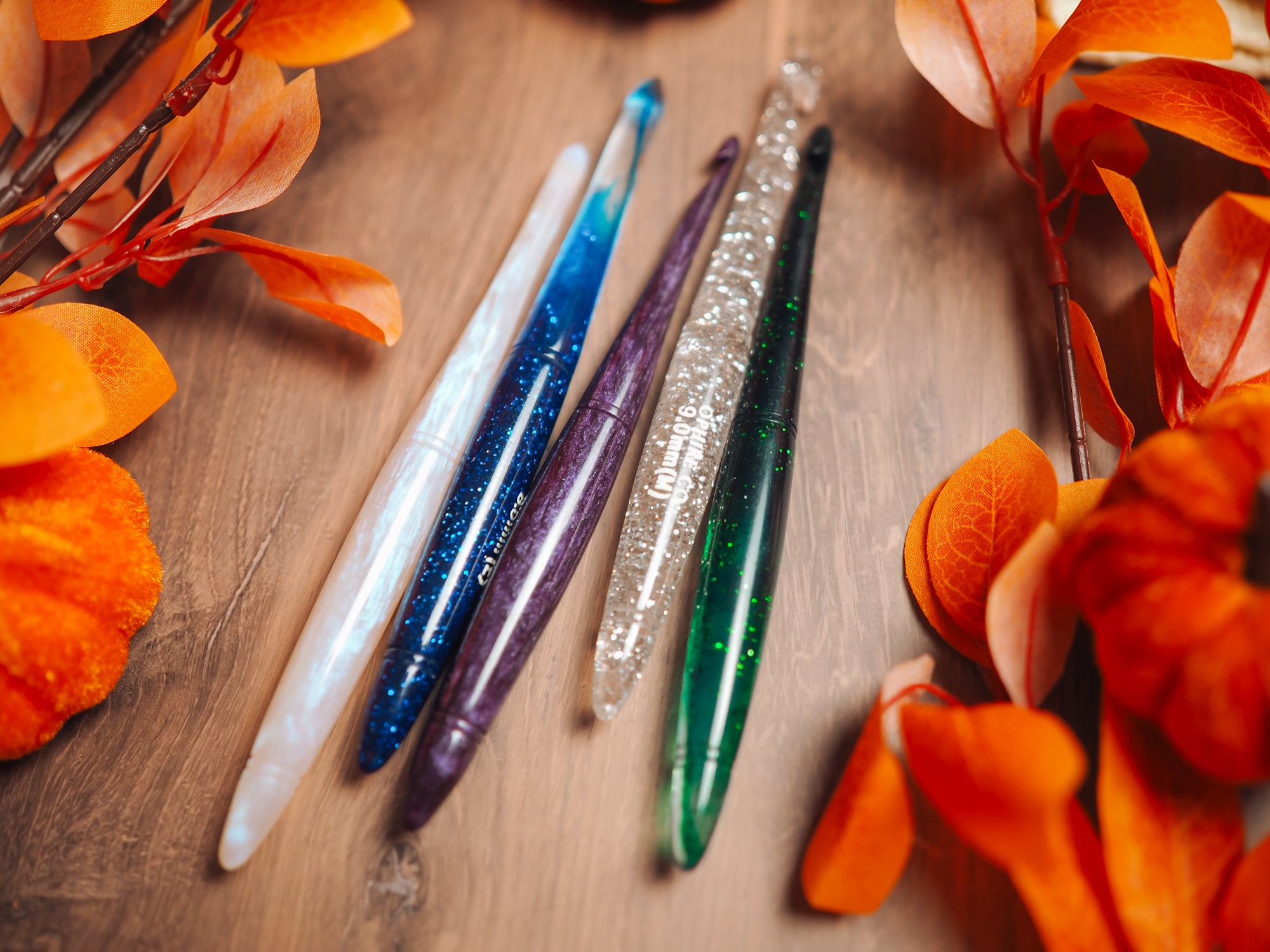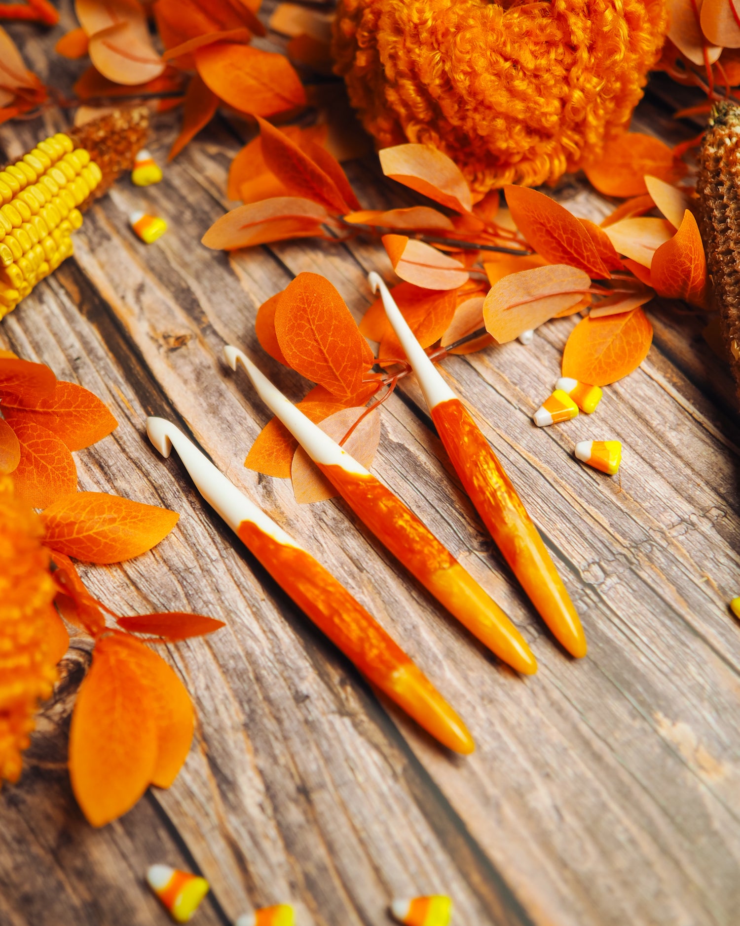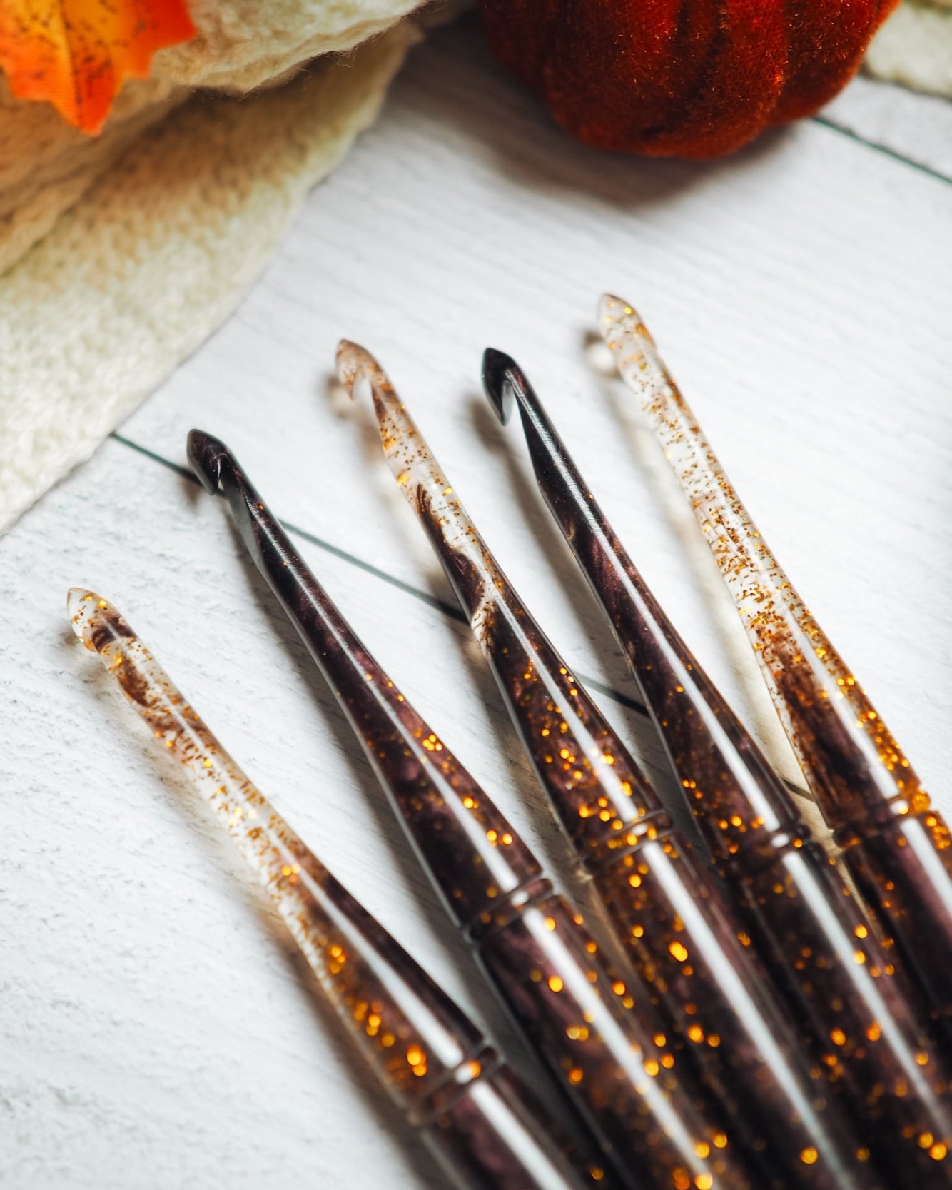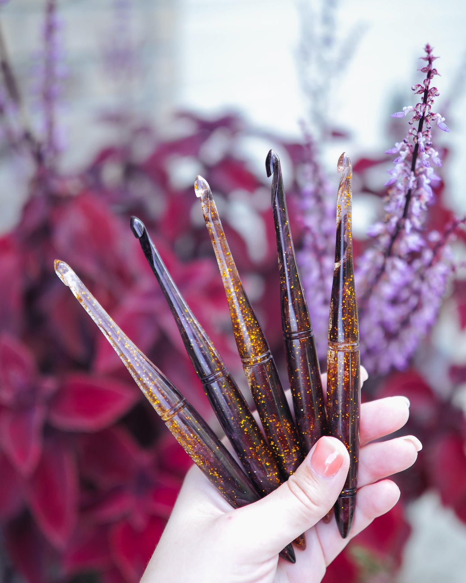 Each crochet hook is hand poured and carved one by one. Each color is hand spiraled which means each hook is completely unique!