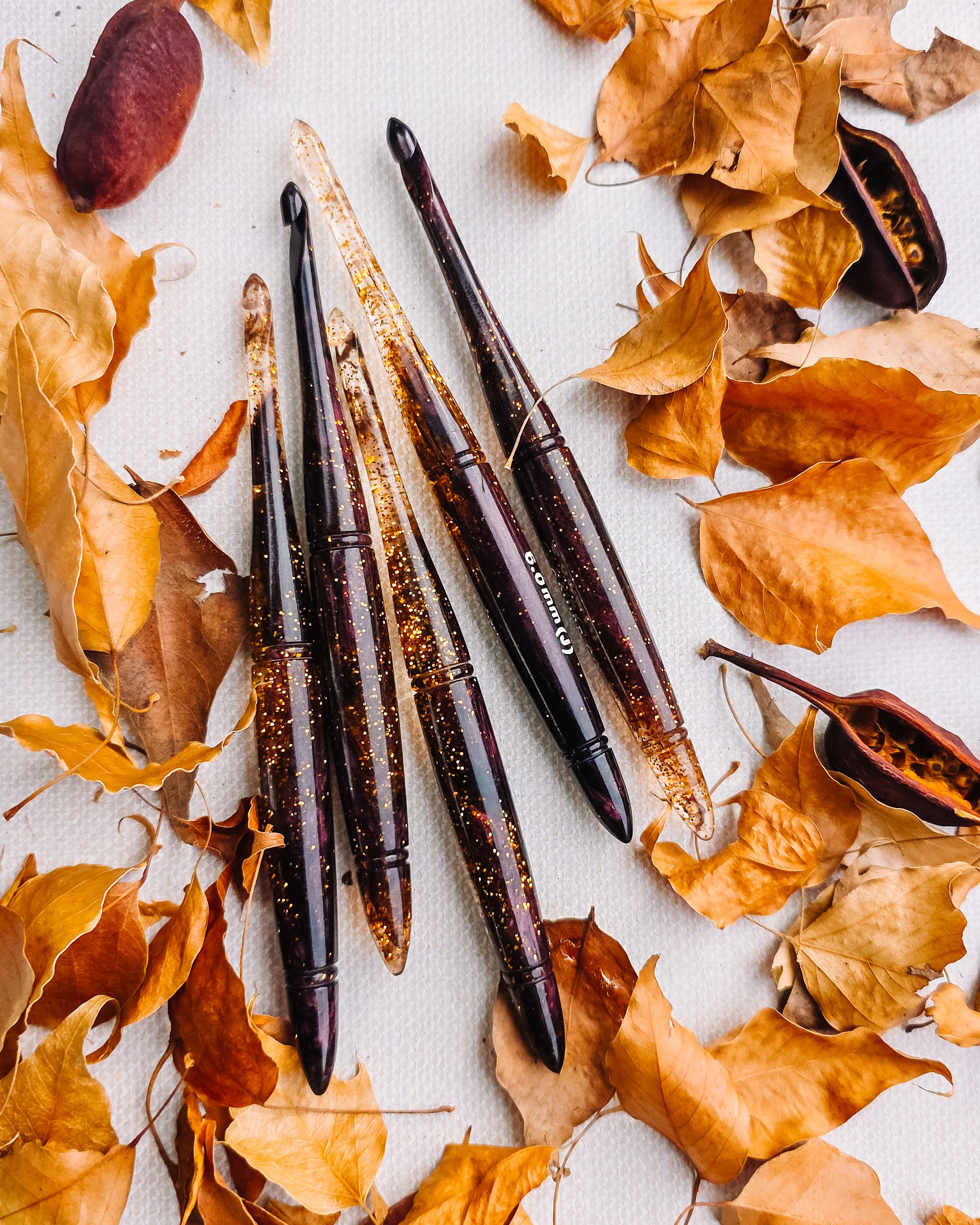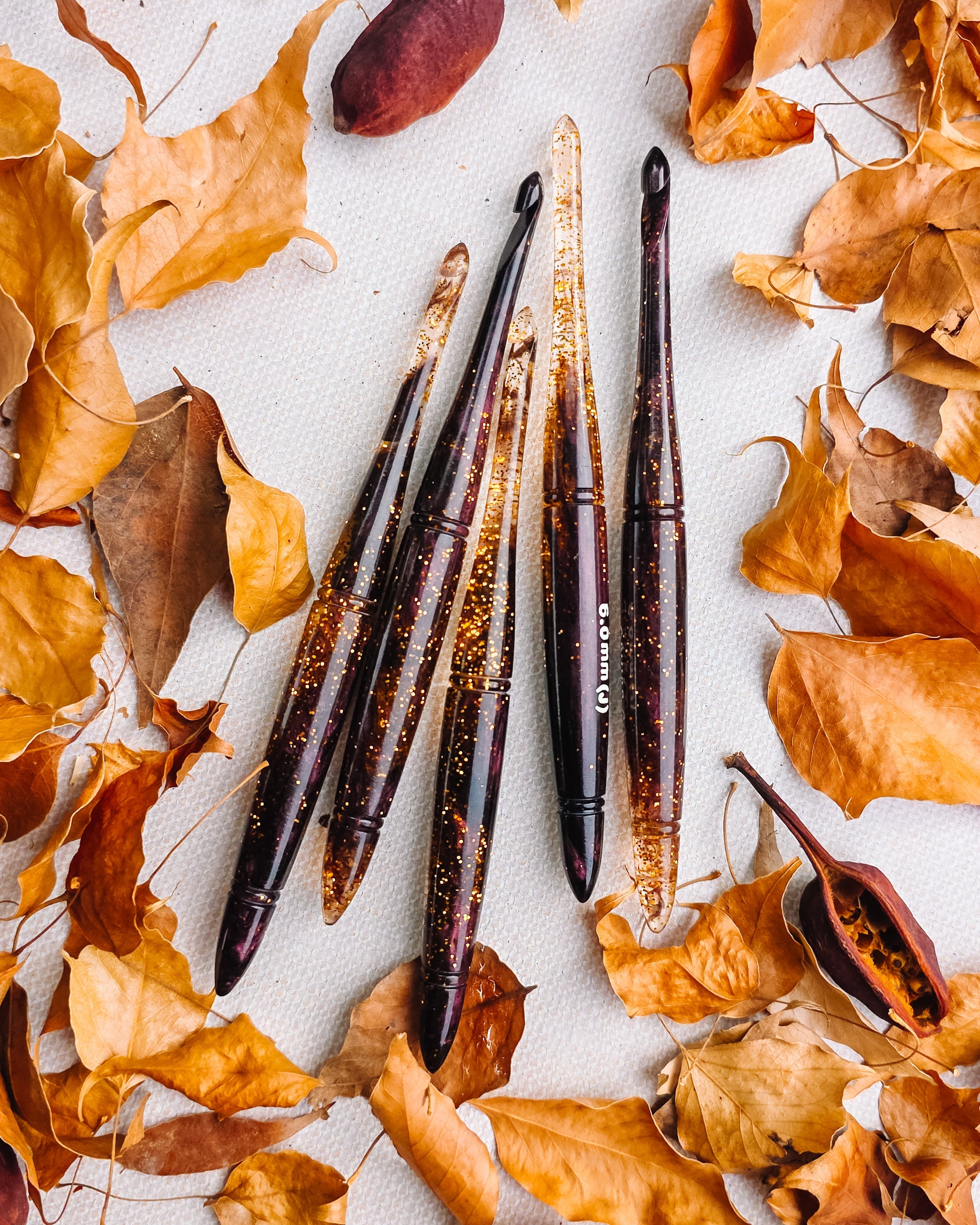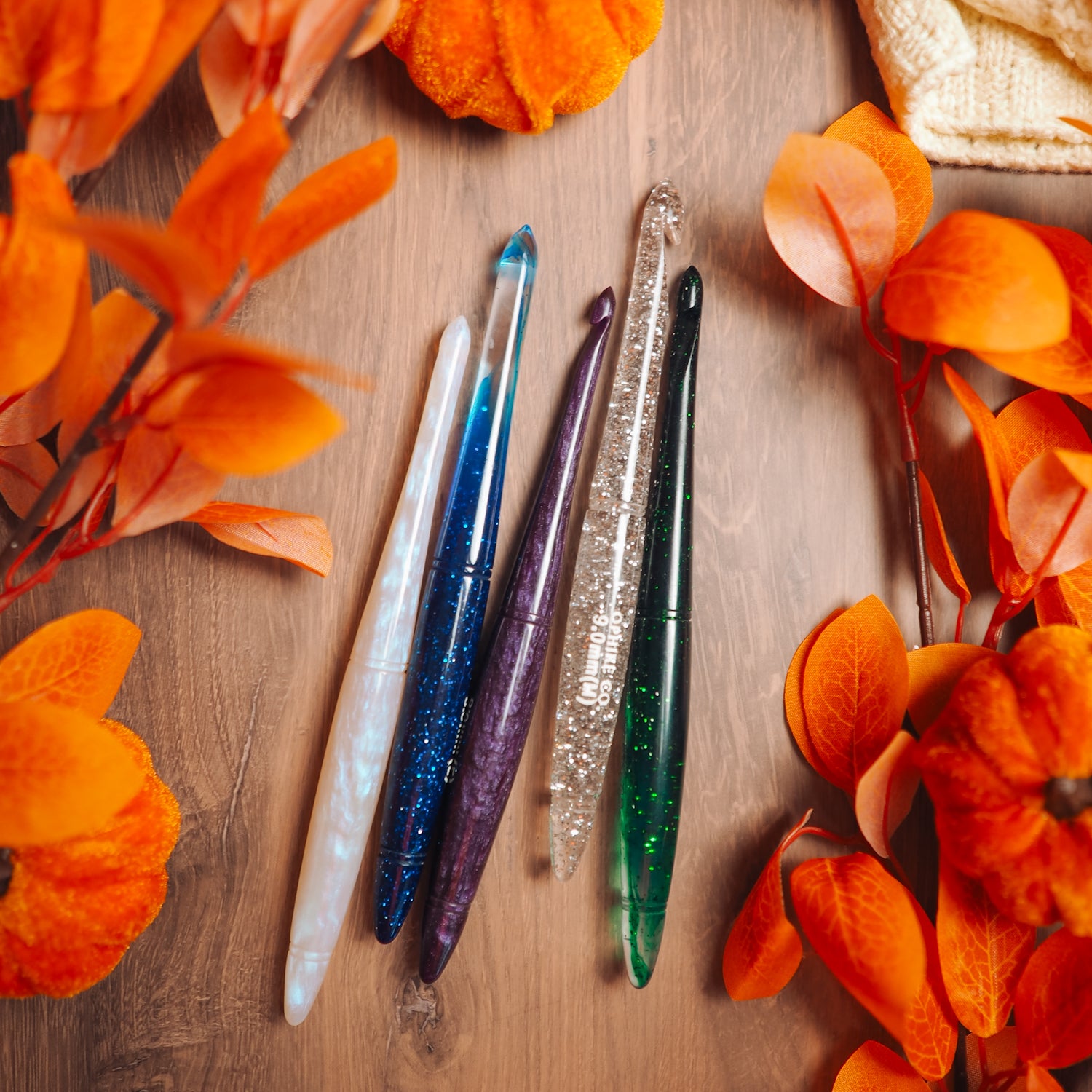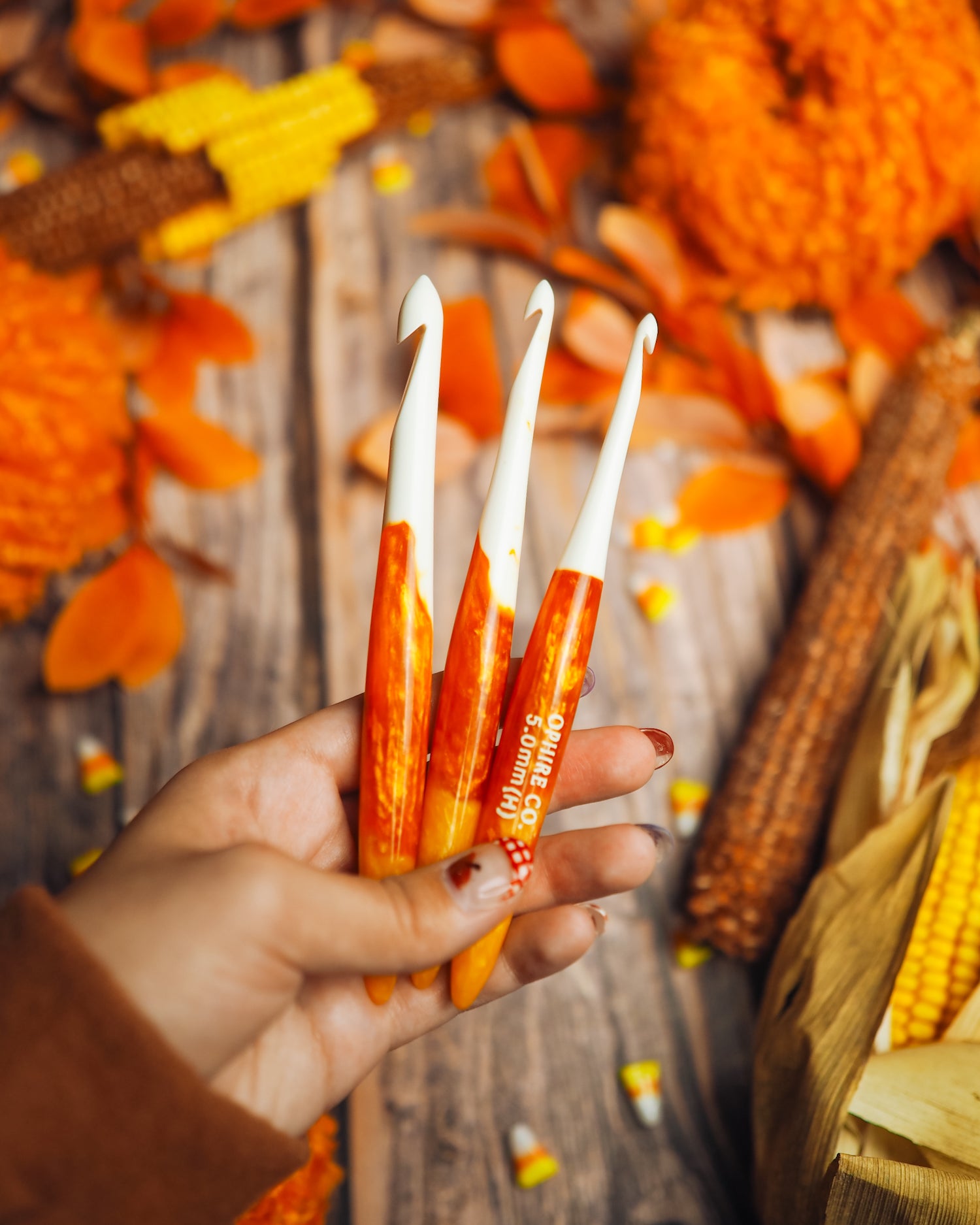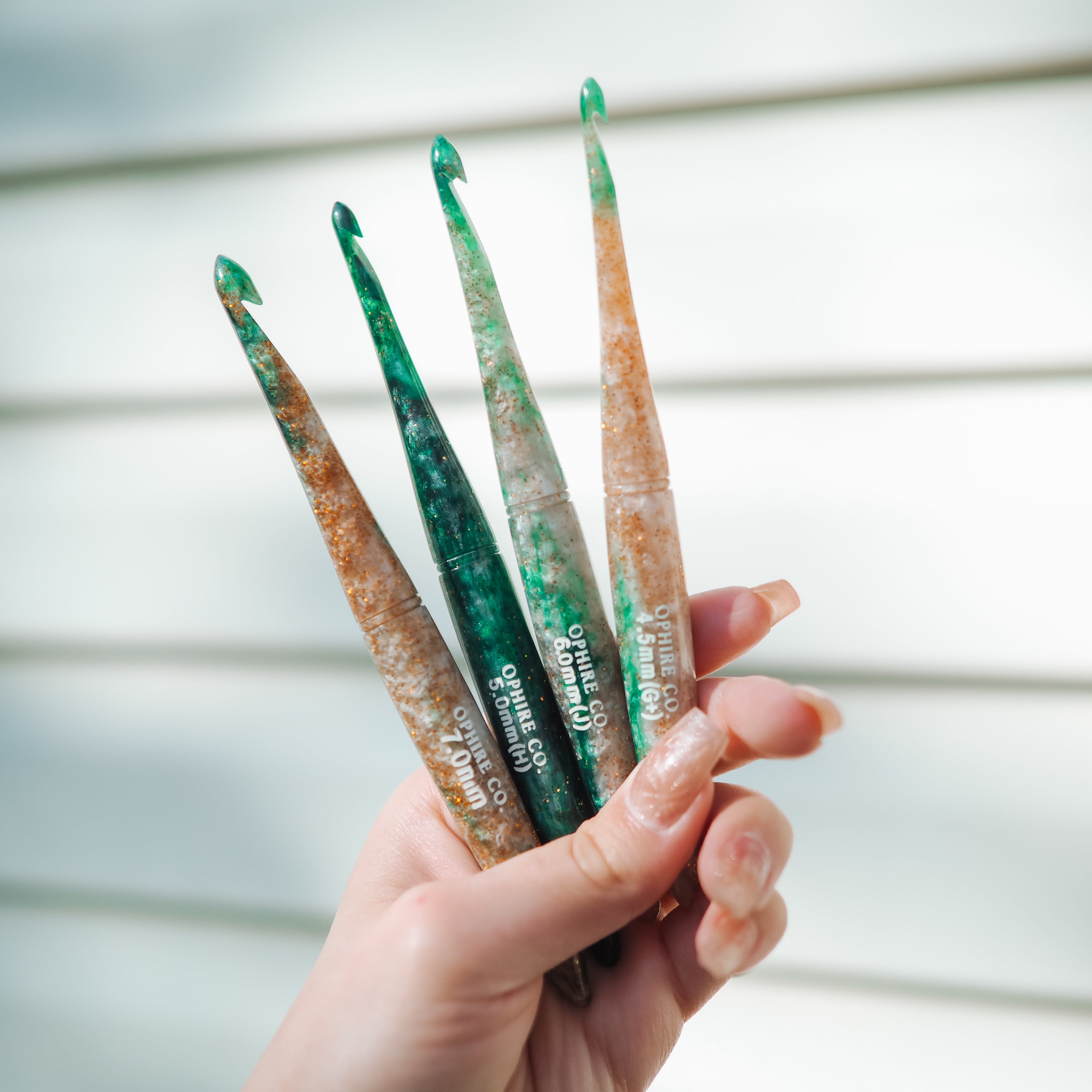 Each crochet hook is hand poured and carved one by one. Each color is hand spiraled which means each hook is completely unique!
