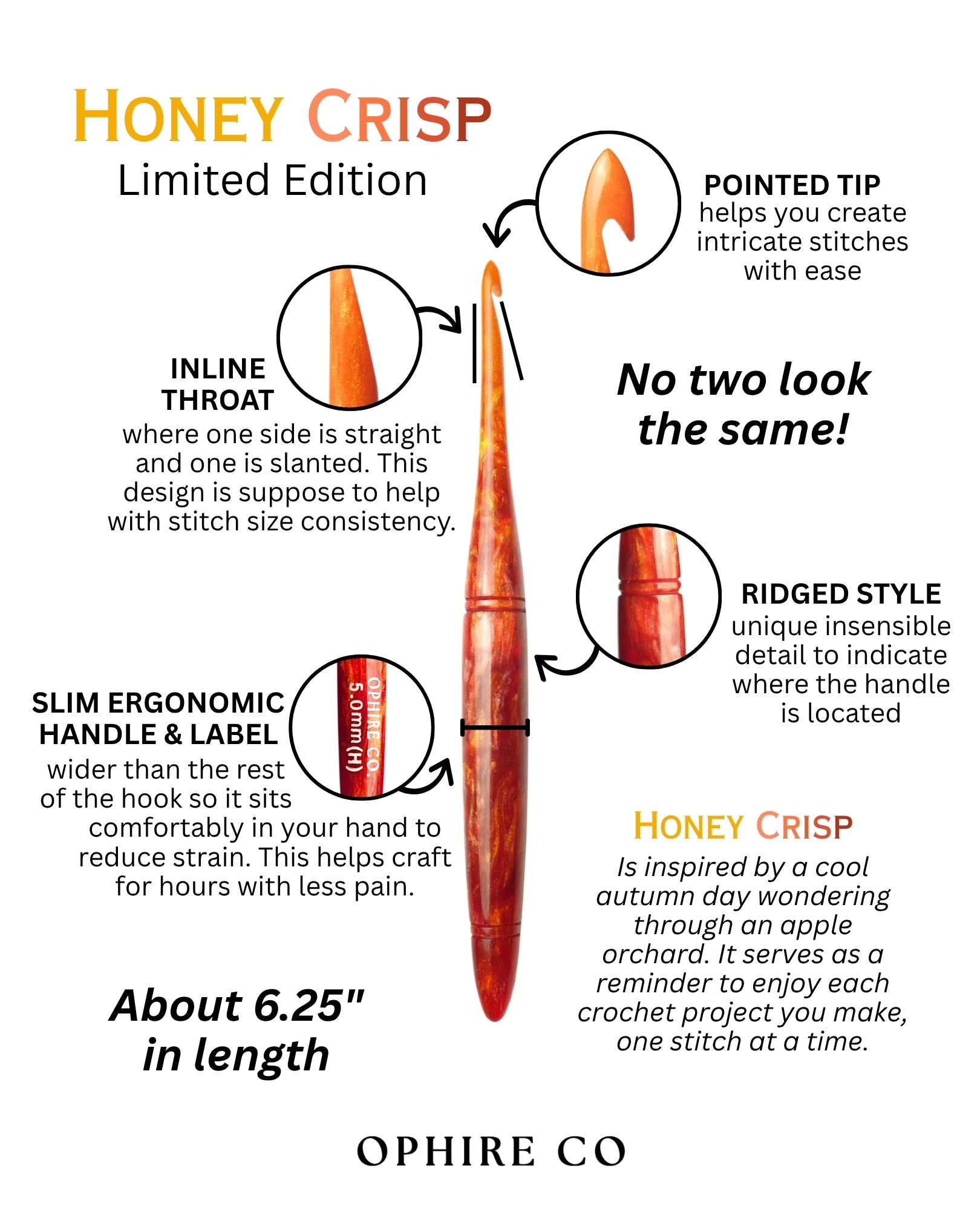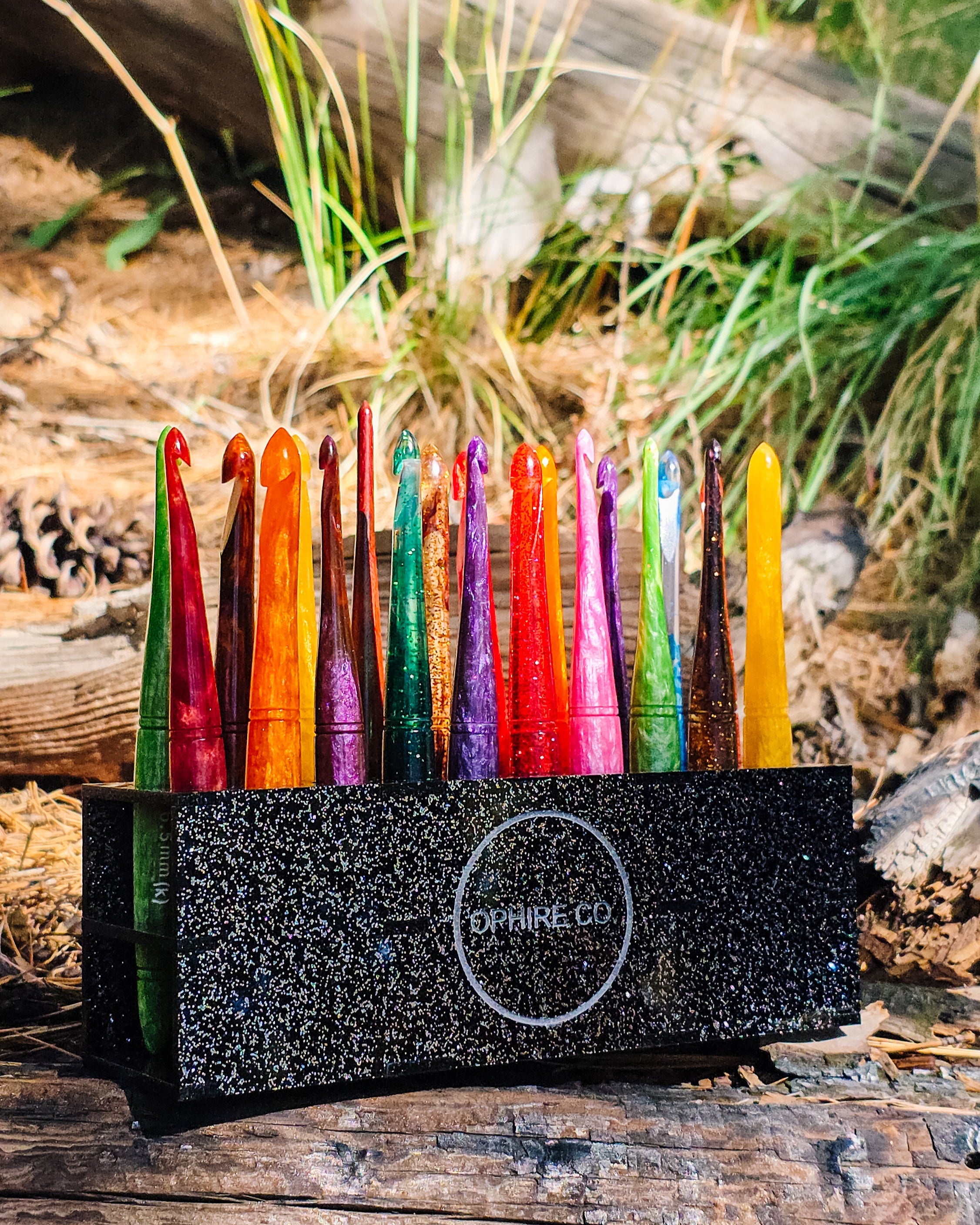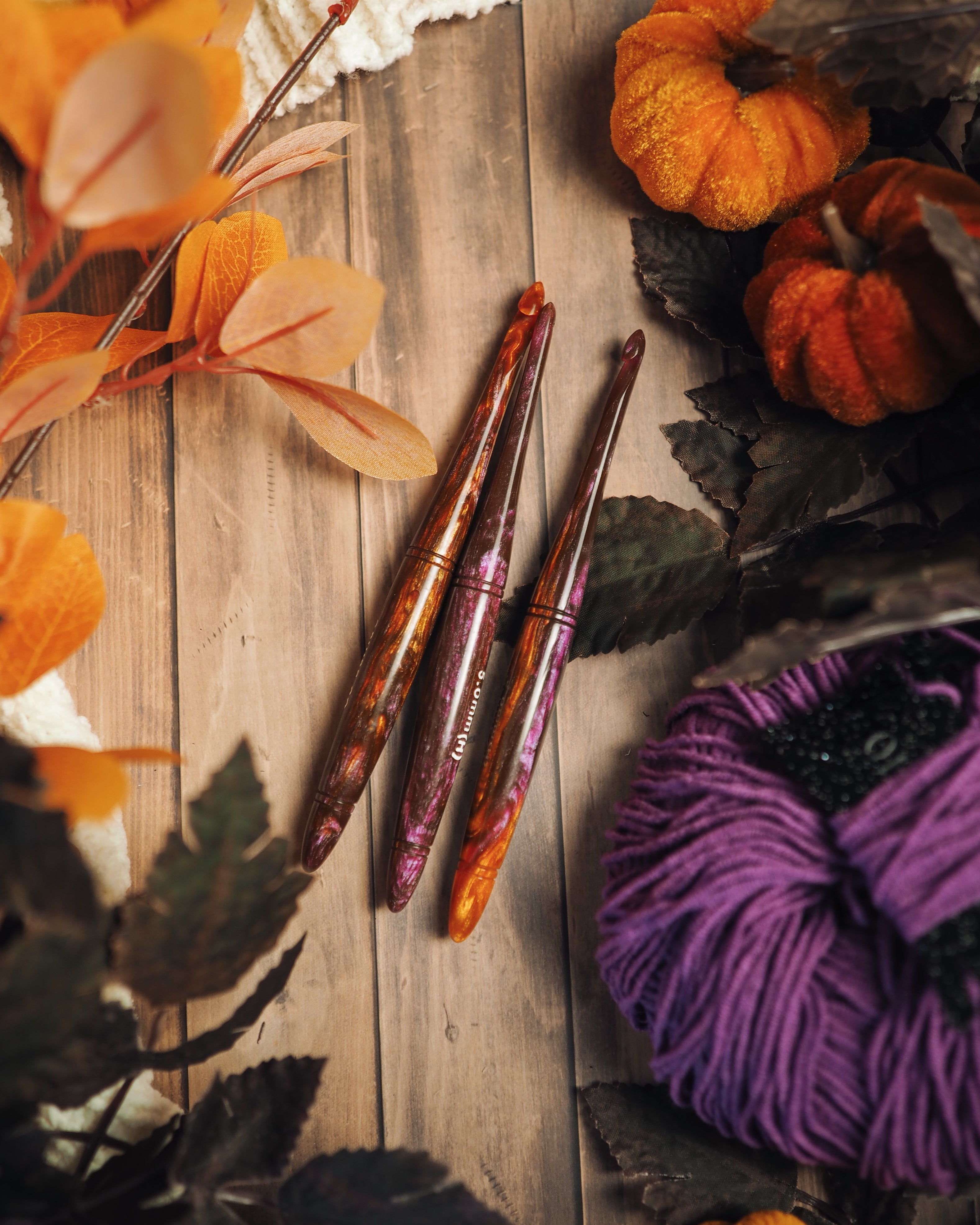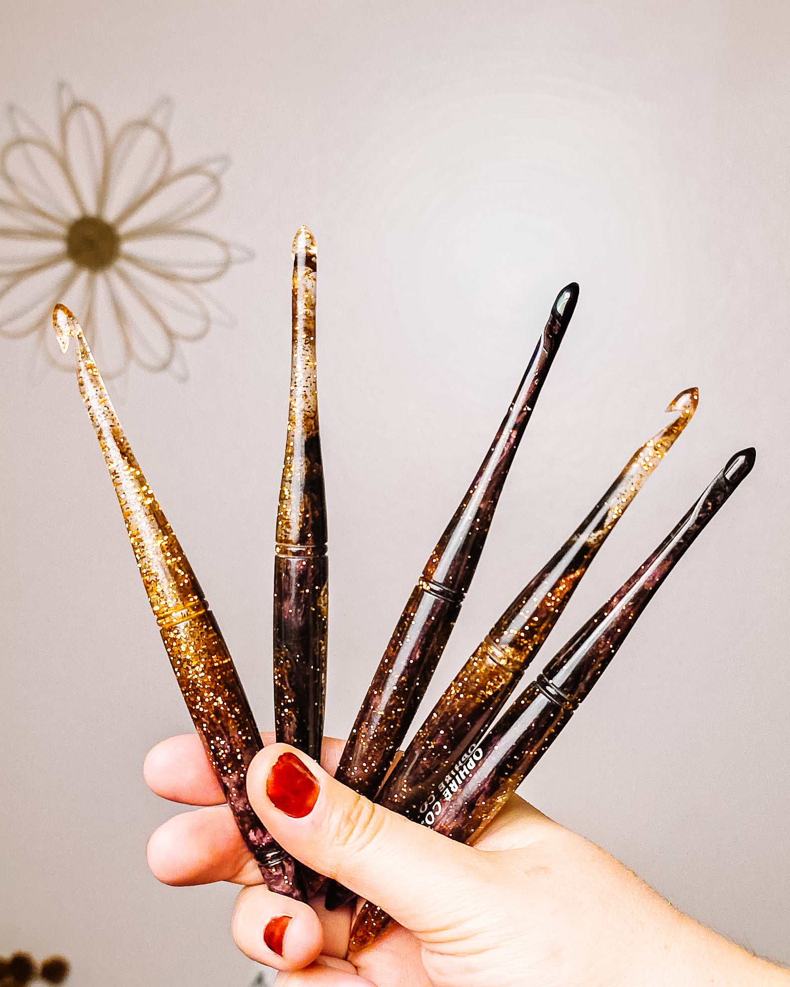 Each crochet hook is hand poured and carved one by one. Each color is hand spiraled which means each hook is completely unique!