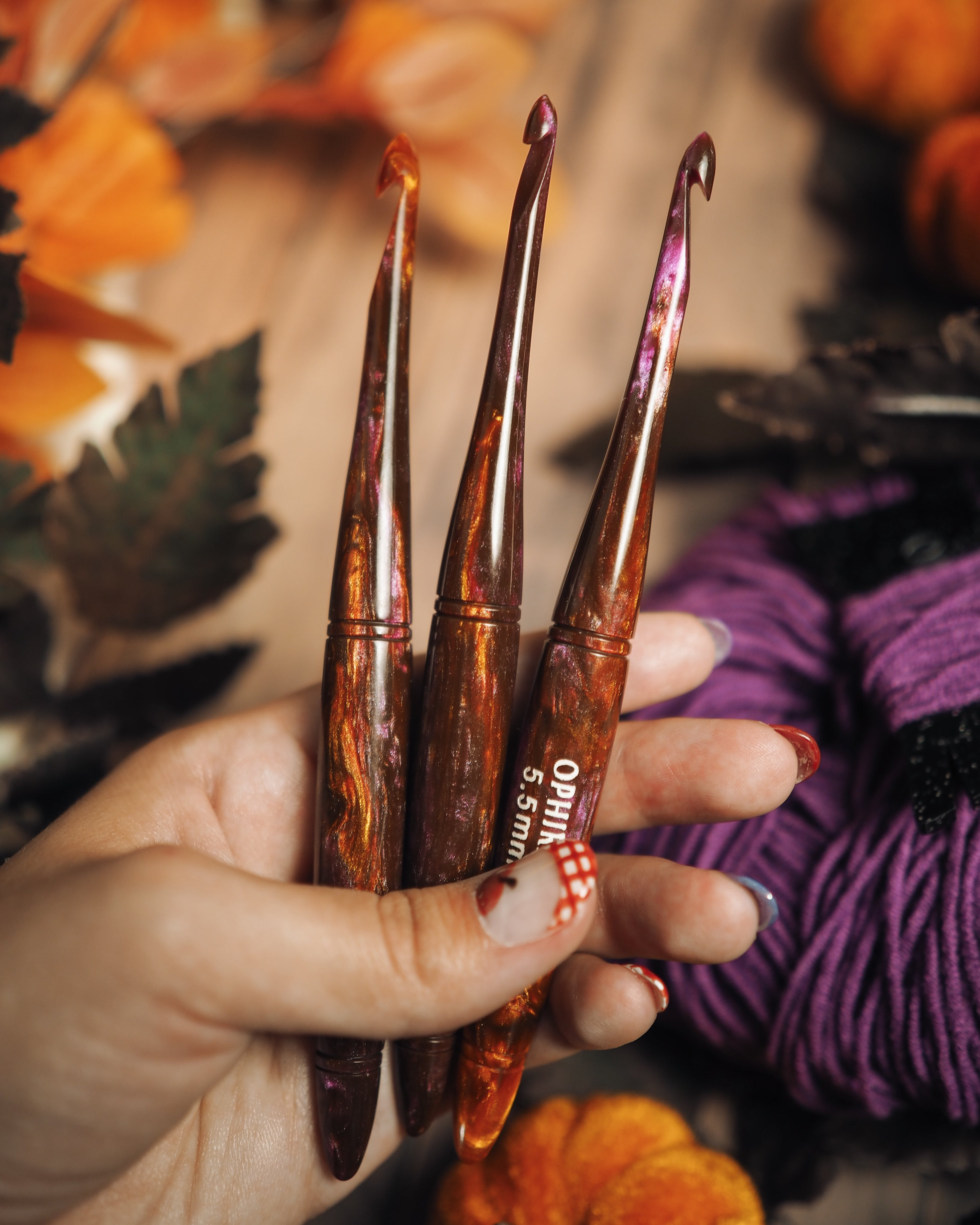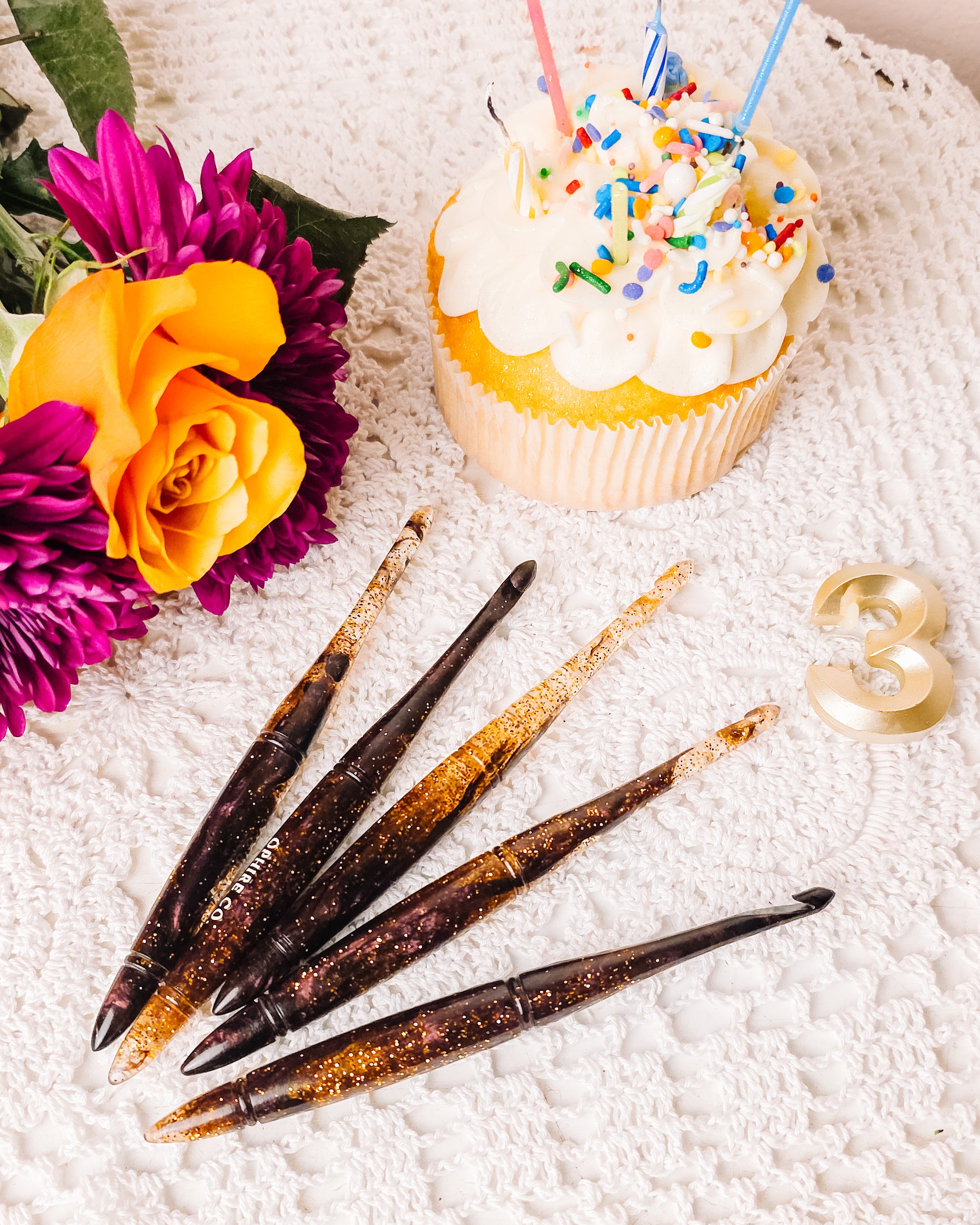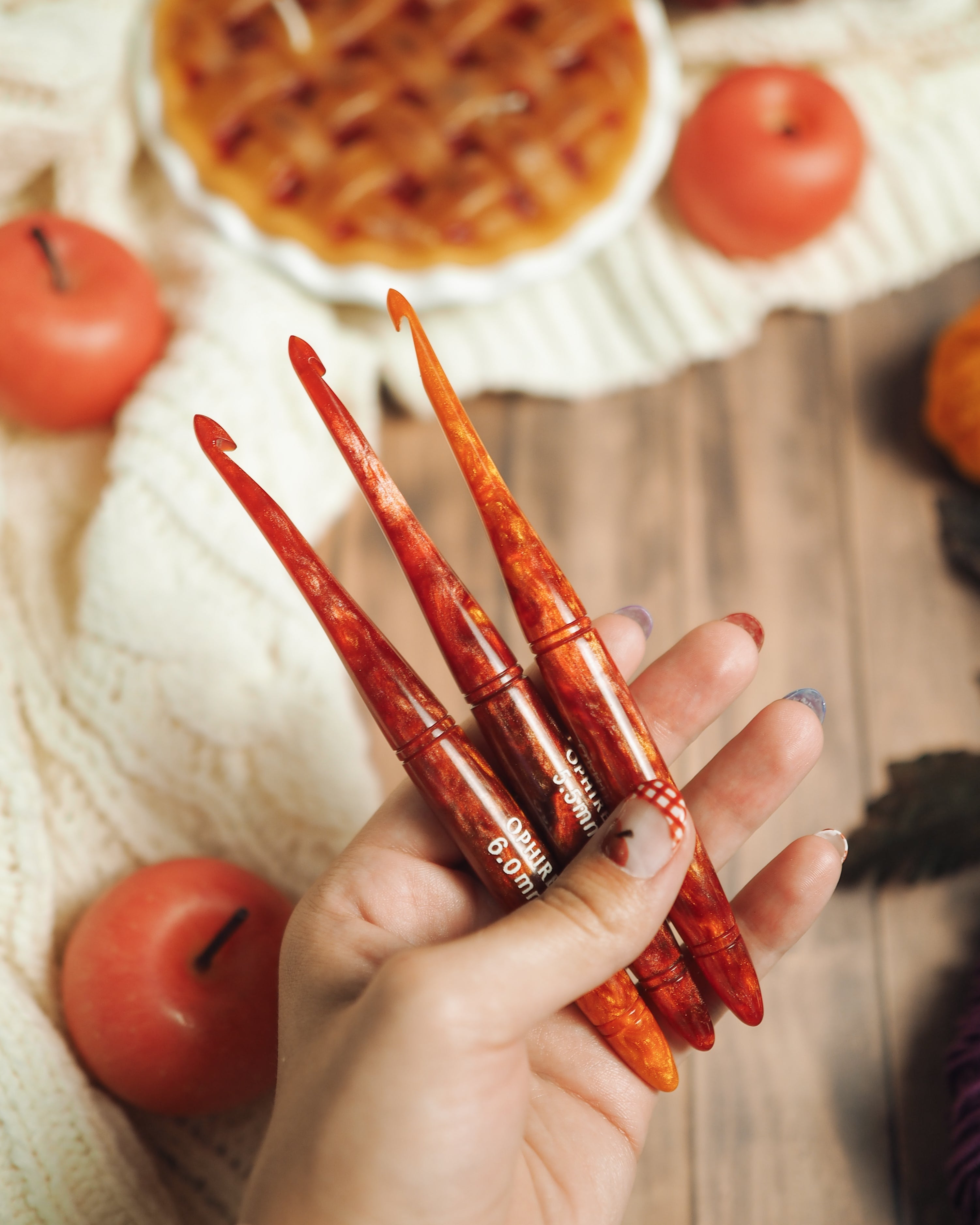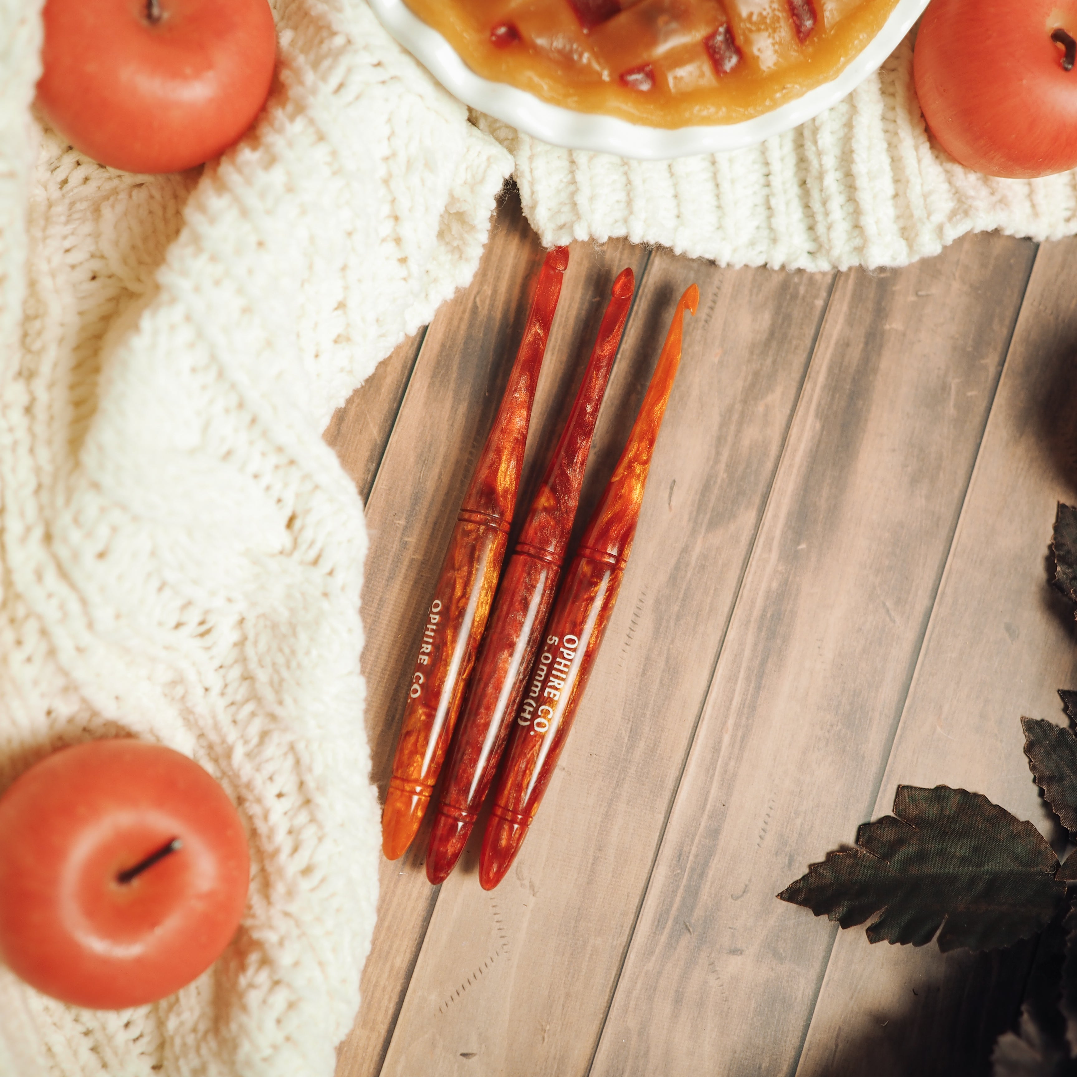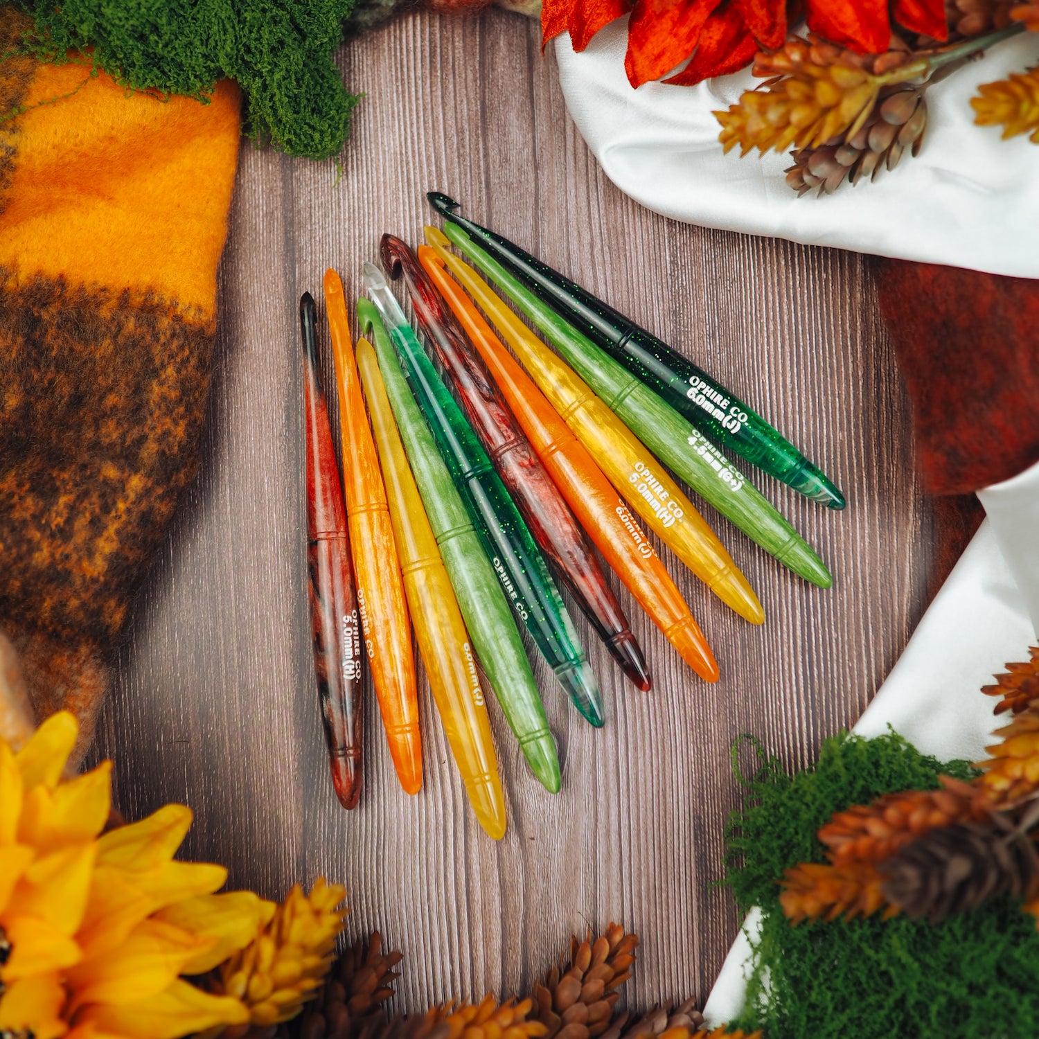 Each crochet hook is hand poured and carved one by one. Each color is hand spiraled which means each hook is completely unique!
