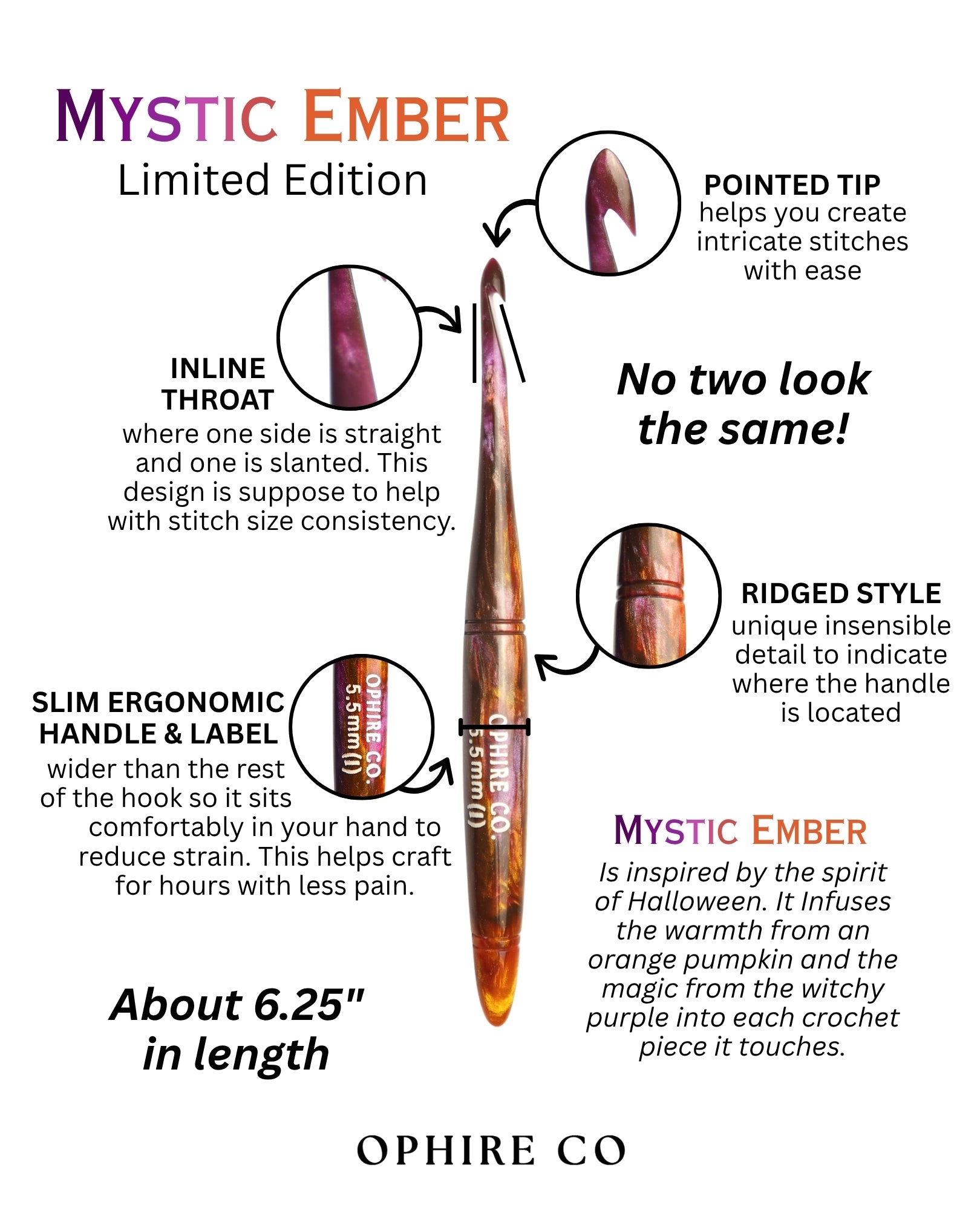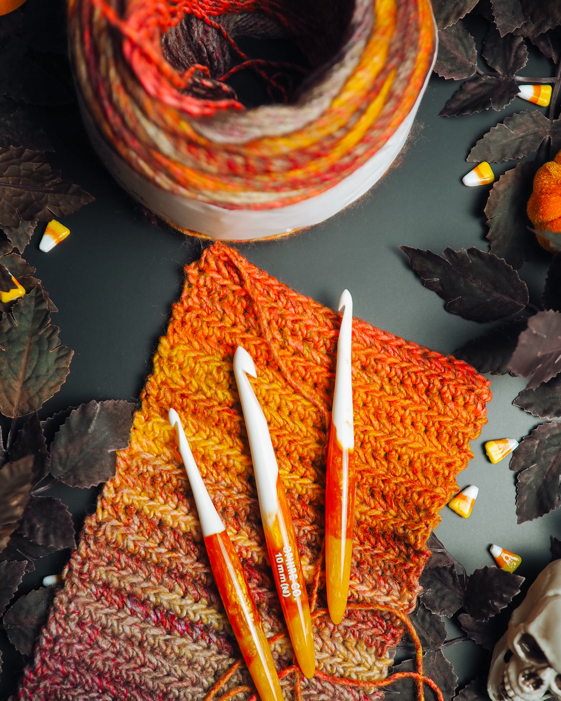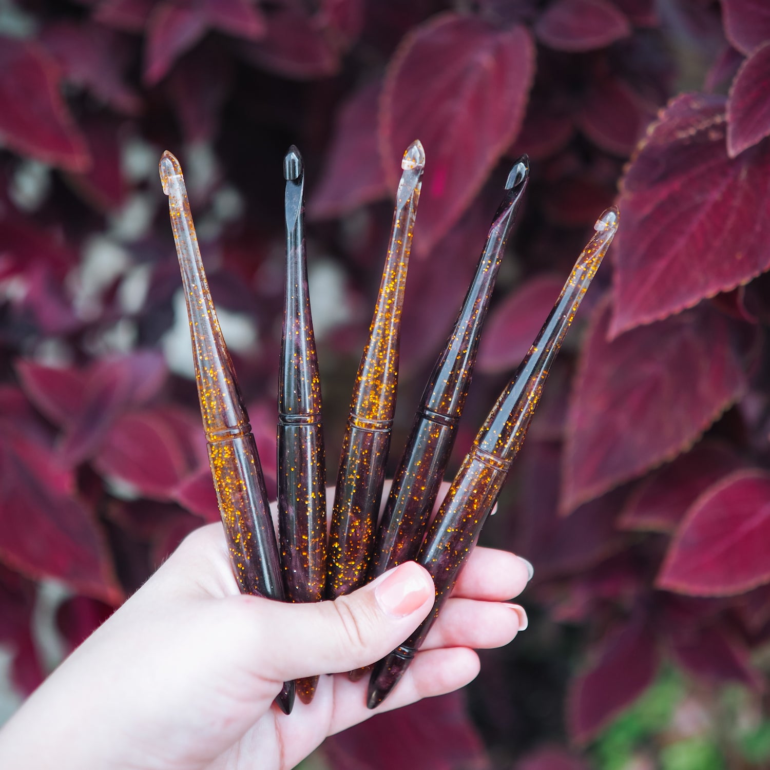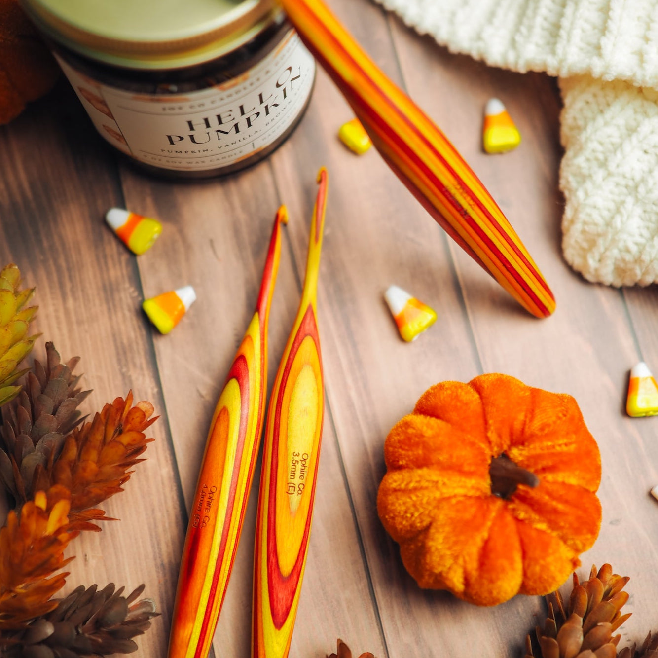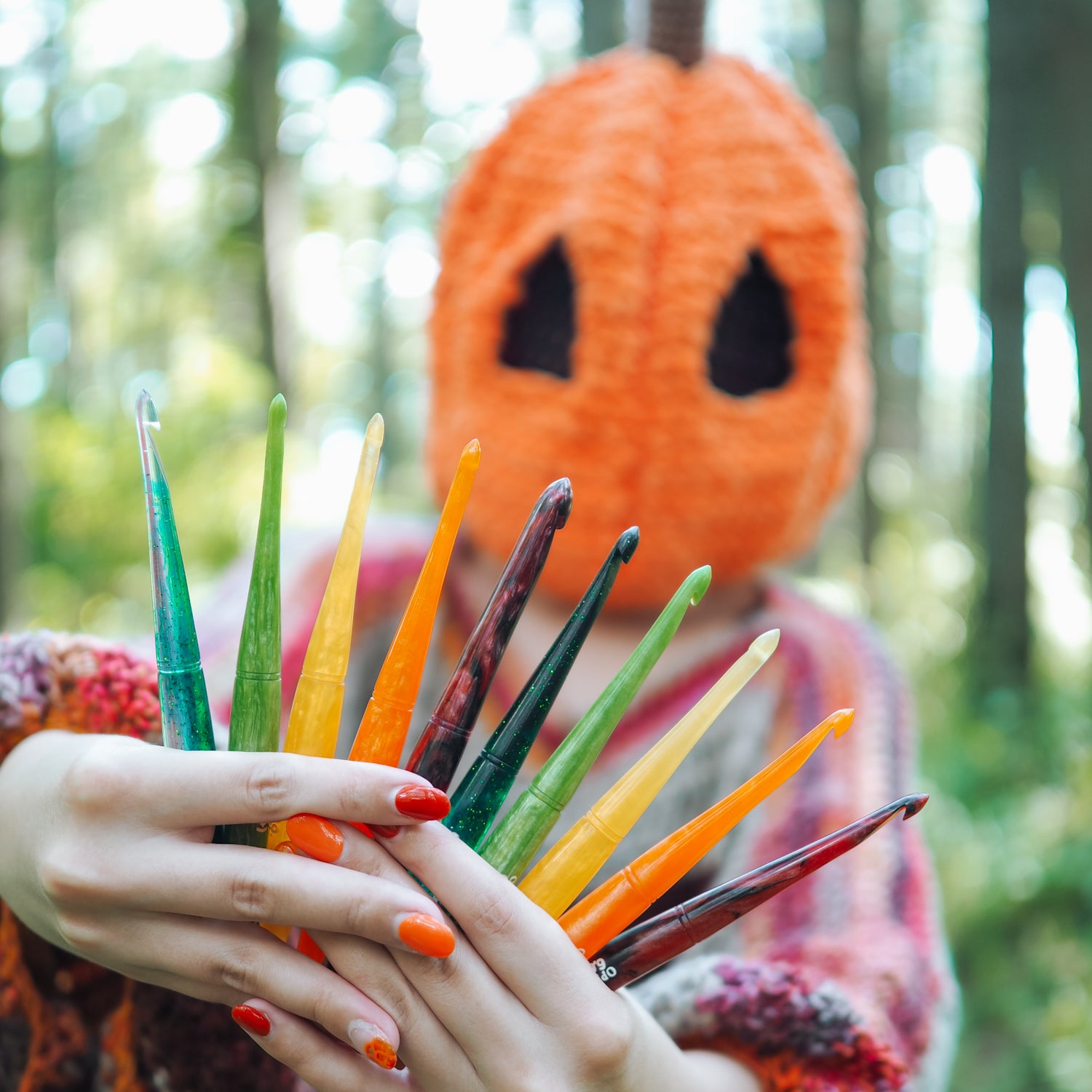 Each crochet hook is hand poured and carved one by one. Each color is hand spiraled which means each hook is completely unique!