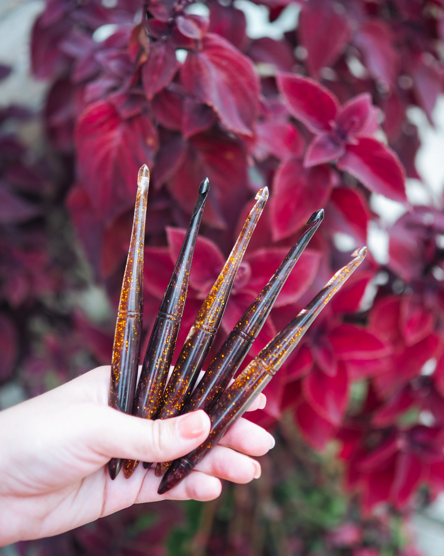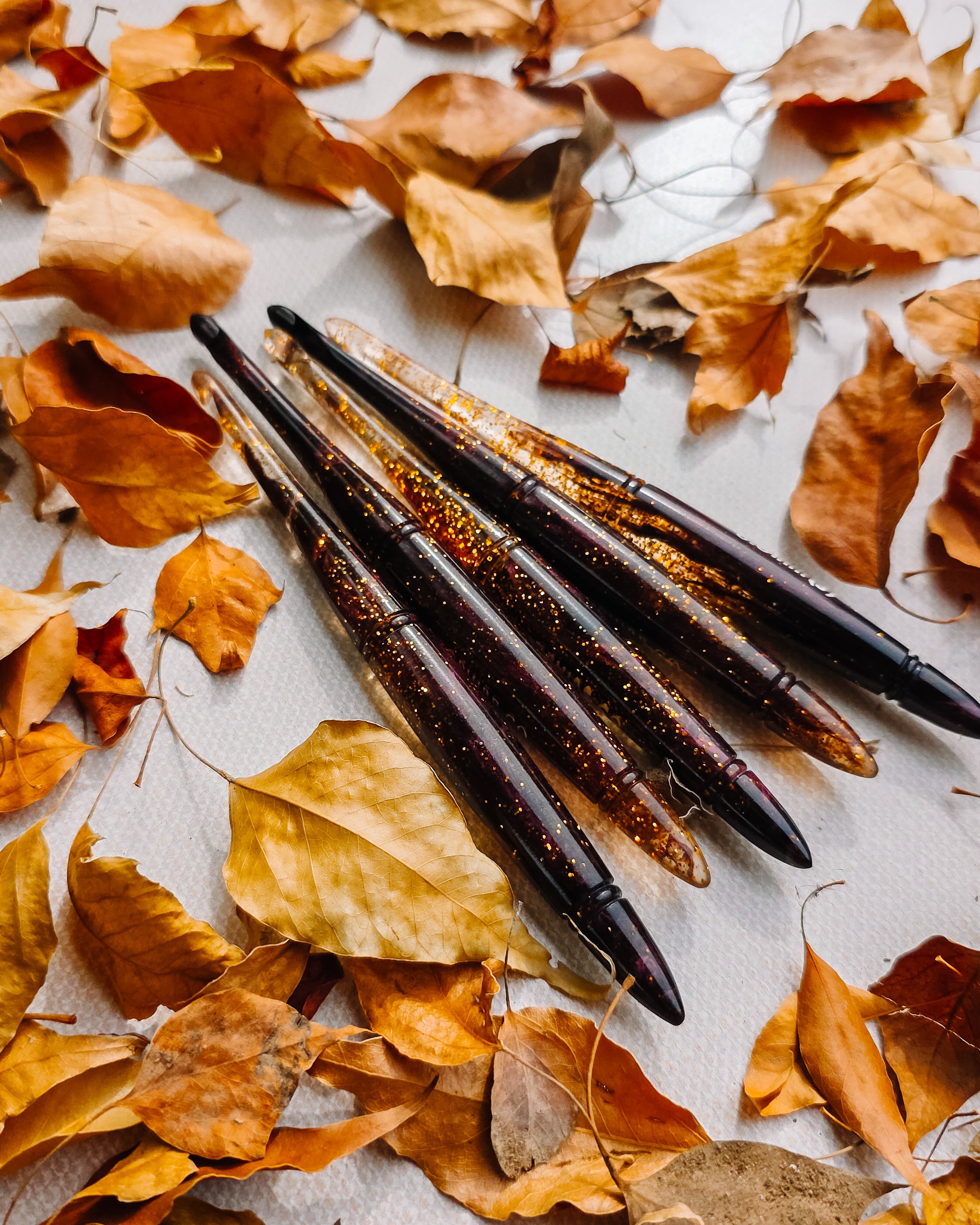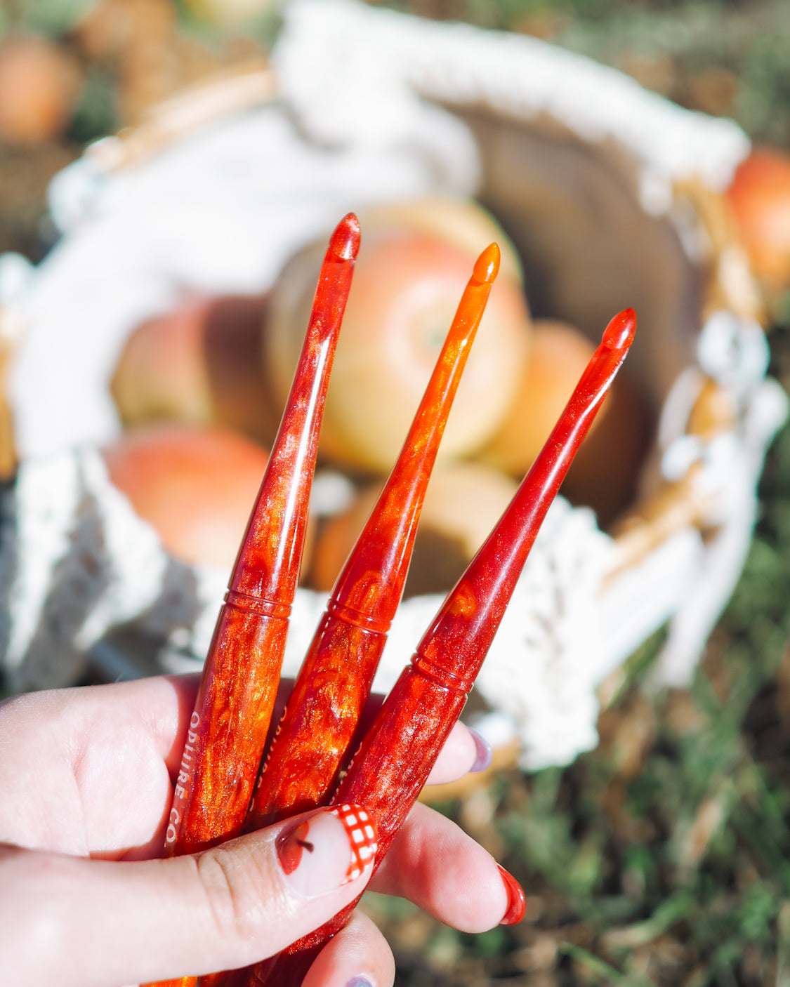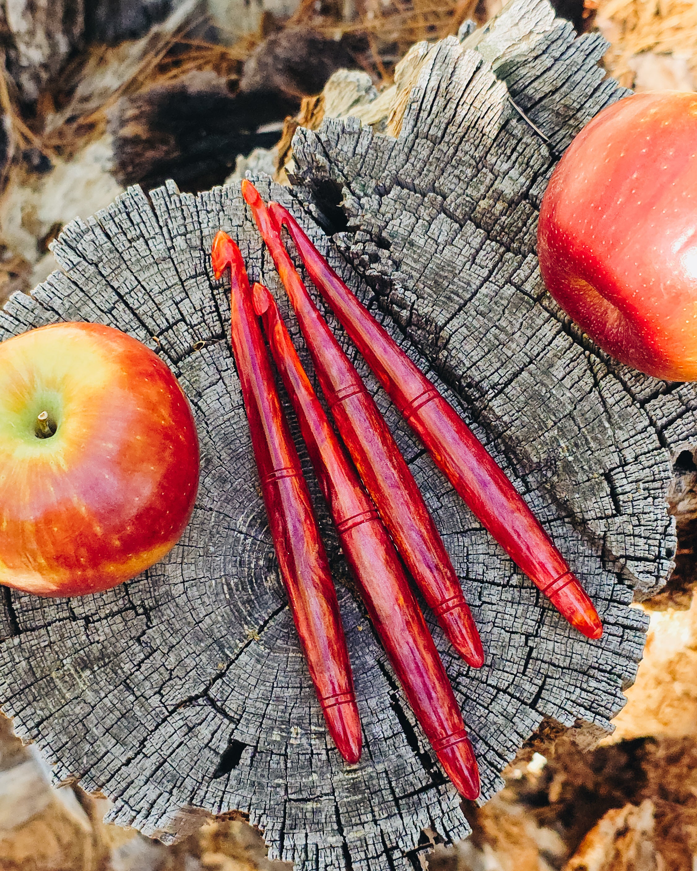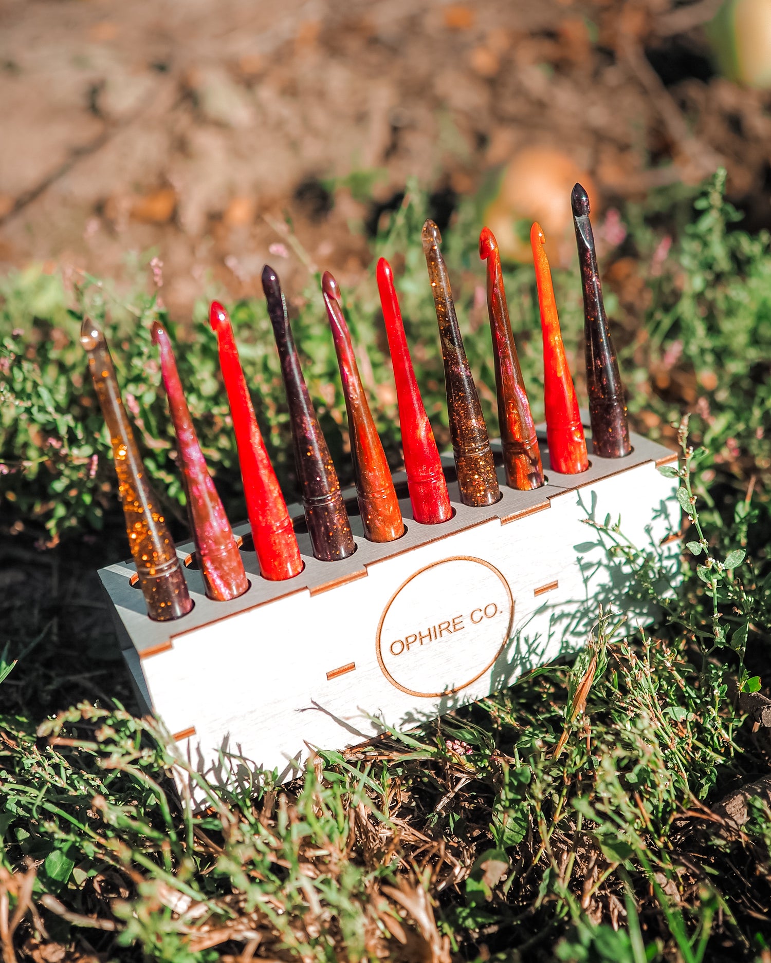 Each crochet hook is hand poured and carved one by one. Each color is hand spiraled which means each hook is completely unique!