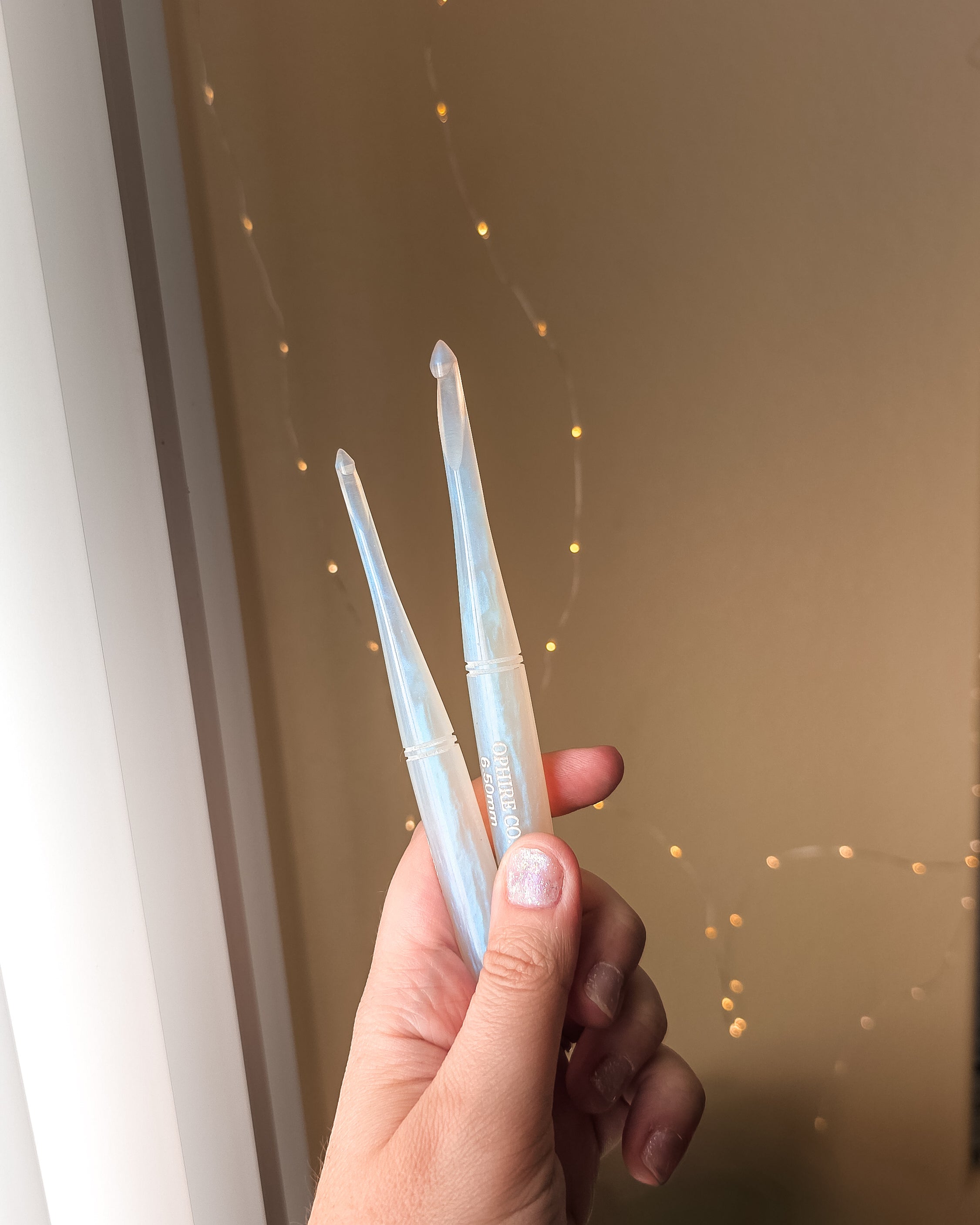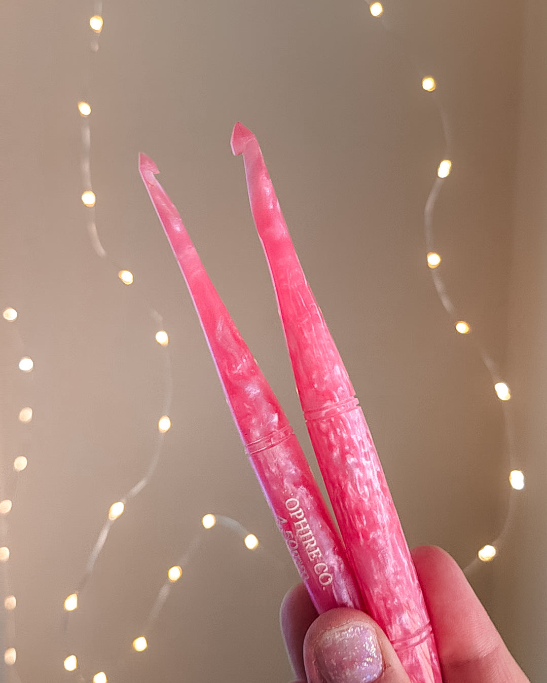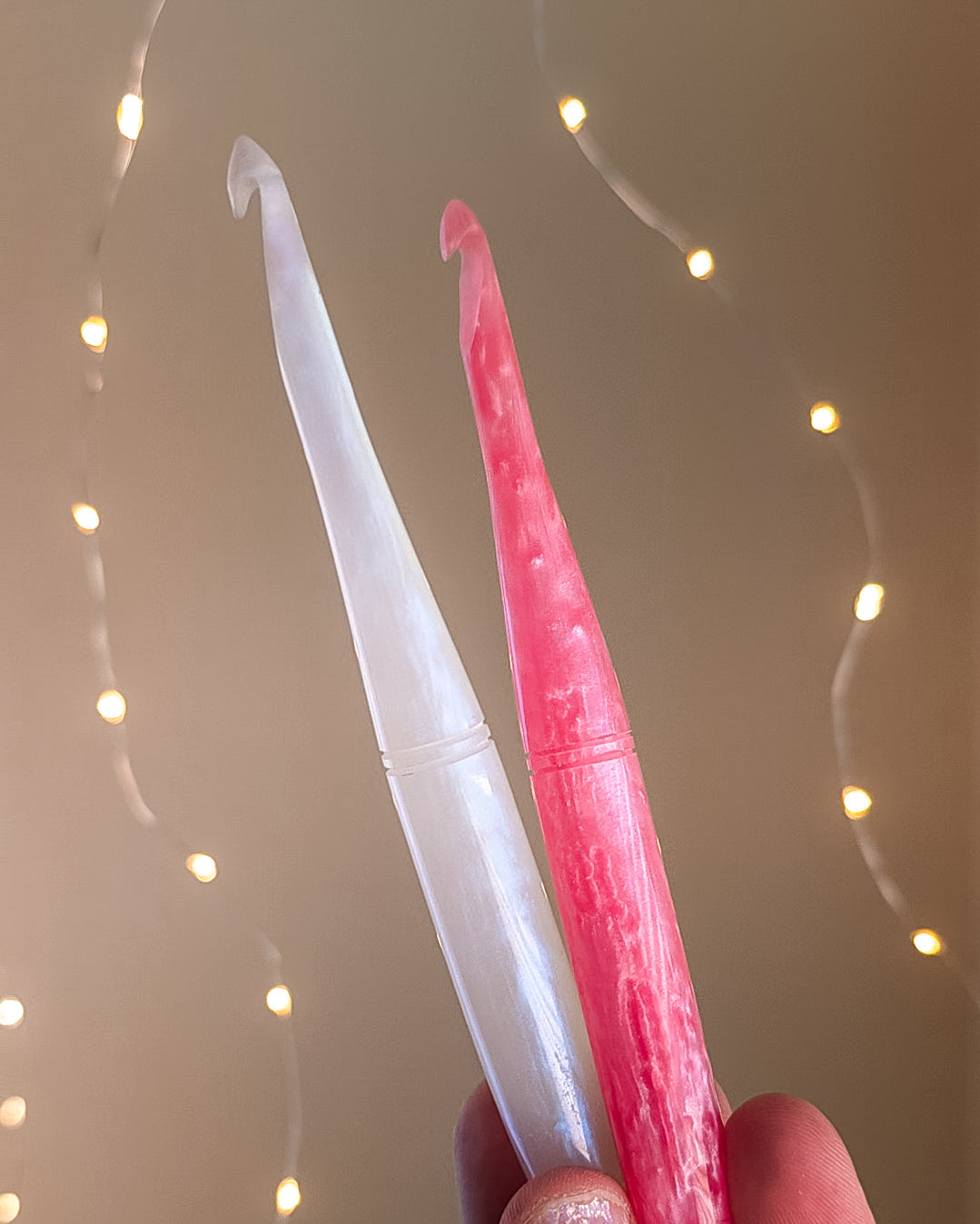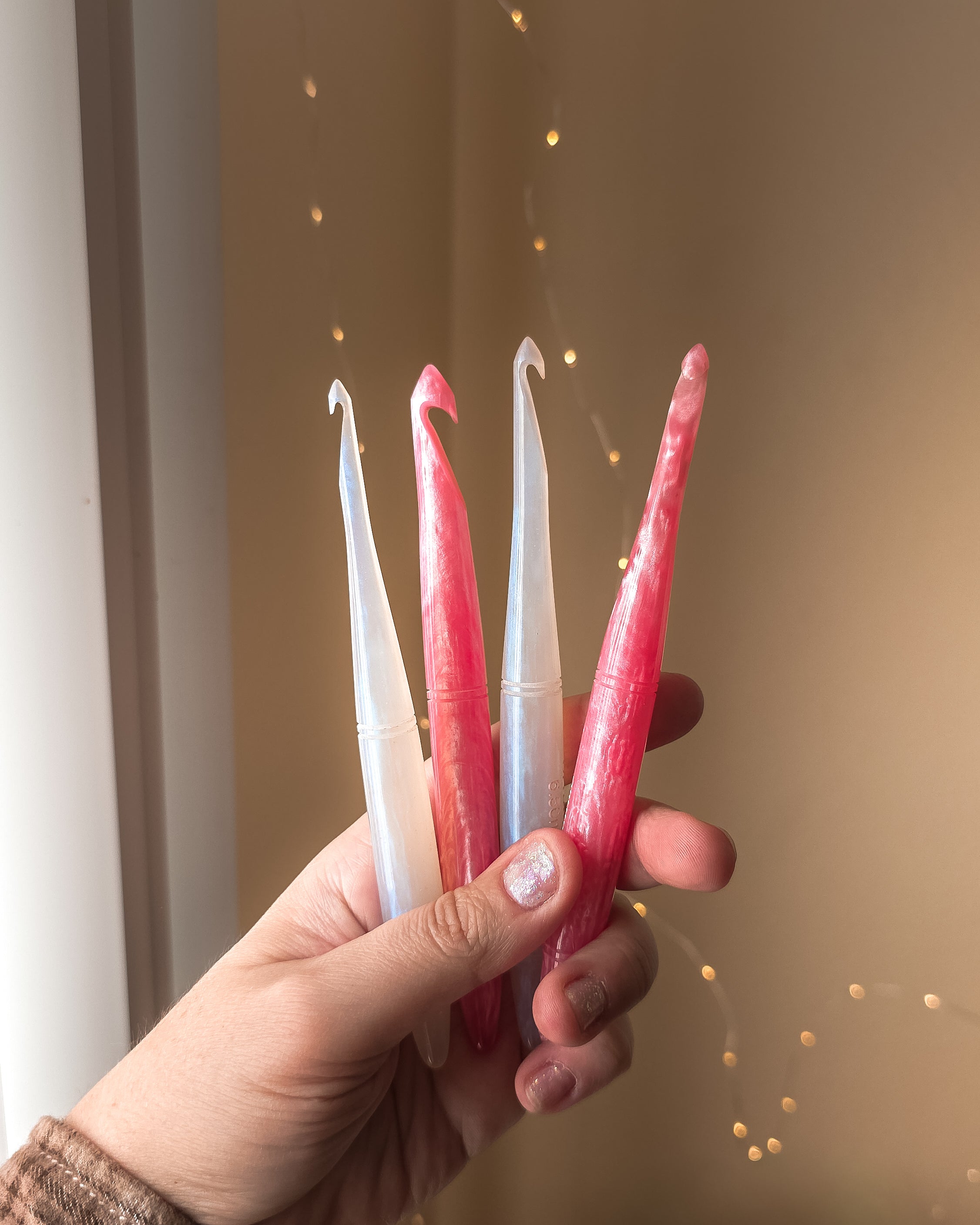 Each crochet hook is hand poured and carved one by one. Each color is hand spiraled which means each hook is completely unique!