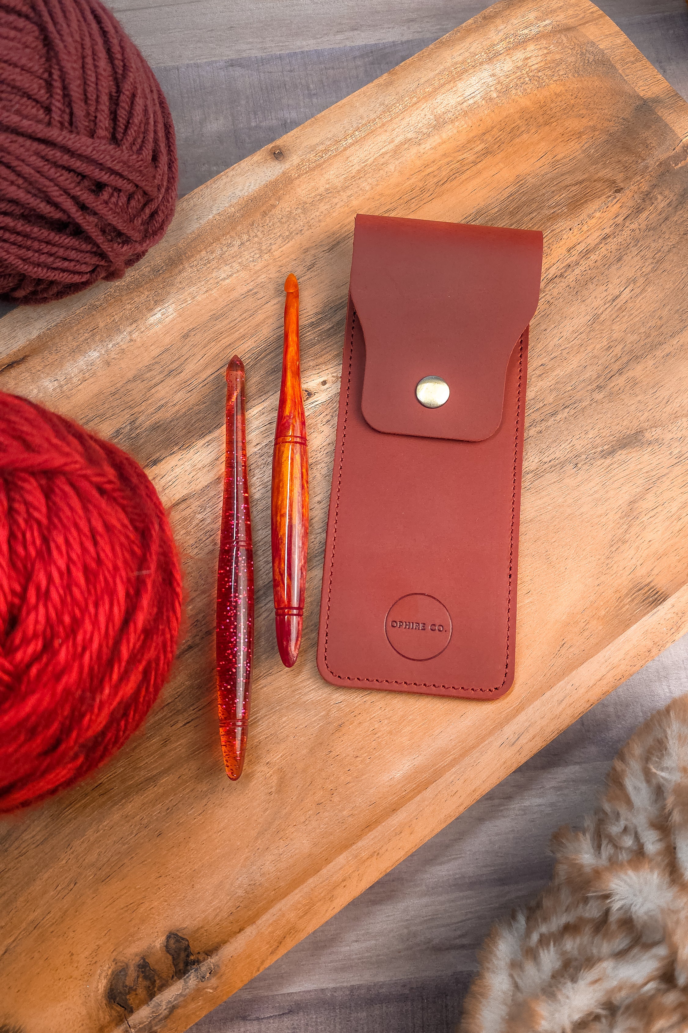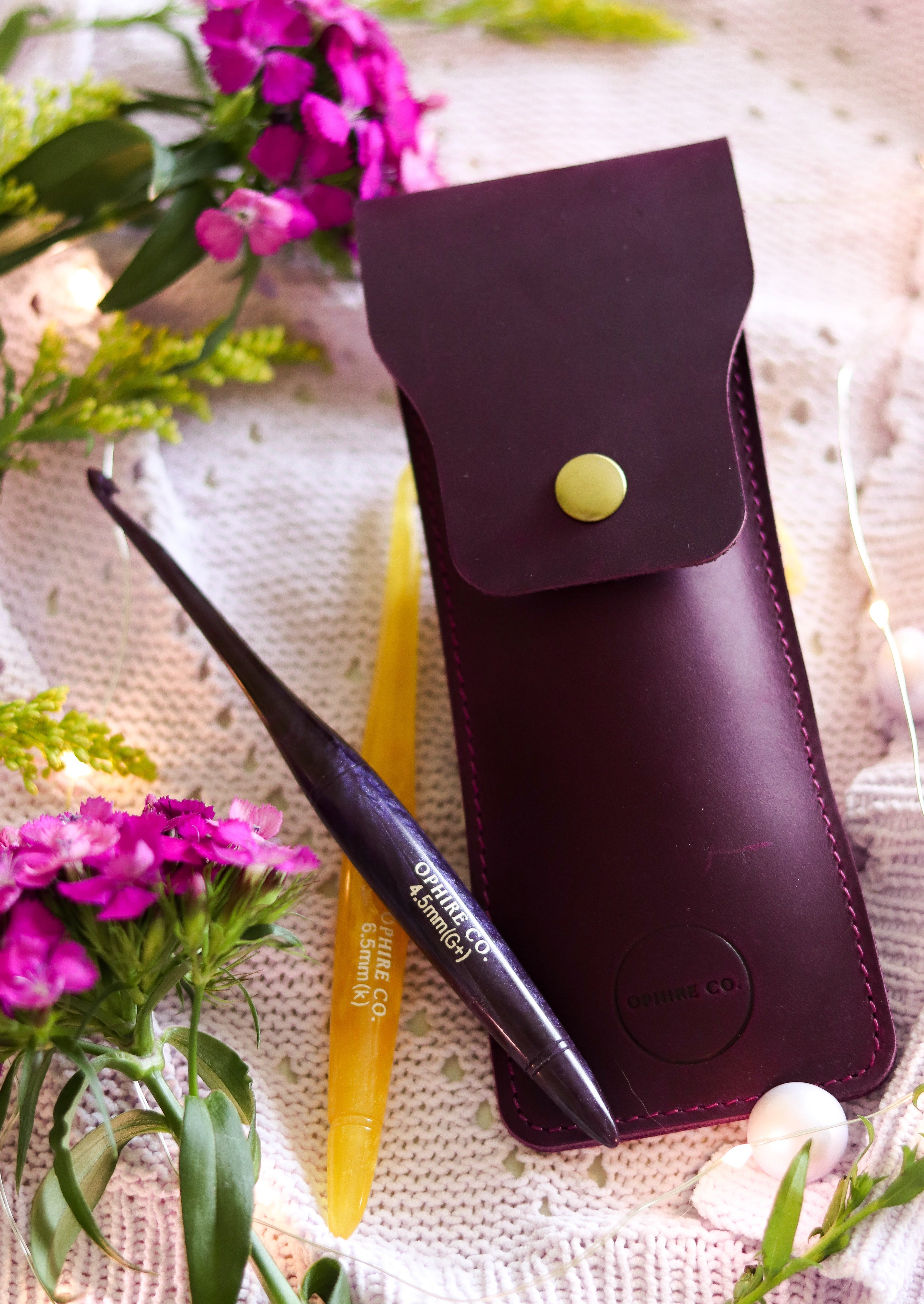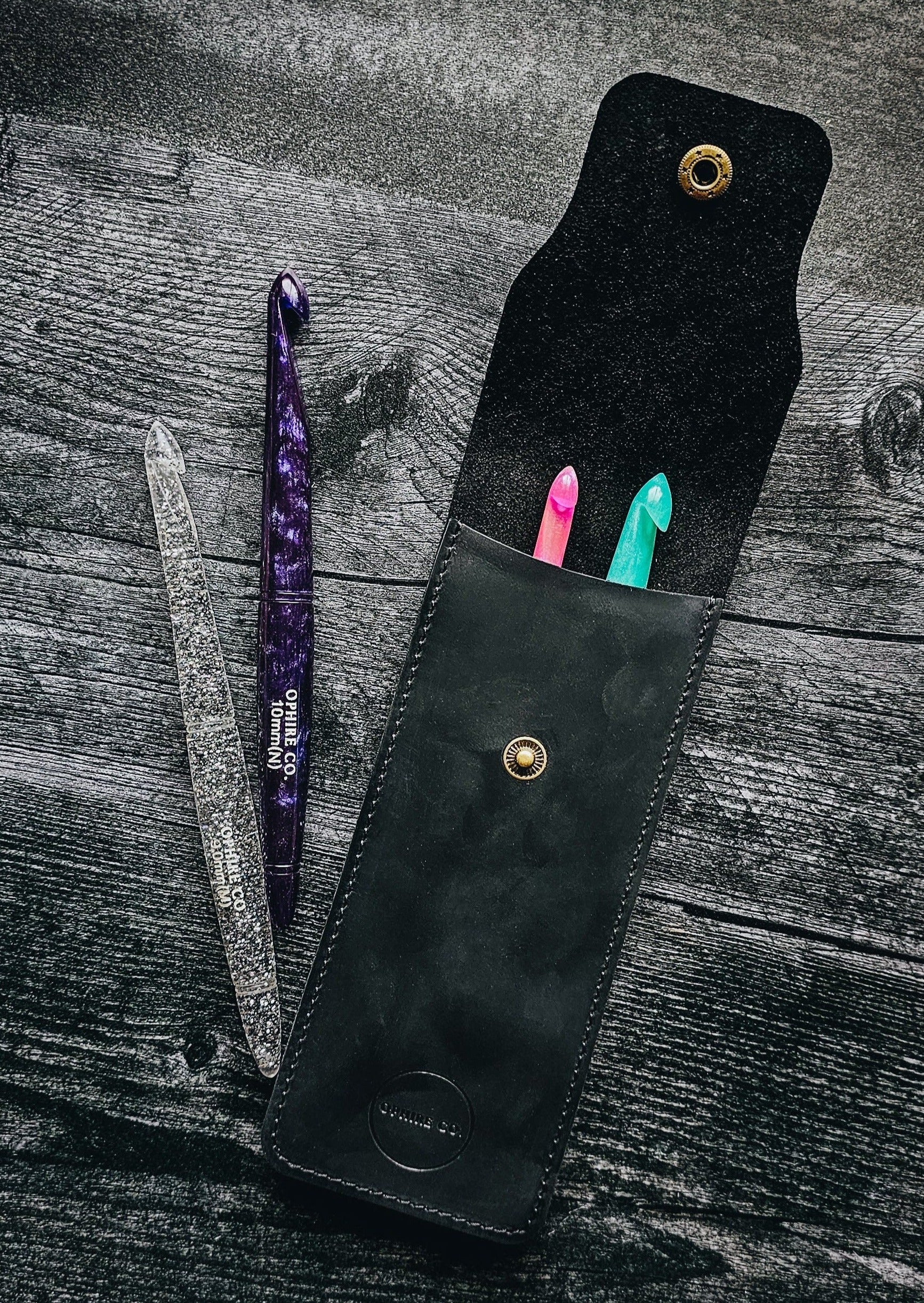 Two hook travel pouch made with genuine leather. Keep your hooks safe when you're on the go. The leather pouch now measures 7" long by 2.75" wide which will fit up to 3 Ophire Co. crochet hooks. TSA approved to carry crochet hooks and small scissors.