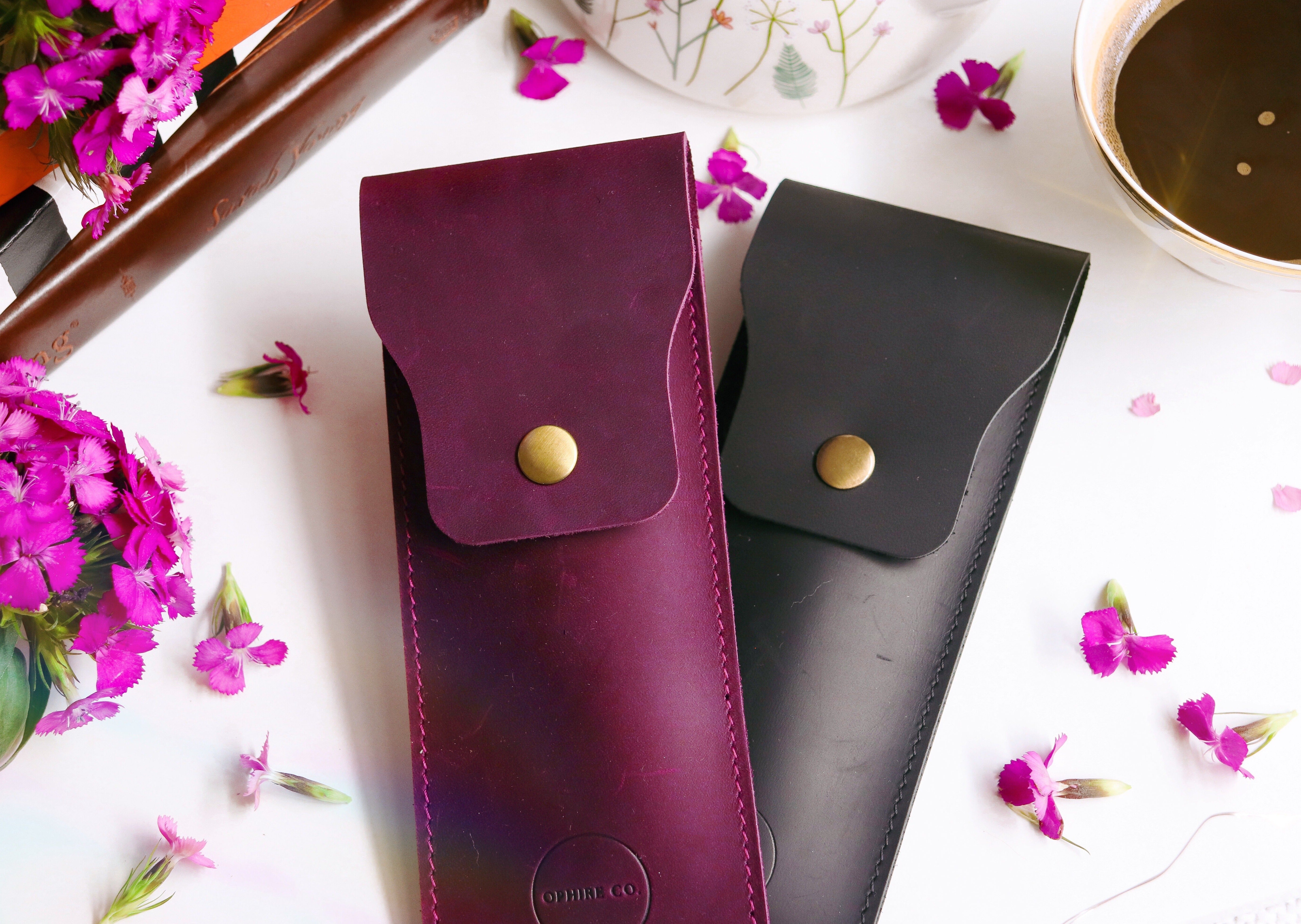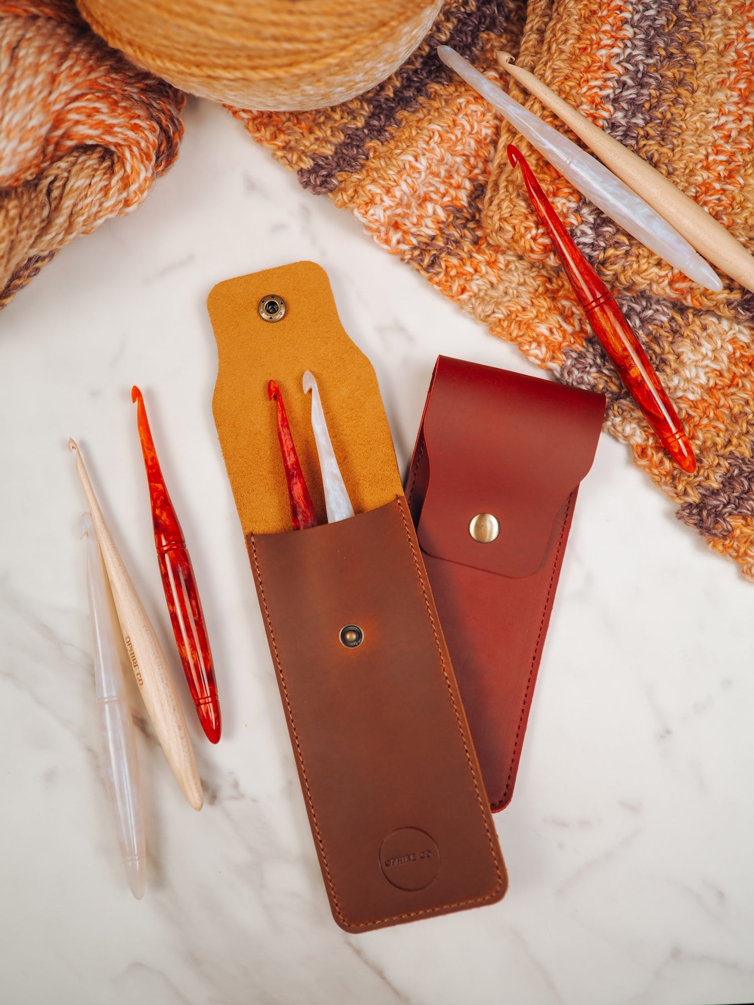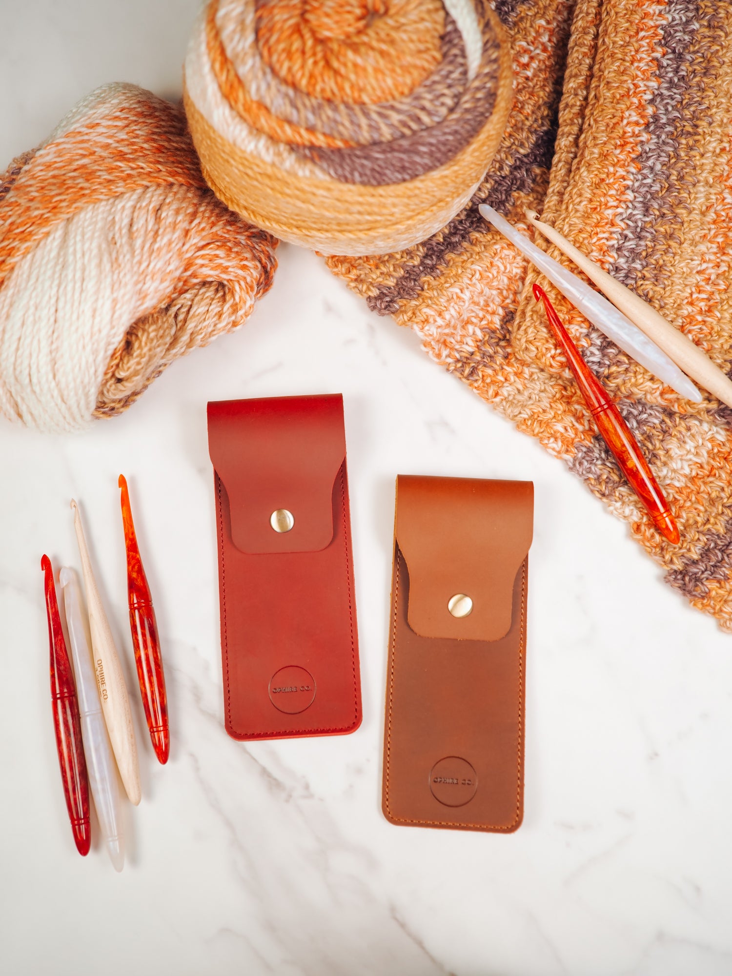 Two hook travel pouch made with genuine leather. Keep your hooks safe when you're on the go. The leather pouch now measures 7" long by 2.75" wide which will fit up to 3 Ophire Co. crochet hooks. TSA approved to carry crochet hooks and small scissors.