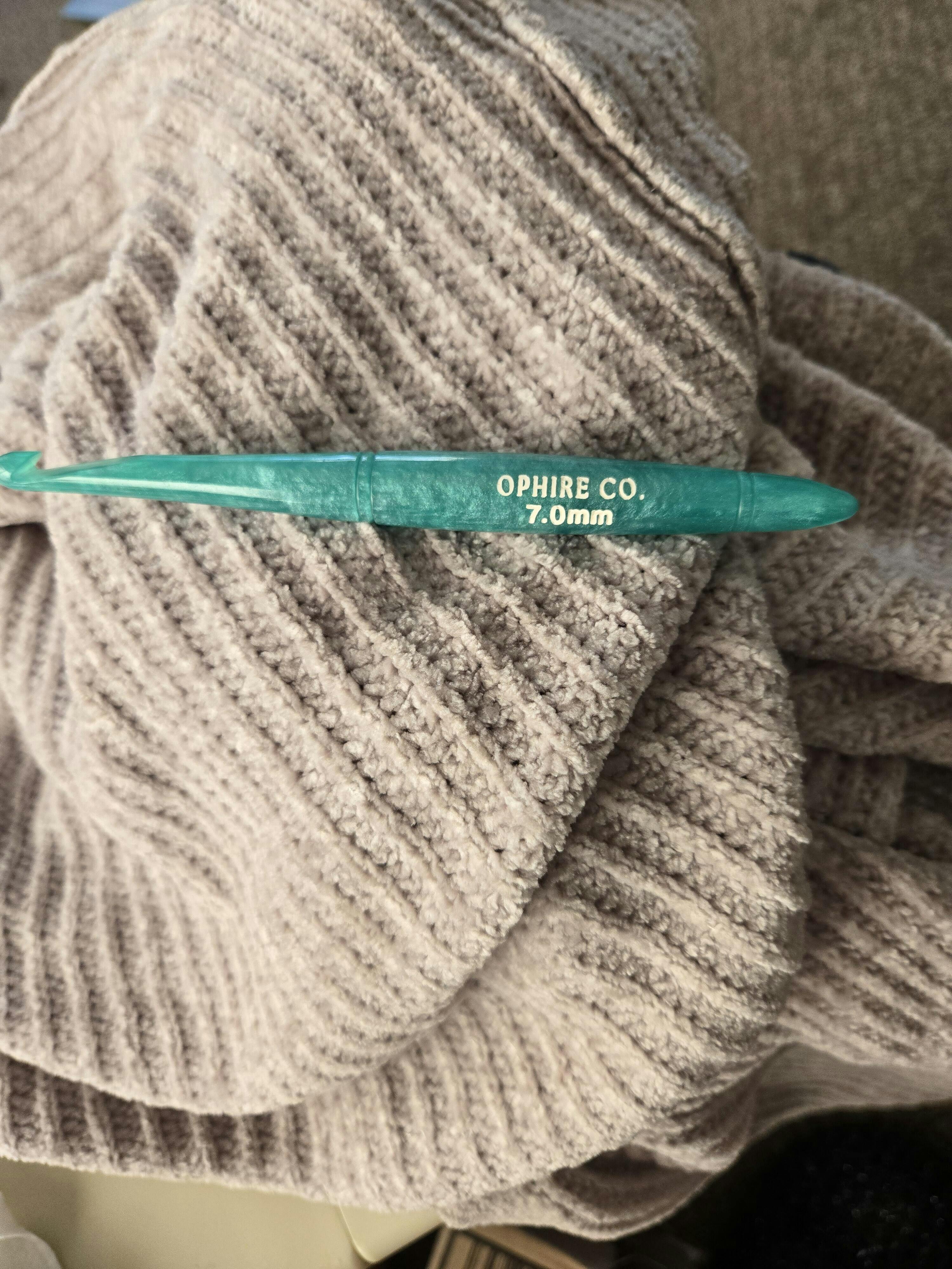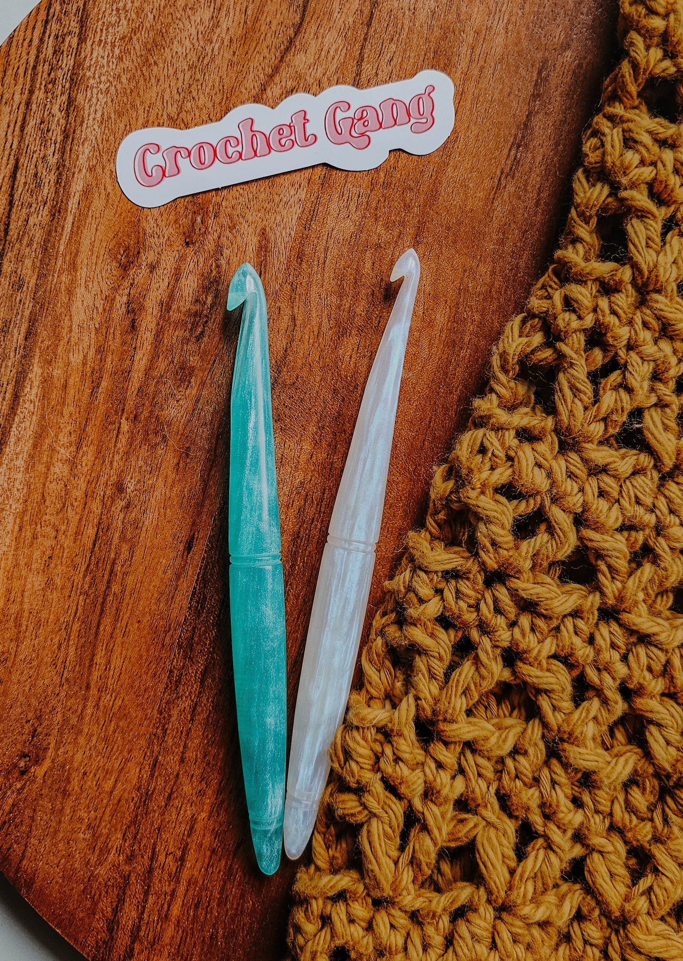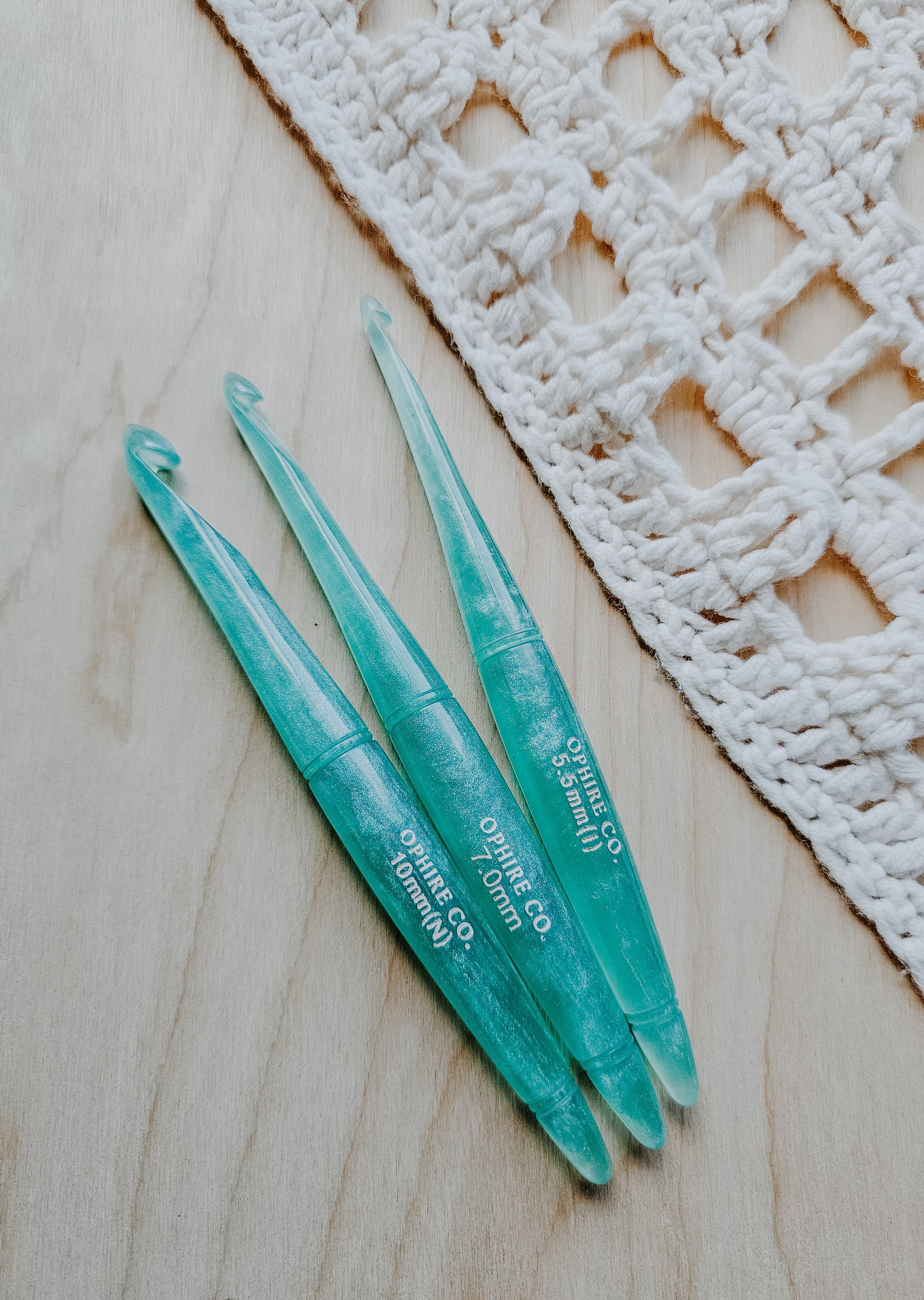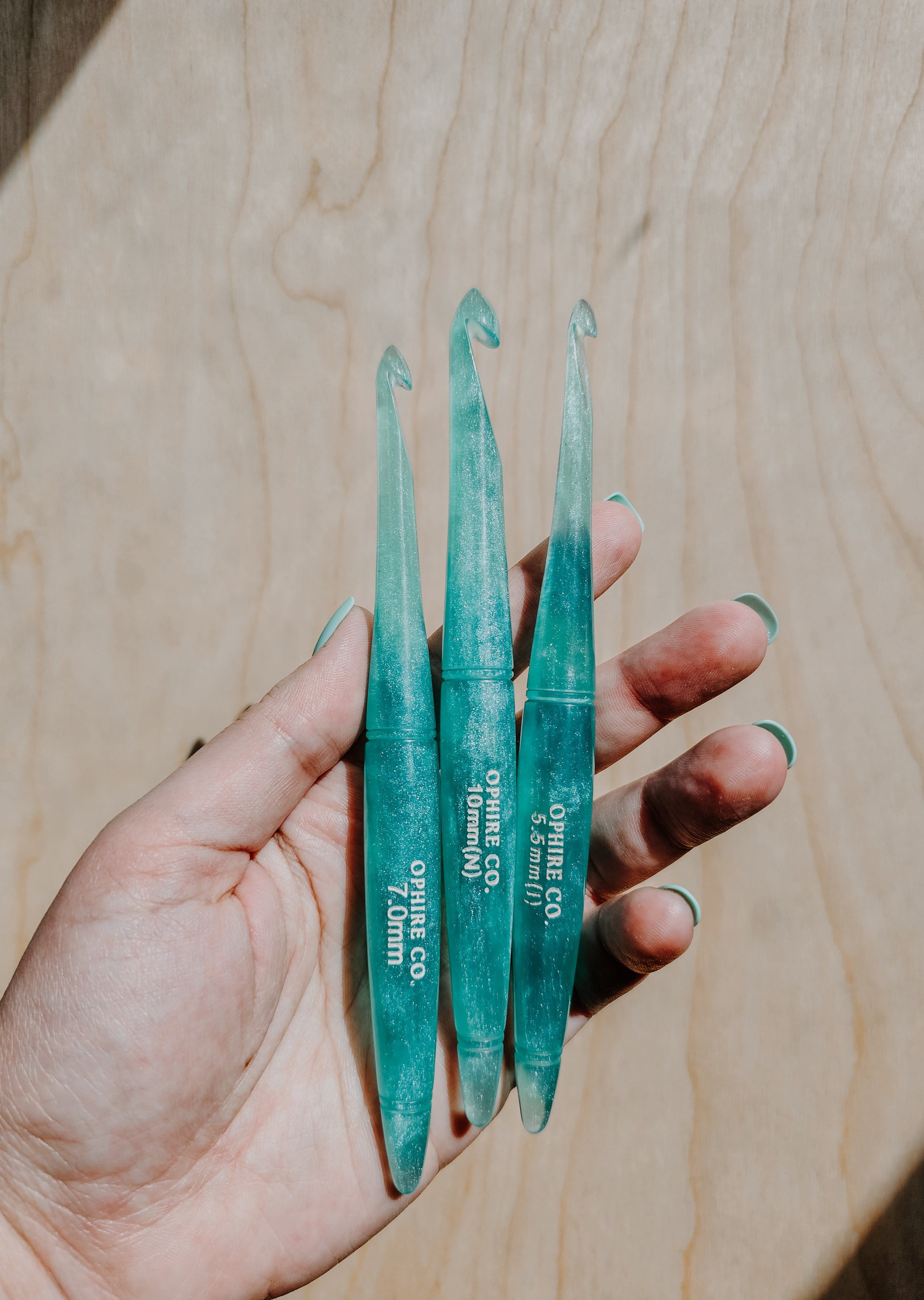 This crochet hook is a true work of art, meticulously crafted to capture the essence of Aquamarine's tranquil teal hues. The hook glistens with shades of pale teal and seafoam green, evoking the calming sensation of gentle ocean waves.