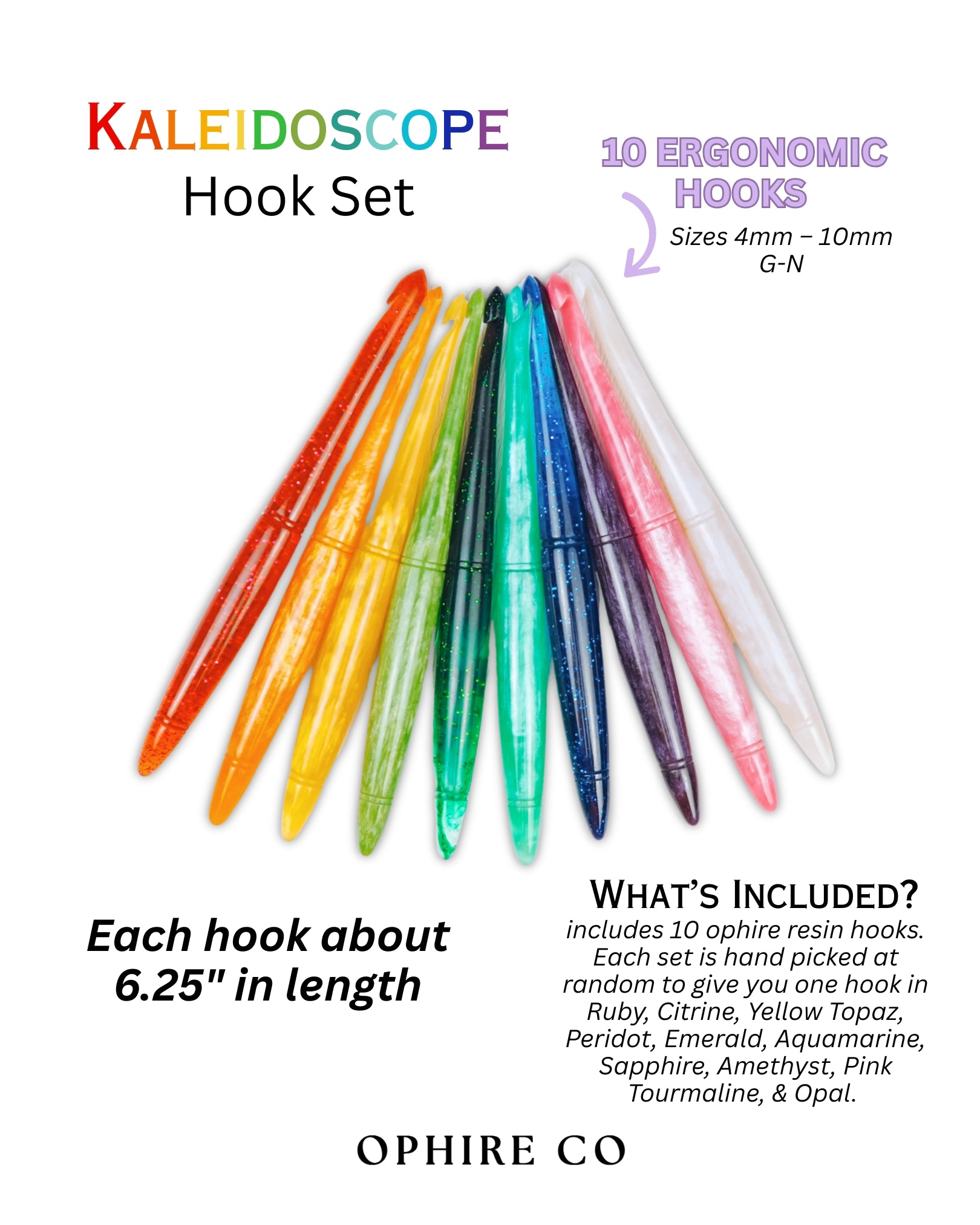 Get ready to crochet in full color with our Kaleidoscope Mixed Set! This vibrant collection includes 10 ergonomic resin hooks in a stunning range of rainbow hues. Each hook is approximately 6.25 inches long, perfectly balanced for both knife and pencil grip styles.
