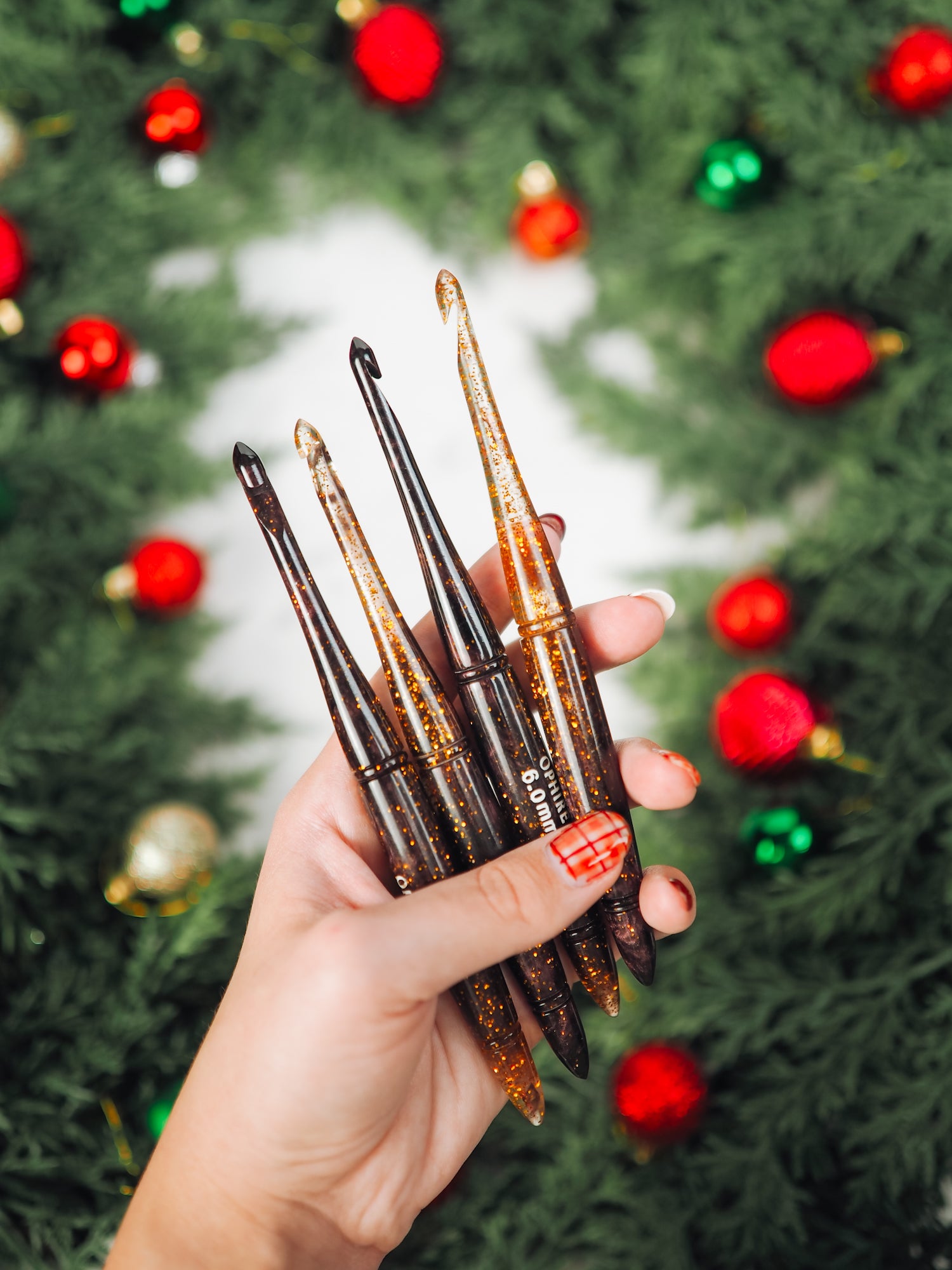 Dahlia is more than just a hook, it’s a statement piece. Its a smooth, ergonomic design that ensures comfort and ease during long hours of crocheting. The perfect hook for the fall season, Dahlia’s dark moody plum tones and golden sparkle pair beautifully with autumn yarns and cozy makes, from warm scarves to festive décor.