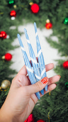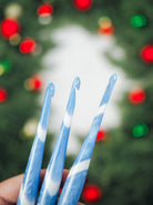 The Winter Wonderland crochet hook is dressed in elegant simplicity, showcasing a harmonious blend of serene blue and pristine white stripes spiraling along its length. The body of the hook boasts alternating bands of light blue and pure white, reminiscent of a winter's sky meeting the untouched snow-kissed landscape. The hues intertwine gracefully, creating a mesmerizing visual rhythm, as if reflecting the delicate dance of snowflakes falling against a clear, light blue backdrop.