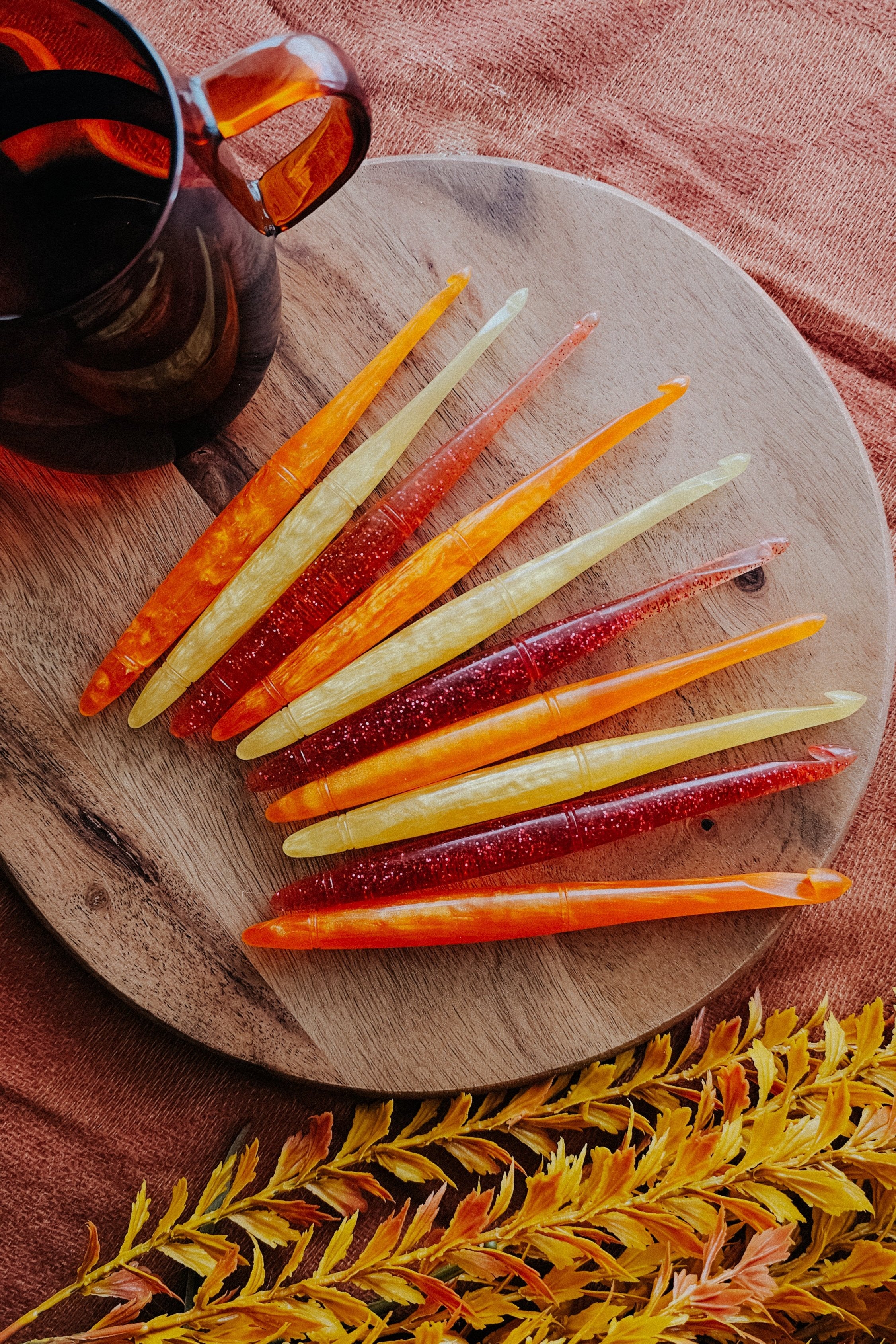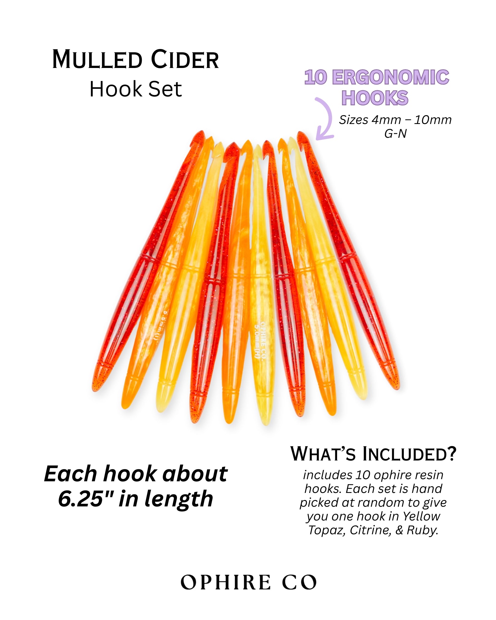The Mulled Cider Mixed Crochet Hook Set is a warm celebration of autumn, swirling together cozy shades of orange, red, and golden yellow. Inspired by the comforting glow of spiced cider on a crisp fall day, each hook shimmers with rich, fiery tones that feel both vibrant and inviting. With Ophire’s signature ergonomic design and sparkling resin finish, this limited edition set is the perfect companion for your seasonal stitches, bringing comfort, warmth, and a touch of fall magic to every project. Each set is thoughtfully curated from our available inventory, ensuring every set is one-of-a-kind.