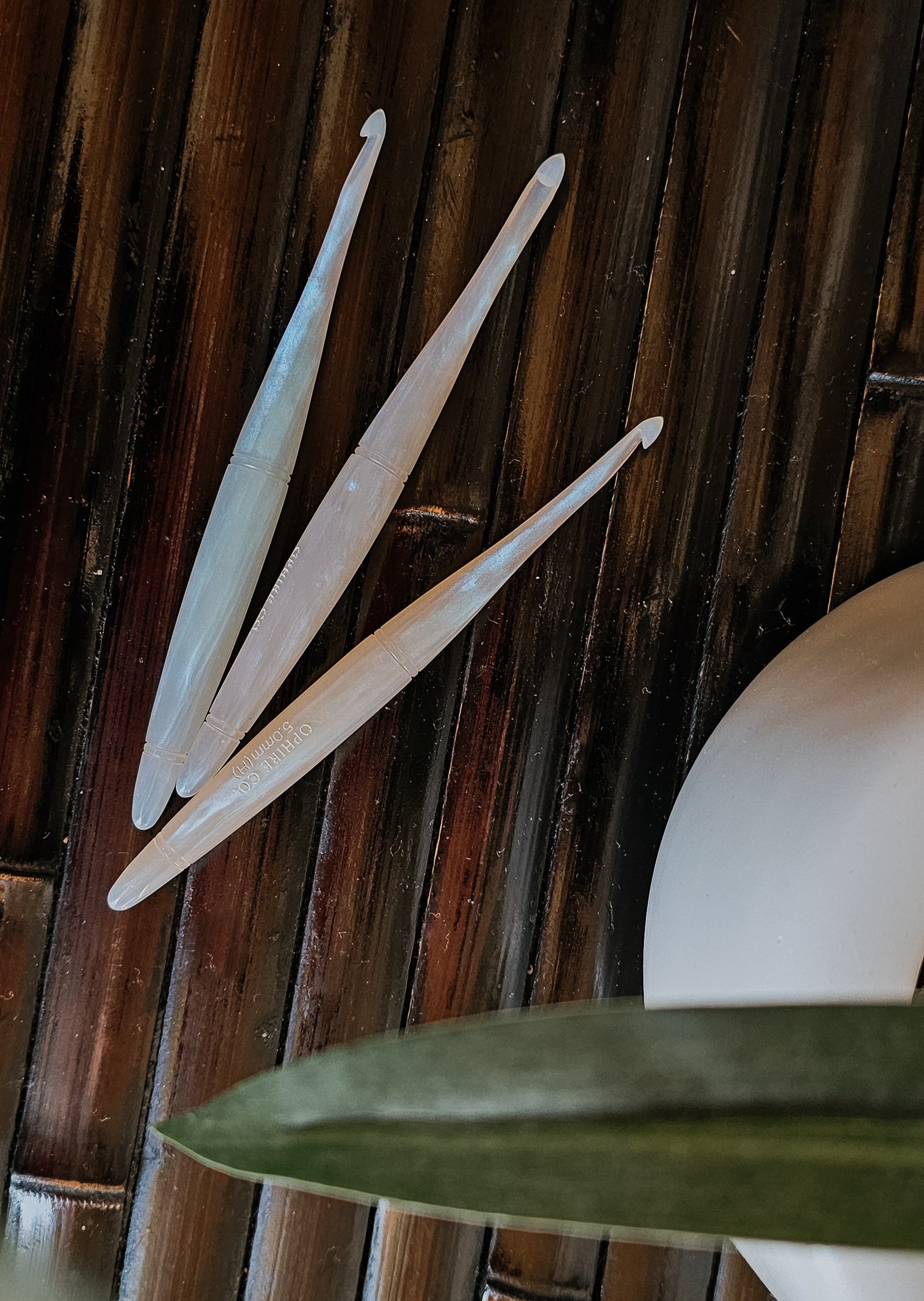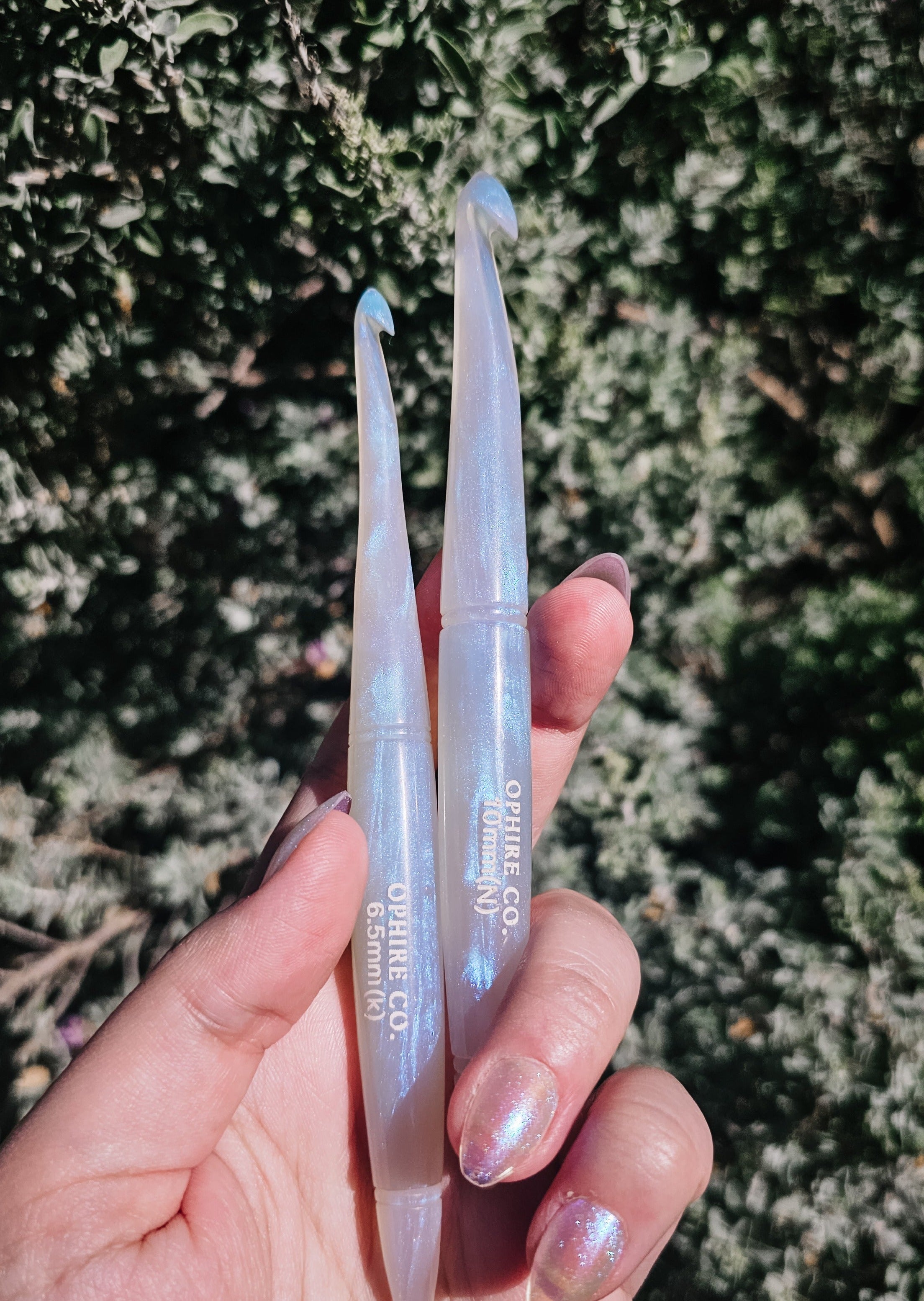 Opal Birthstone Crochet Hook, a crochet tool that marries the timeless purity of white opal with the serene and enchanting allure of blue highlights, creating a truly captivating and one-of-a-kind piece.