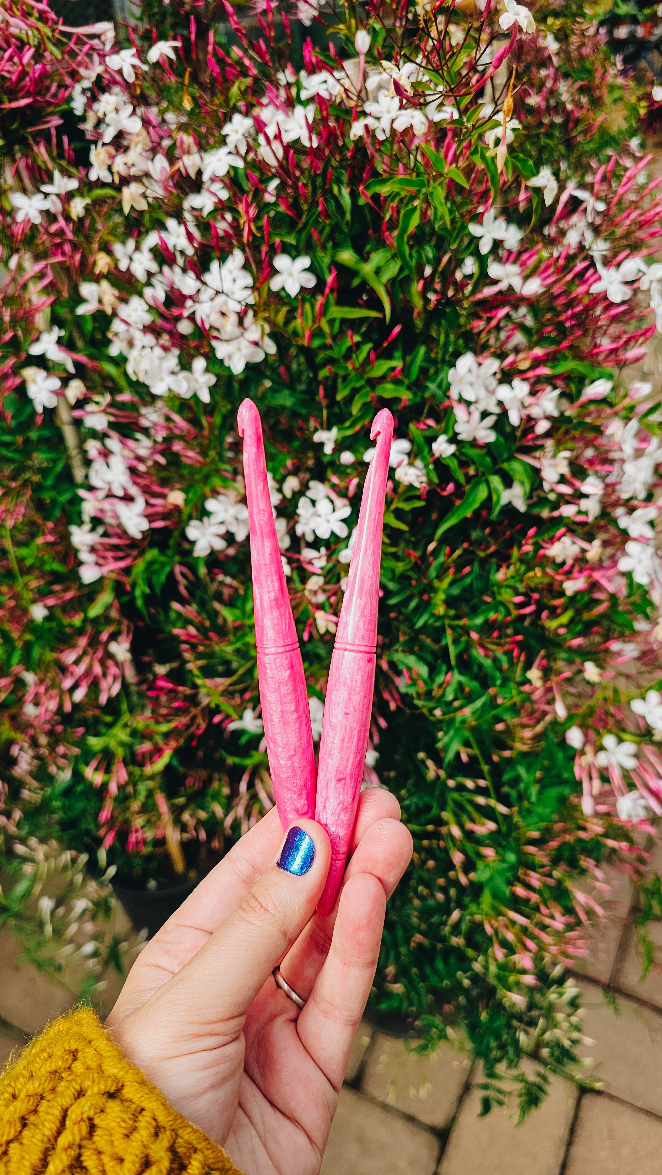 This crochet hook is a true work of art, carefully designed to echo the soft and alluring shades of pink tourmaline. The hook gleams with shades of romantic pink, reminiscent of the gemstone's gentle and captivating color.