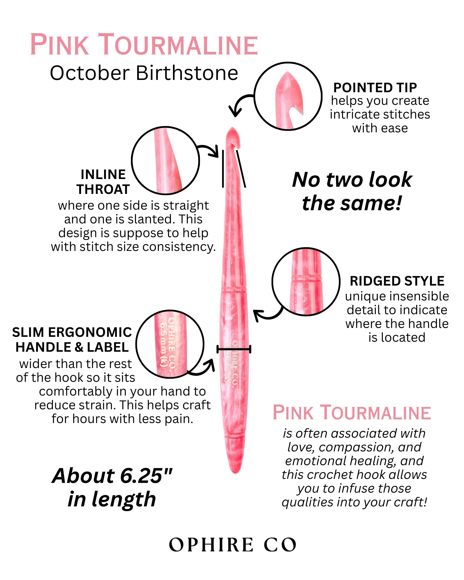 Pink Tourmaline Birthstone Crochet Hook, a crochet tool that beautifully encapsulates the exquisite charm and the delicate hues of the October birthstone, pink tourmaline.