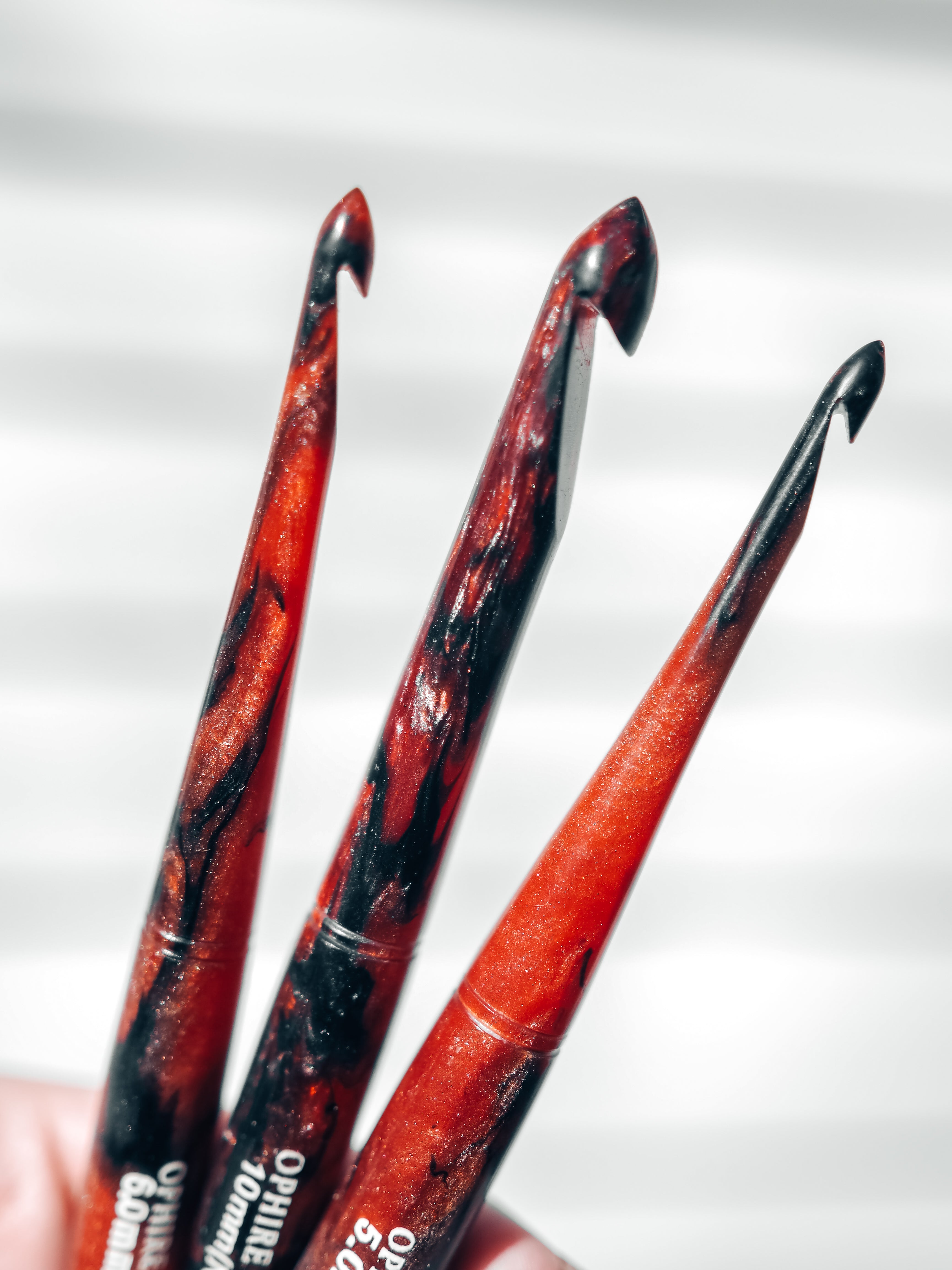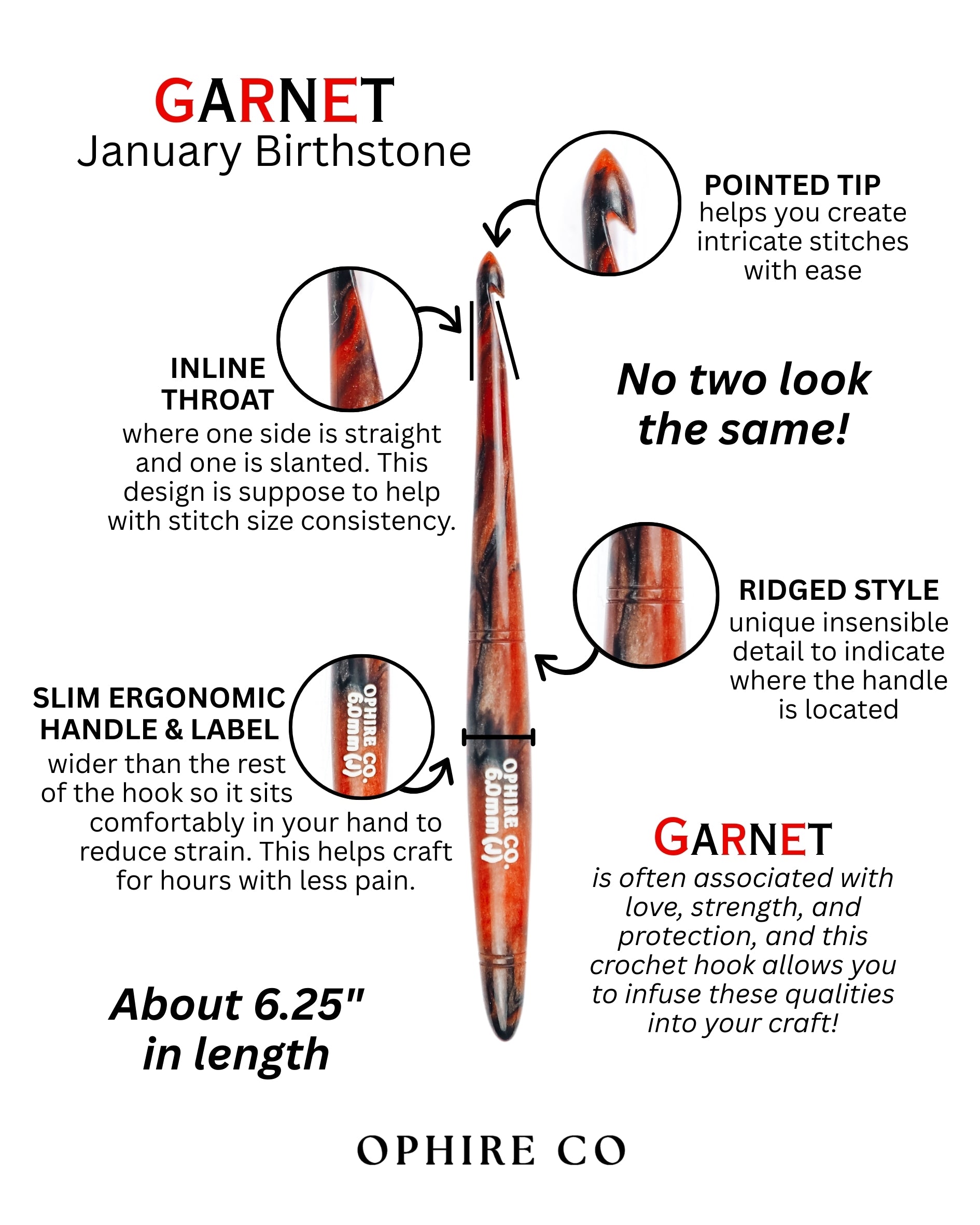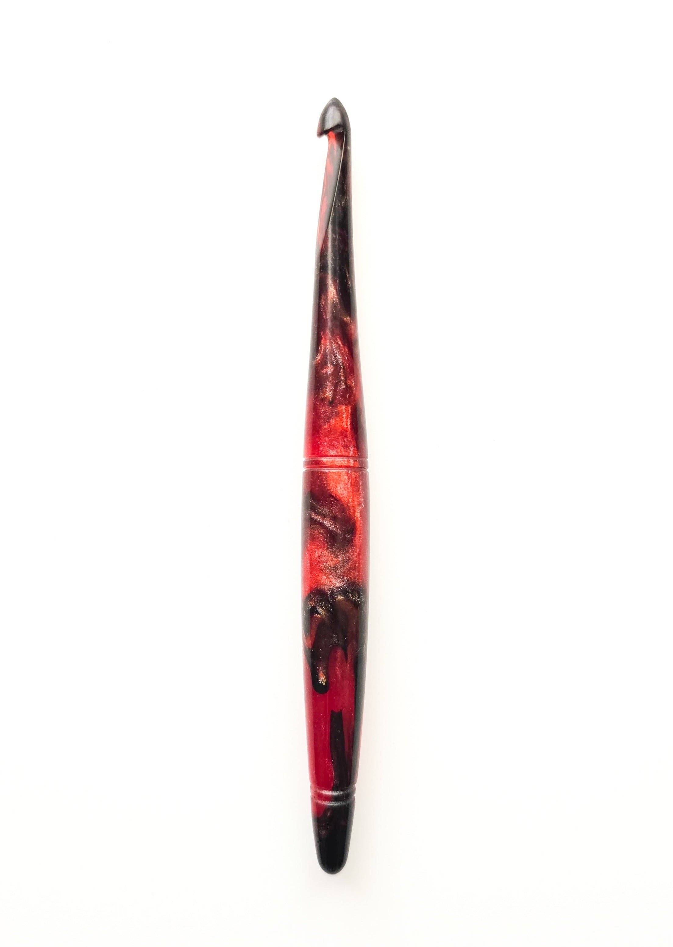 This crochet hook is a work of art, carefully designed to emulate the alluring, deep red tones of garnet. The hook shimmers with a velvety, crimson red hue and swirls of black shimmer, reminiscent of the gemstone's intense and passionate color.