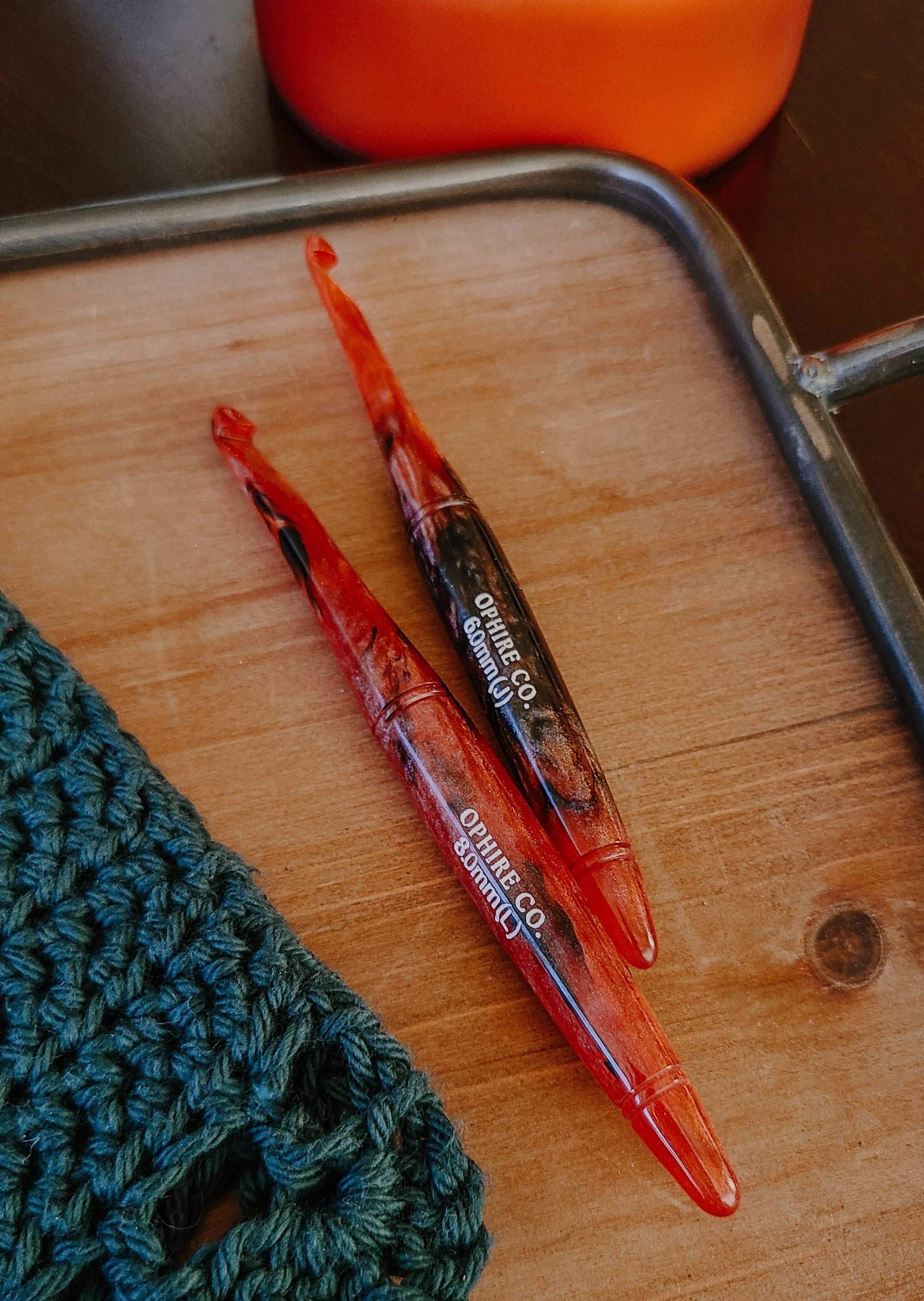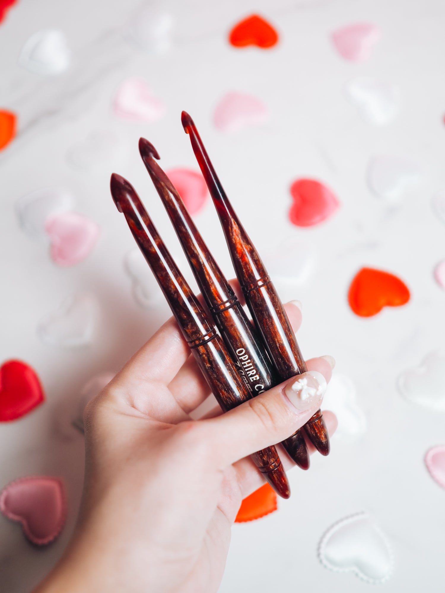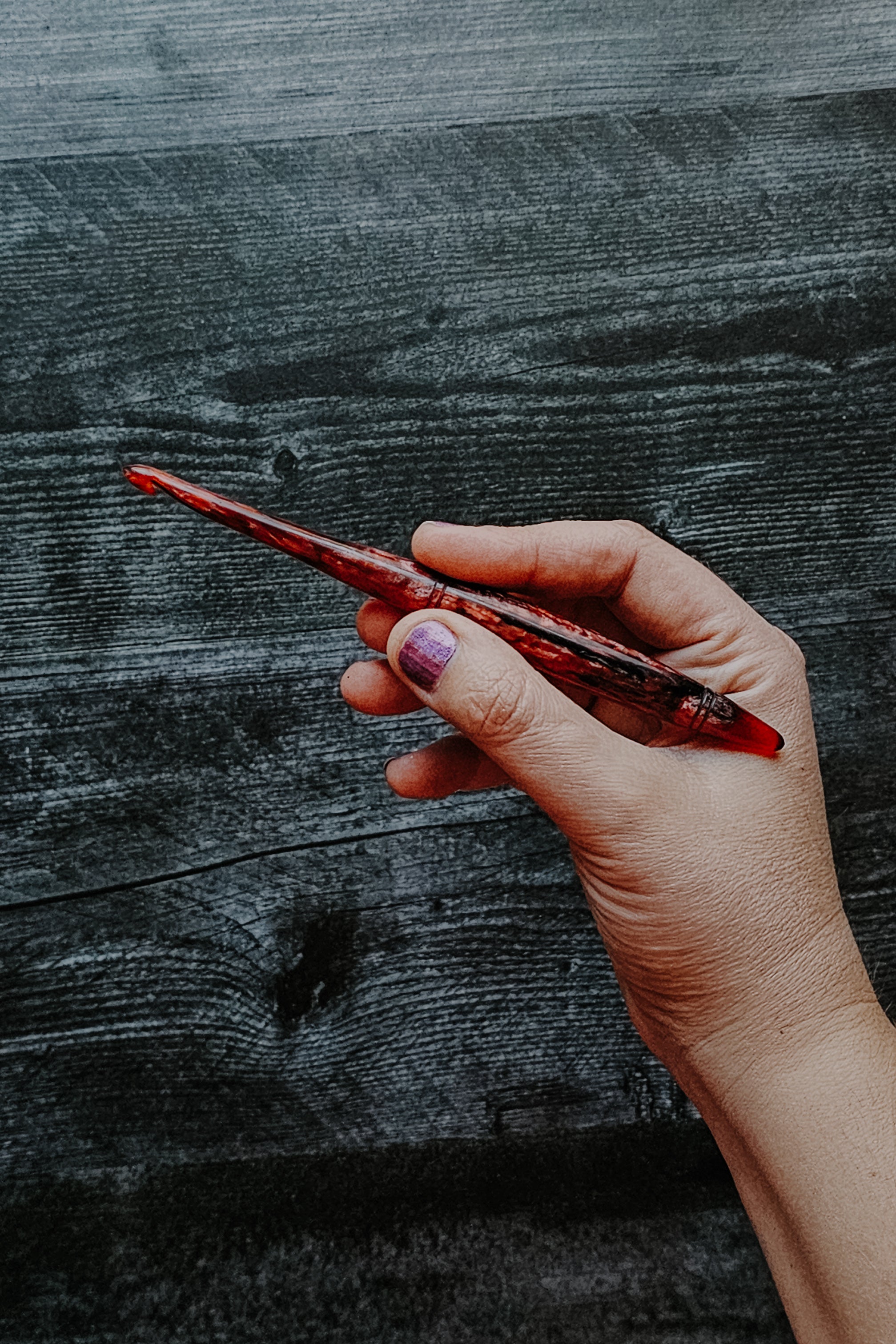 This crochet hook is a work of art, carefully designed to emulate the alluring, deep red tones of garnet. The hook shimmers with a velvety, crimson red hue and swirls of black shimmer, reminiscent of the gemstone's intense and passionate color.