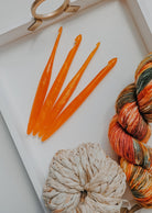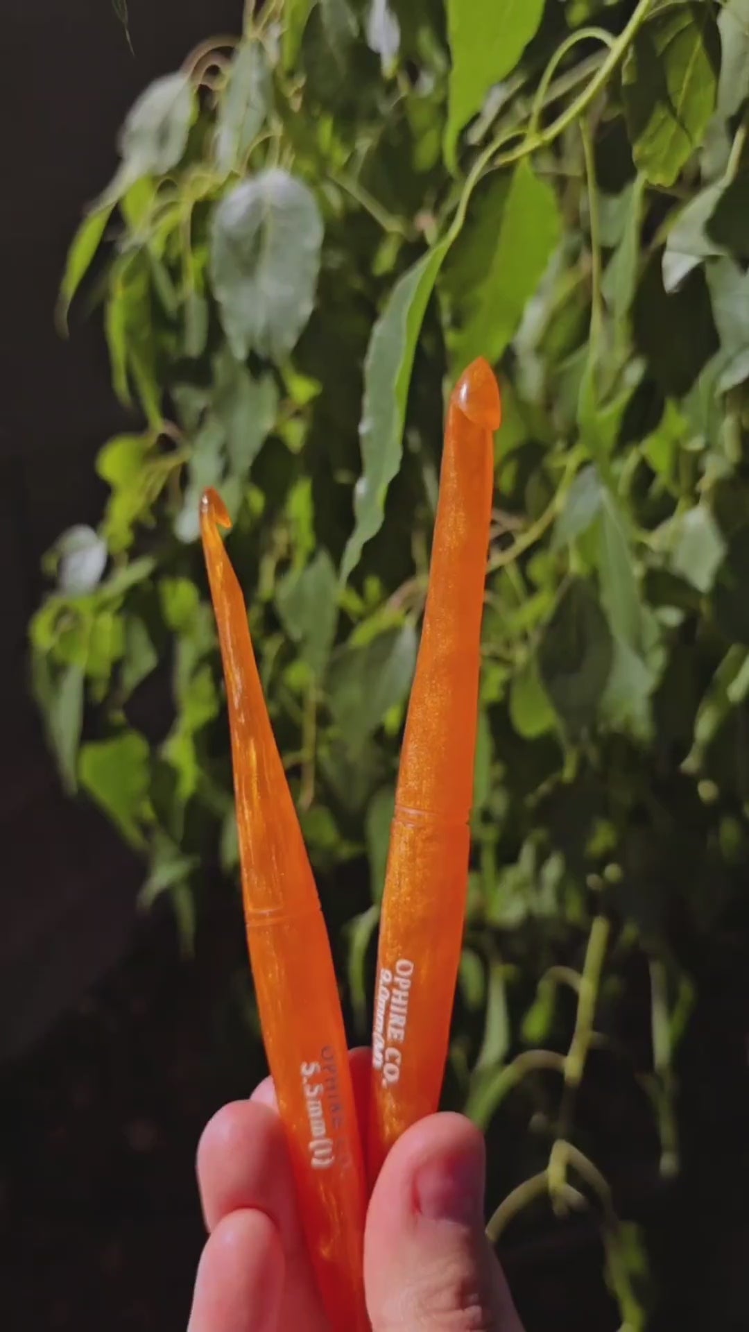 This crochet hook is a beautiful work of craftsmanship, designed to reflect the captivating warm hues of Citrine. The hook gleams with a sunny, orange shimmer hue, reminiscent of the gemstone's vibrant color. Its polished surface mirrors the gem's natural brilliance.