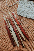 Together, the combination of Bloodwood and Birdseye Maple in these crochet hooks are a testament to the craftsmanship and attention to detail. Each hook is meticulously carved, sanded, and polished to ensure a flawless finish that glides smoothly through yarn, making every stitch a joyous experience.