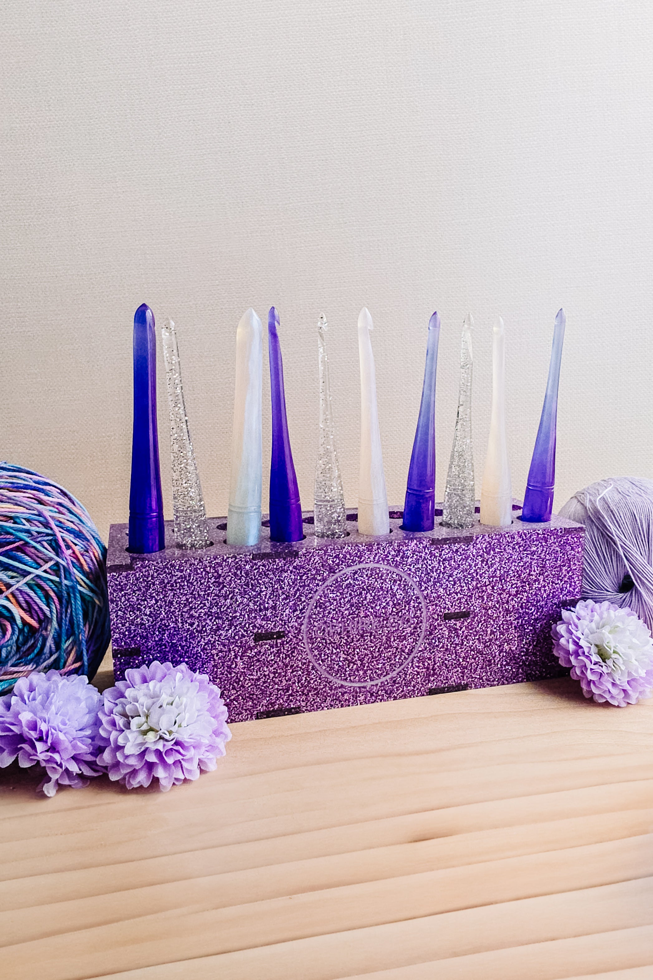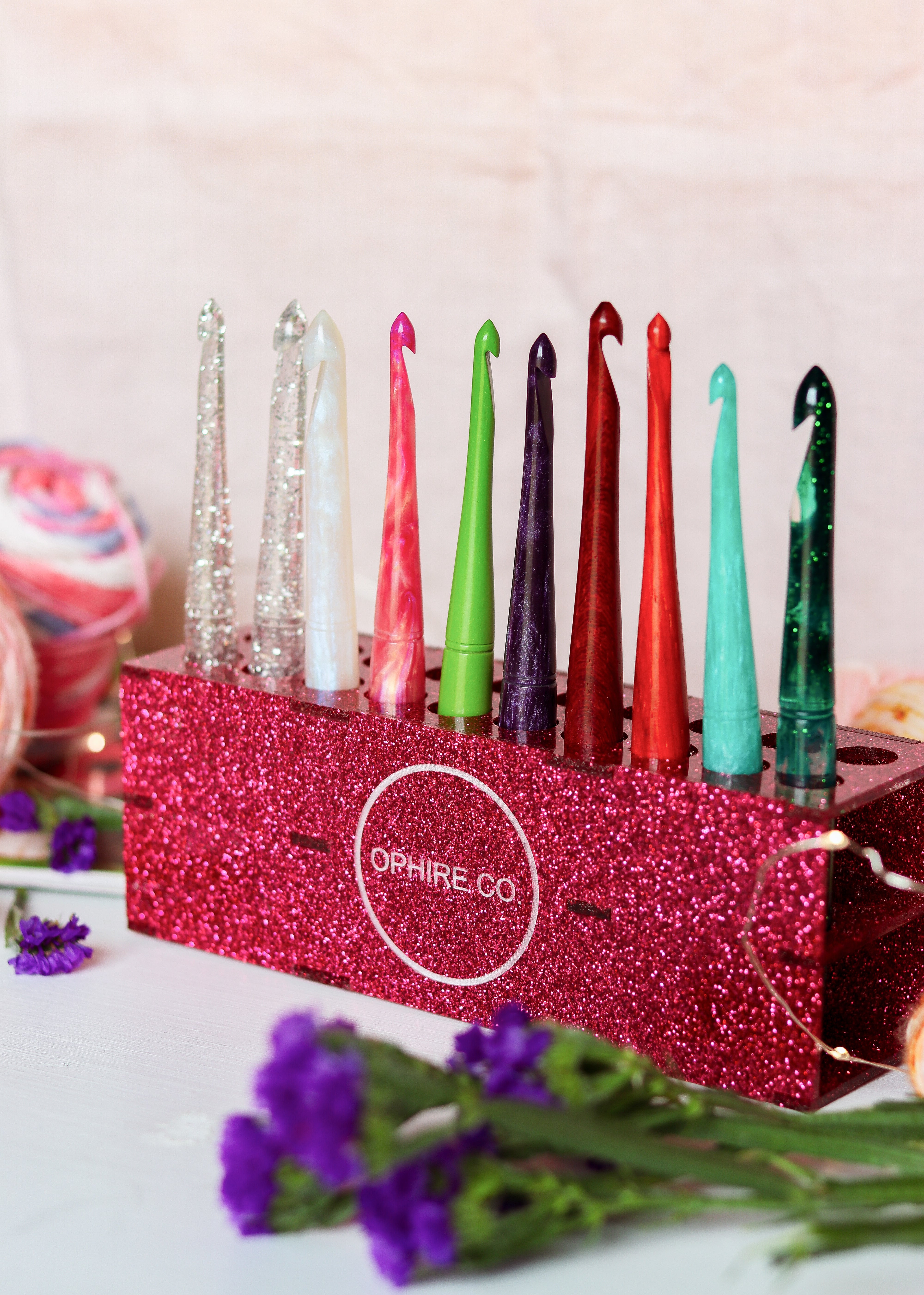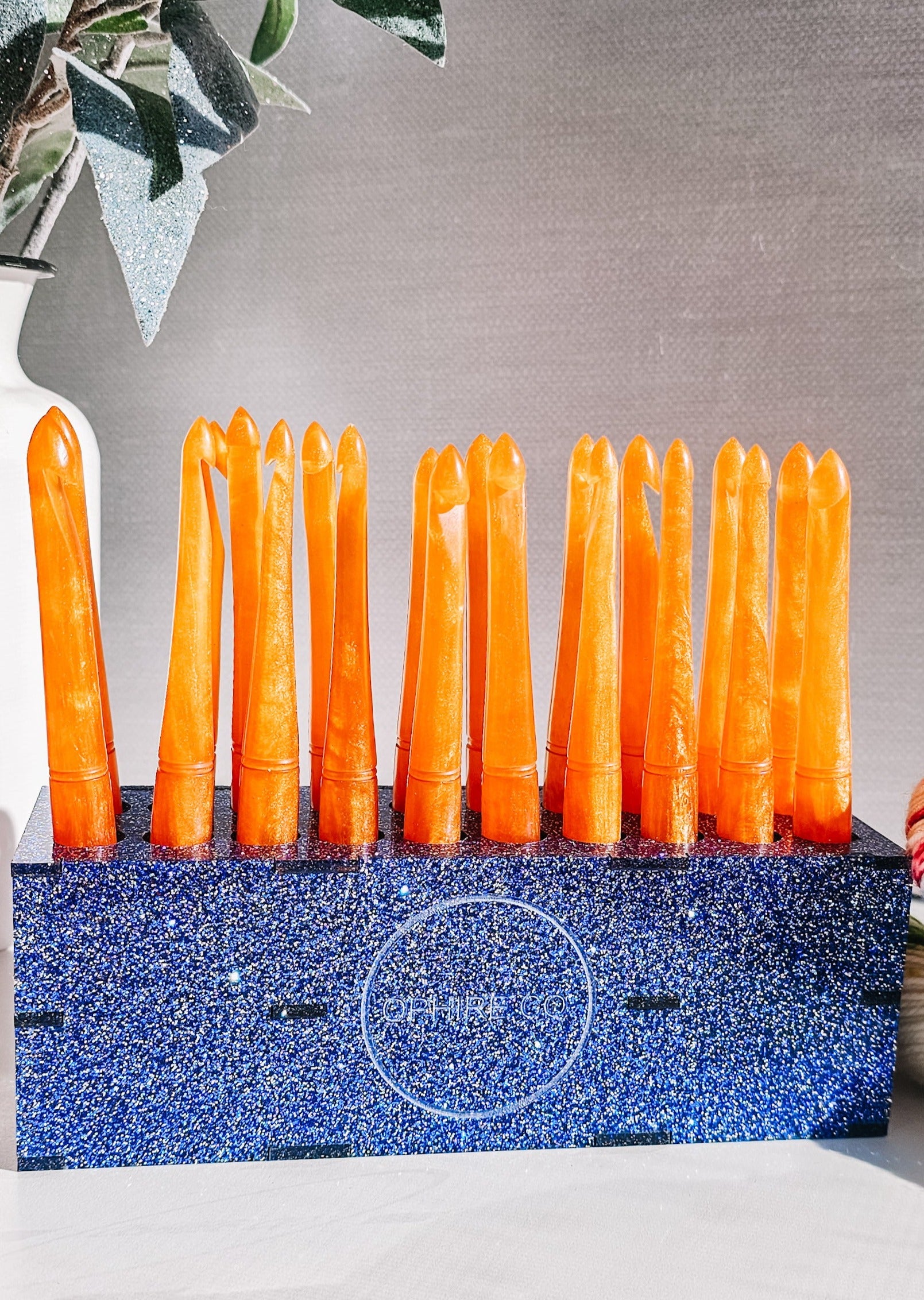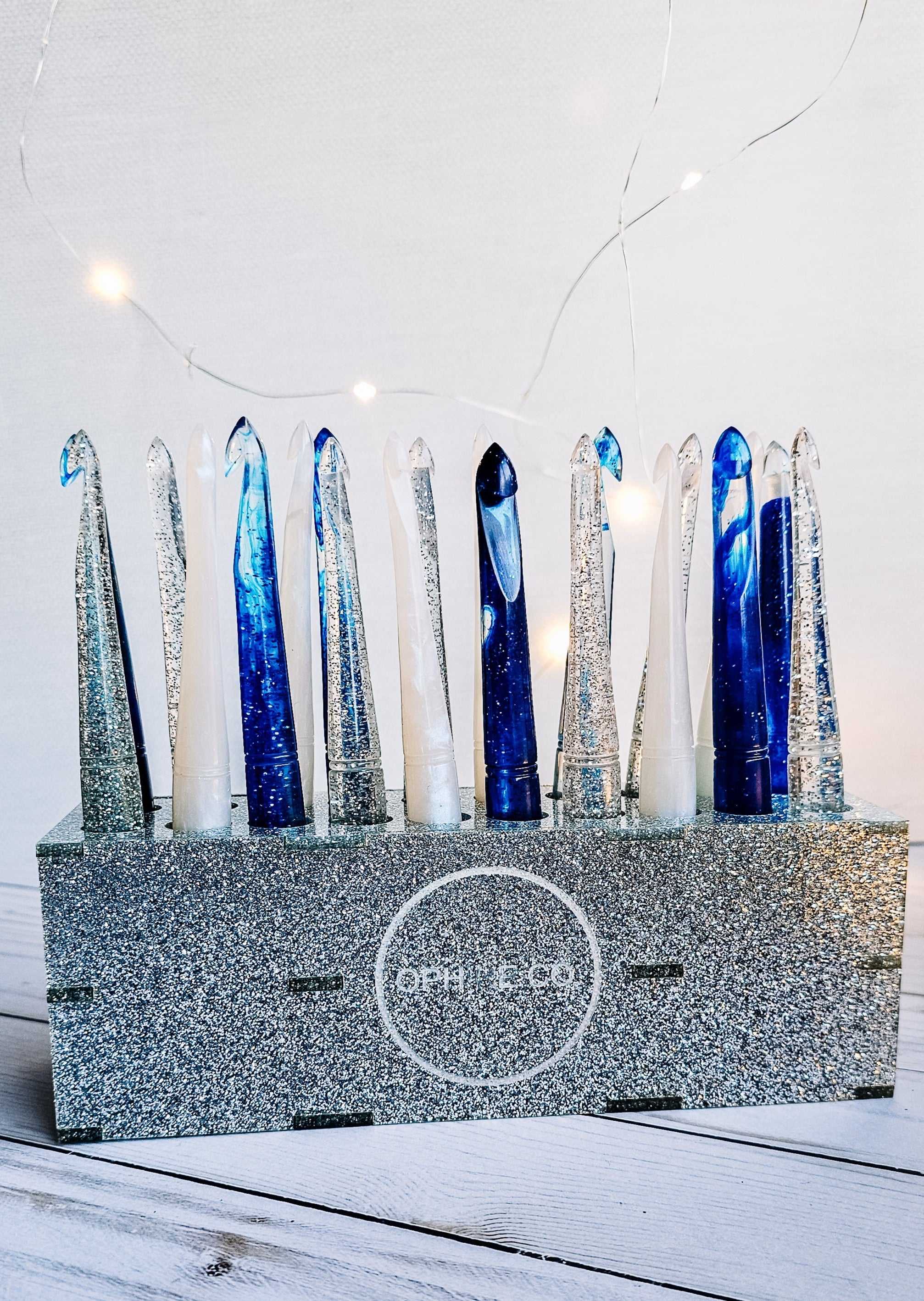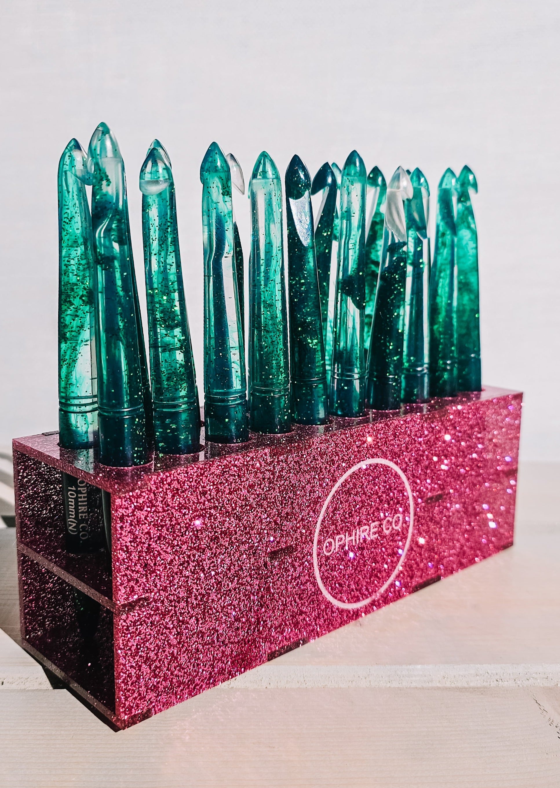 Handmade glitter crochet hook stand by Ophire Co. The stand holds 20 Ophire Co. crochet hooks. Crochet hooks not included with stand.