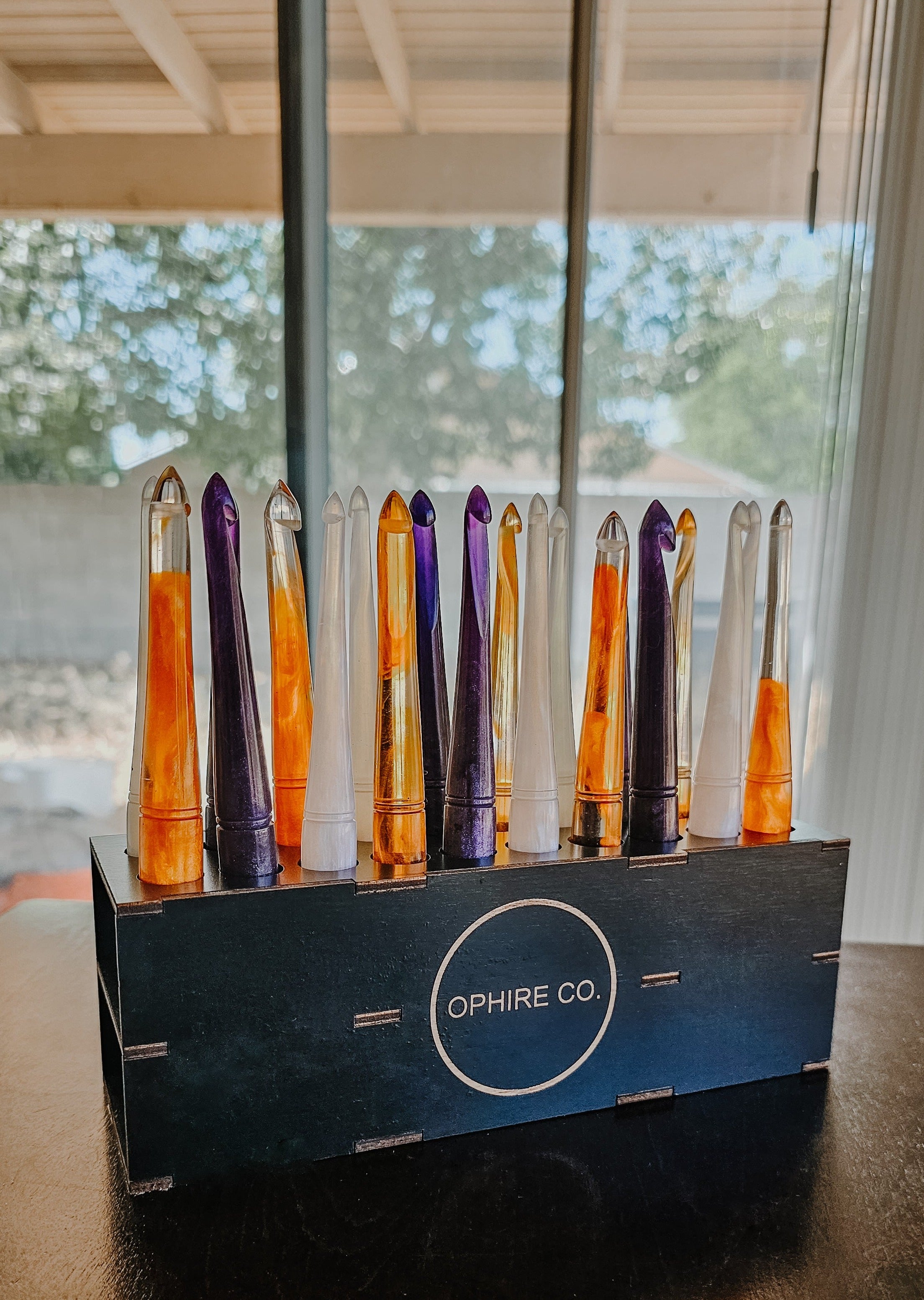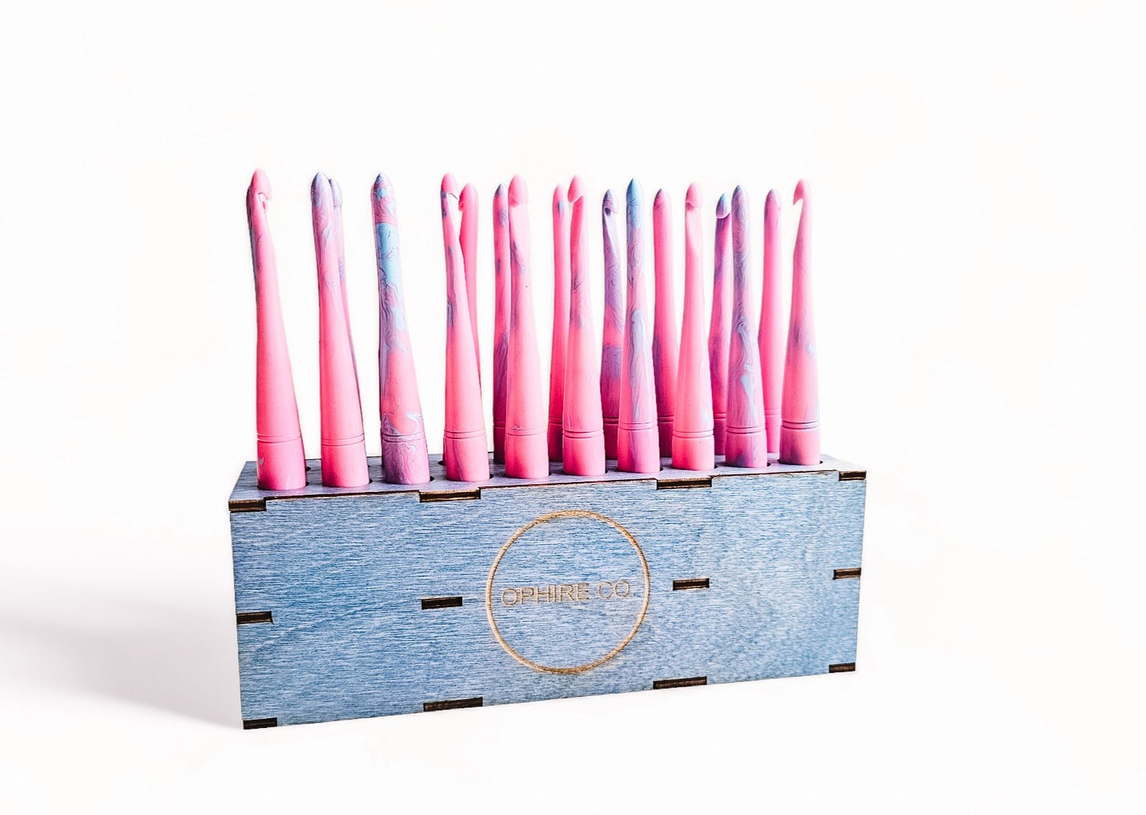 Handmade crochet hook stand by Ophire Co. The stand holds 20 Ophire Co. crochet hooks. Crochet hooks not included with stand. Color and wood grain may differ slightly from photos.