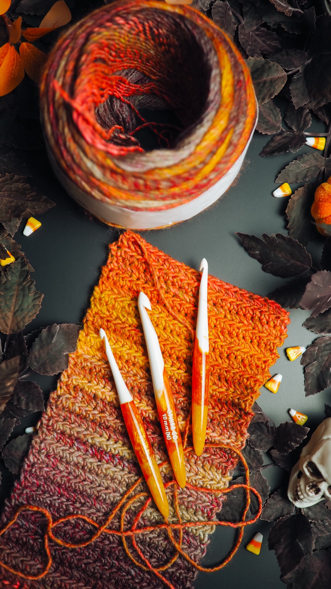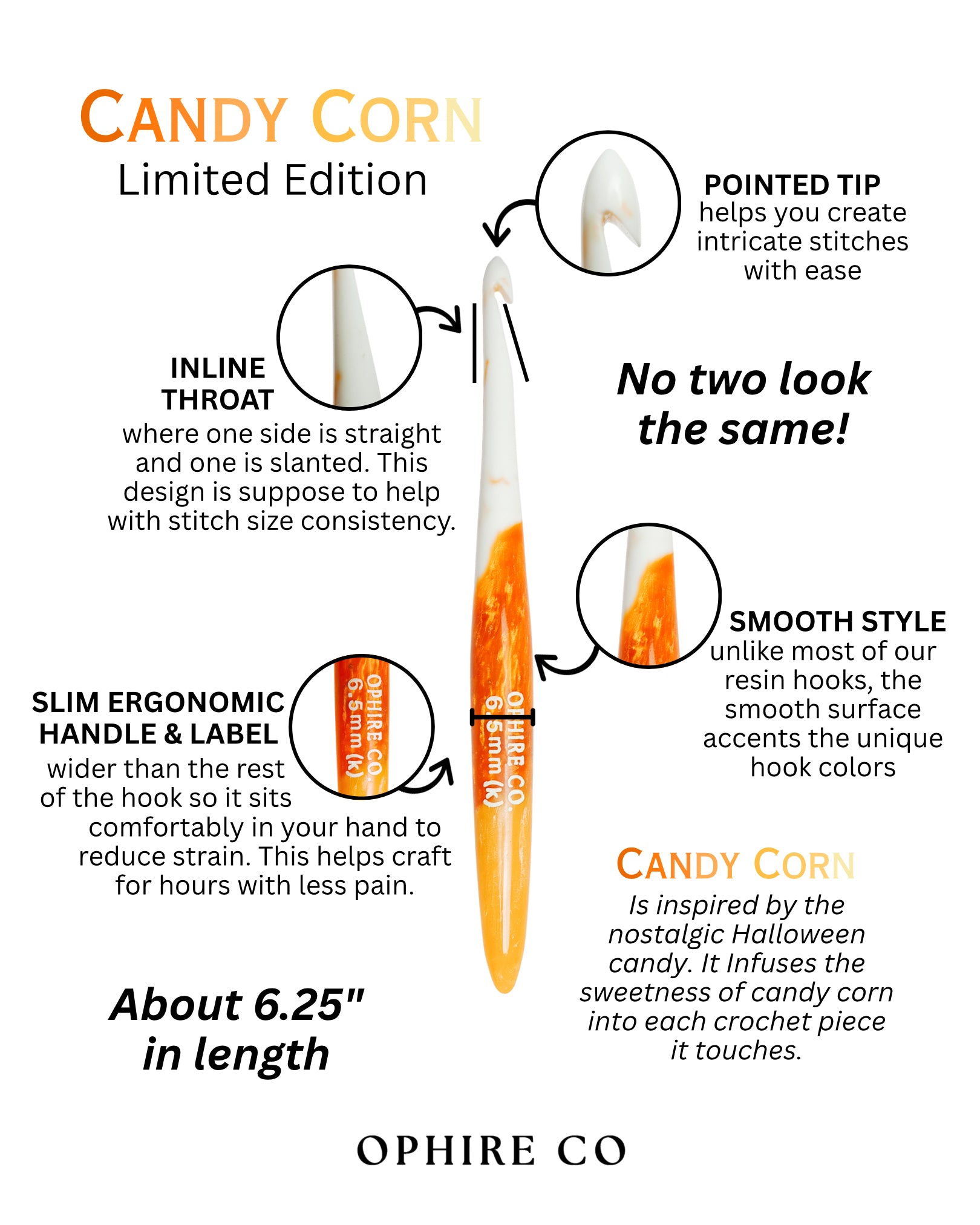 Sweeten your stitches with our Candy Corn Crochet Hooks! Inspired by the classic Halloween treat, each hook features stacked layers of bright white, shimmery orange, and golden yellow resin, perfectly capturing the nostalgic autumn candy in crochet form. Every hook gleams with a subtle sparkle that glows under the light, making it a festive favorite for cozy fall projects. Limited edition and irresistibly sweet, these hooks are a treat, not a trick!