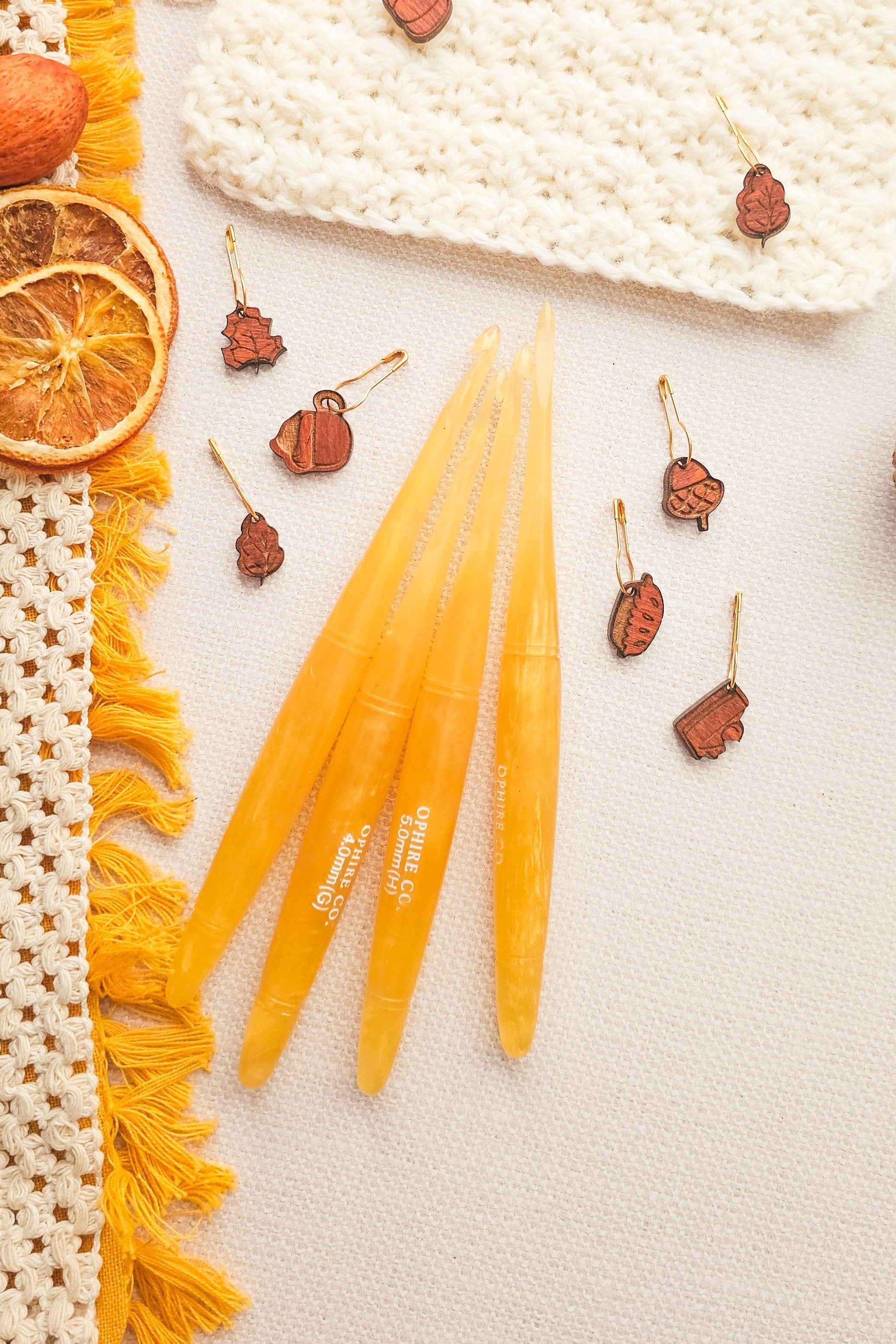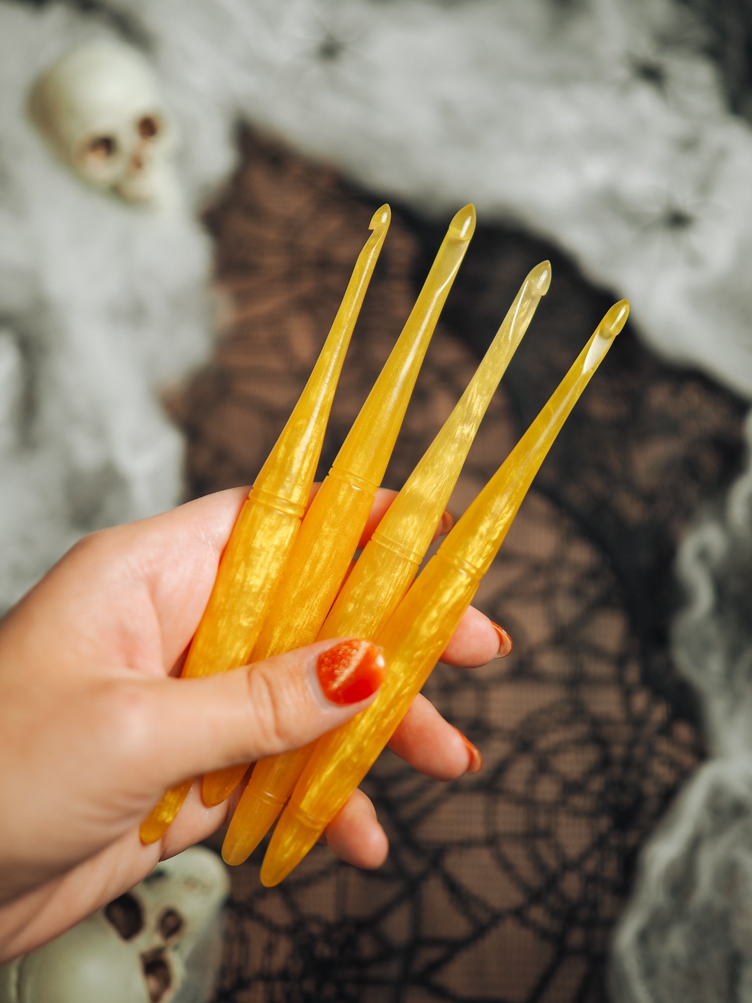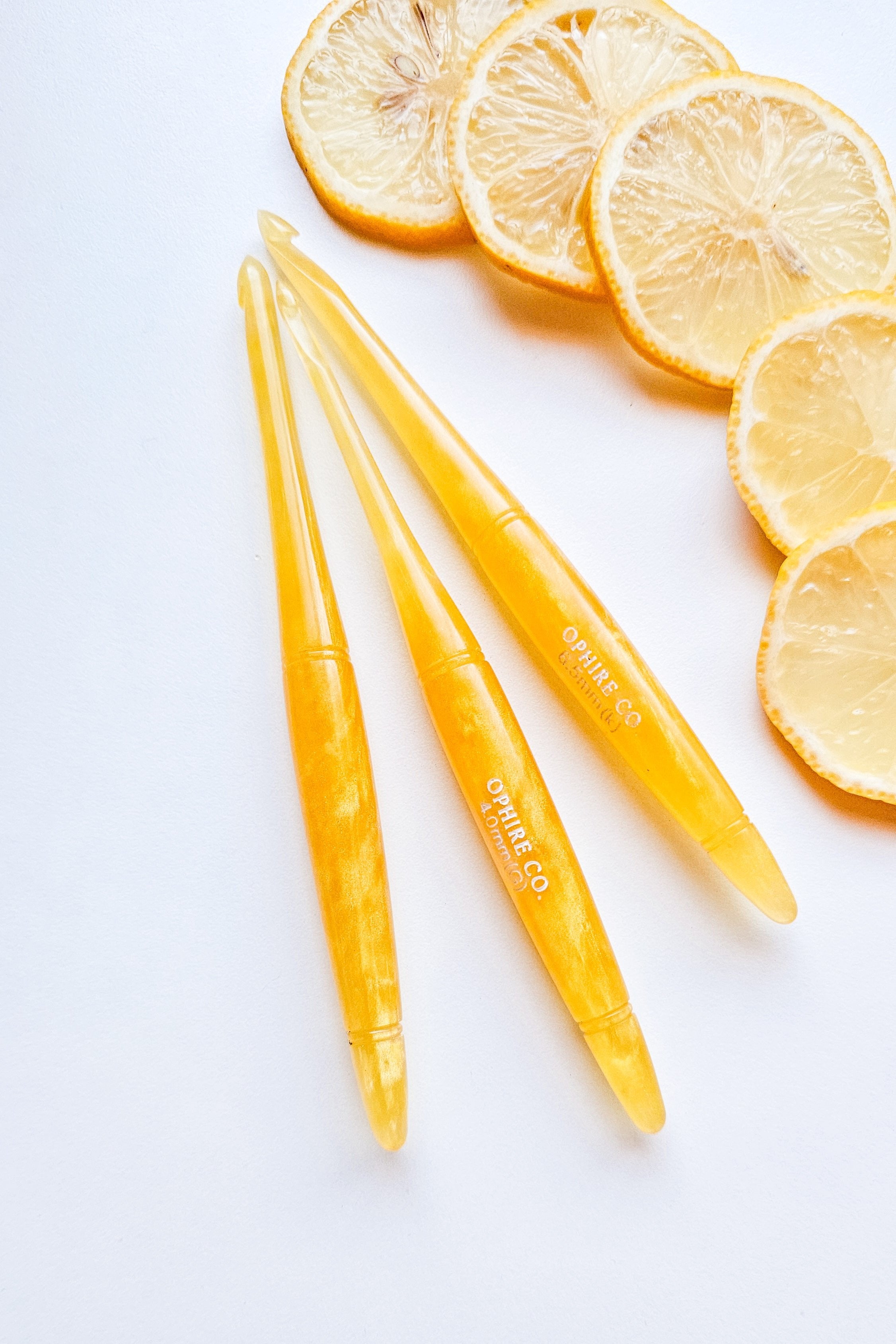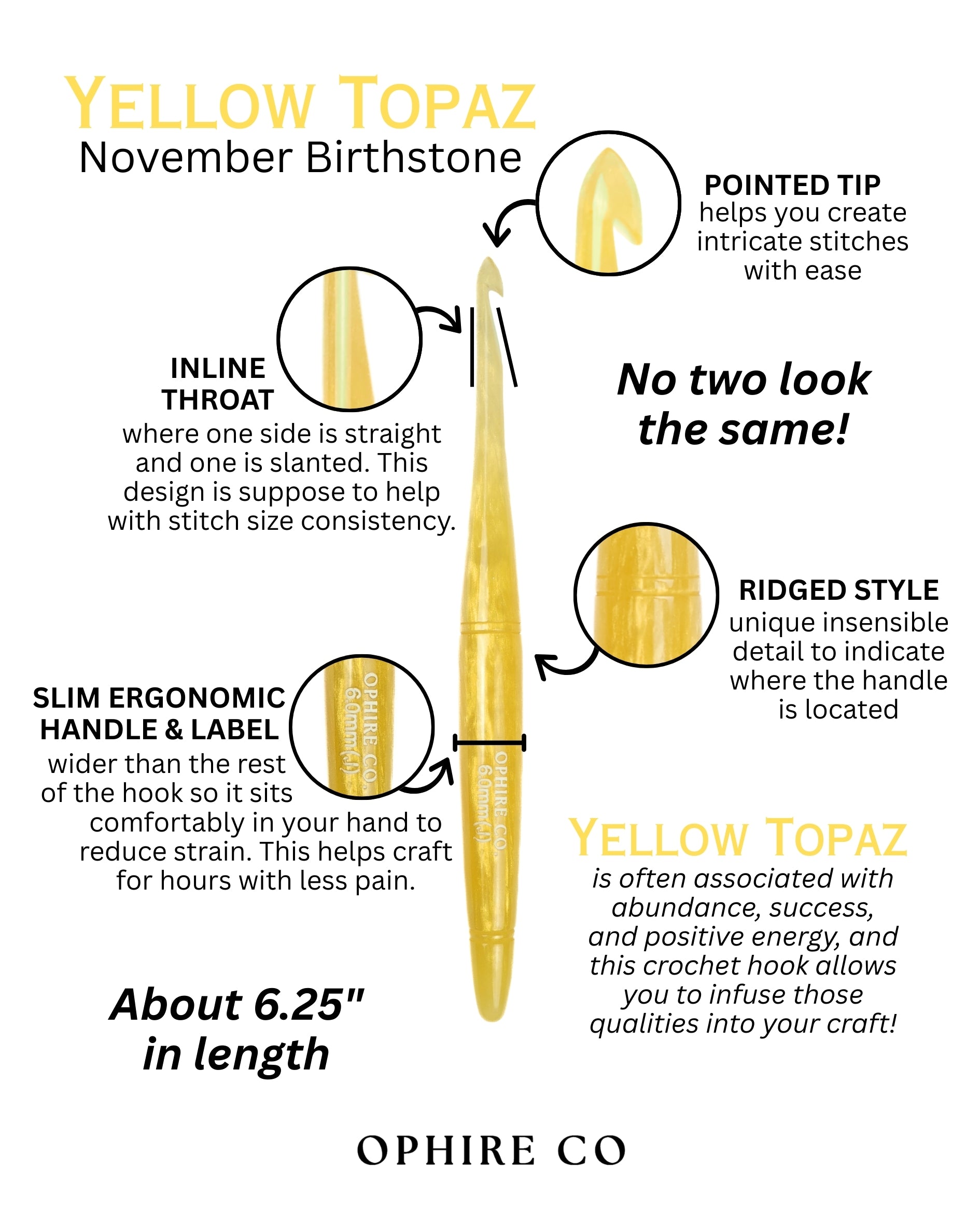 Yellow Topaz Crochet Hook, a crochet hook that radiates warmth and elegance, inspired by the golden glow of the November birthstone, yellow topaz.