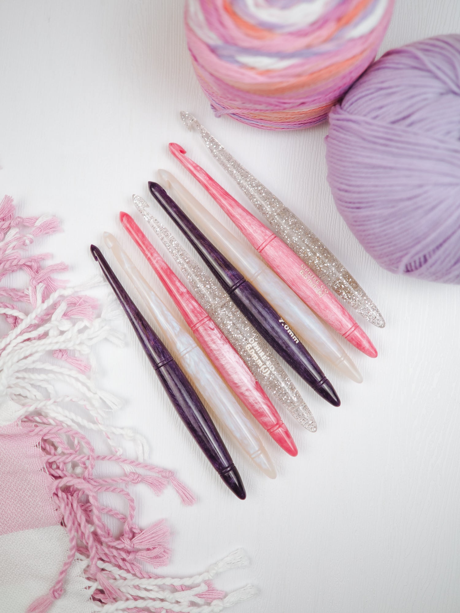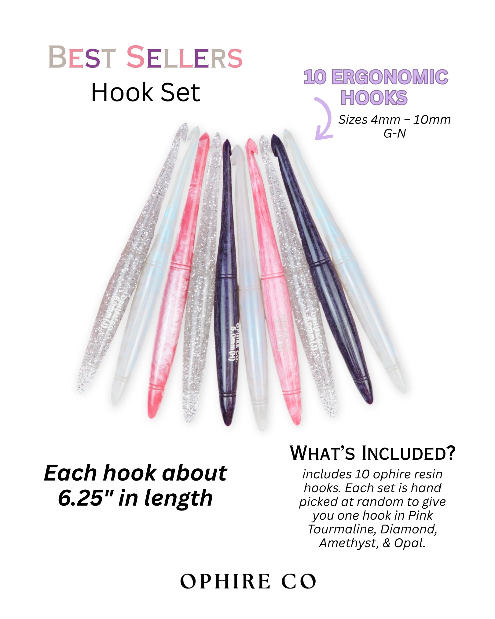 This 10-hook set includes sizes 4.0mm (G) to 10.0mm (N), with each ergonomic hook measuring approximately 6.25 inches long, offering comfort for both knife and pencil grip styles.