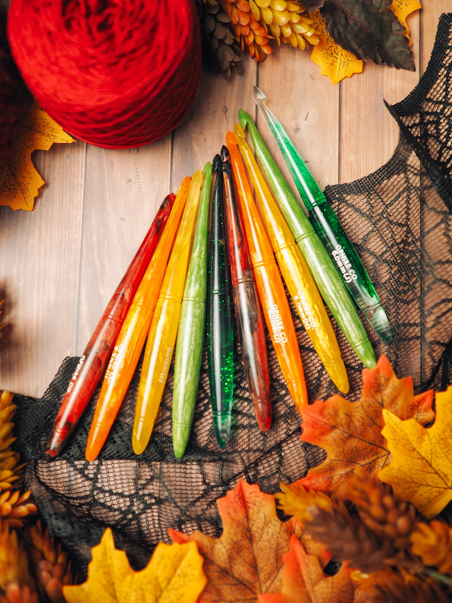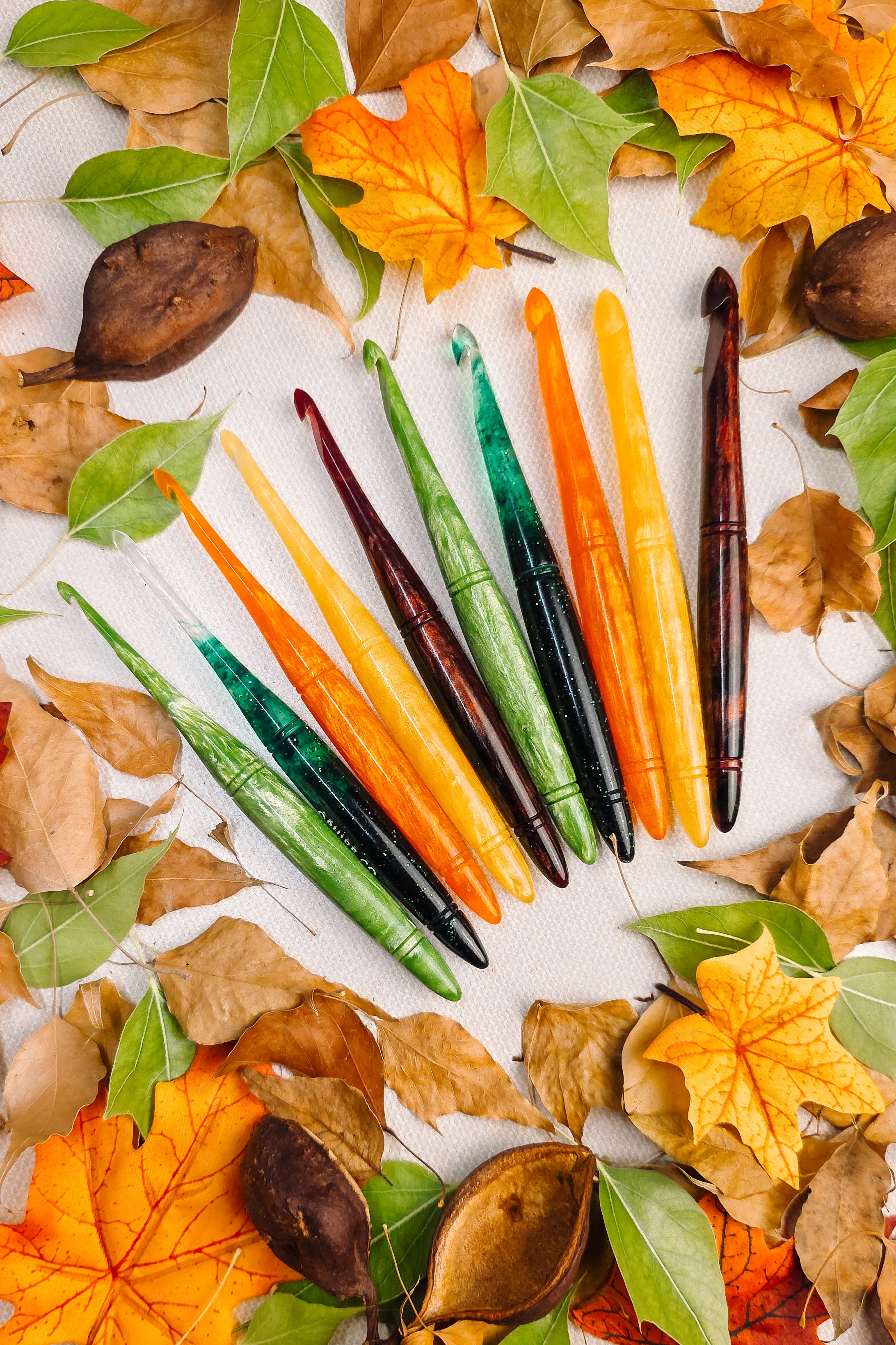 The Fall Leaves Mixed Crochet Hook Set captures the vibrant beauty of autumn with a stunning blend of greens, oranges, yellows, and reds. Just like the colorful canopy of leaves drifting through crisp autumn air, each hook swirls with warm, earthy tones and sparkling depth. Designed with Ophire’s signature ergonomic shape, this limited edition set brings the cozy magic of fall straight to your hands perfect for seasonal projects, gift-making, or simply celebrating the changing seasons with every stitch.