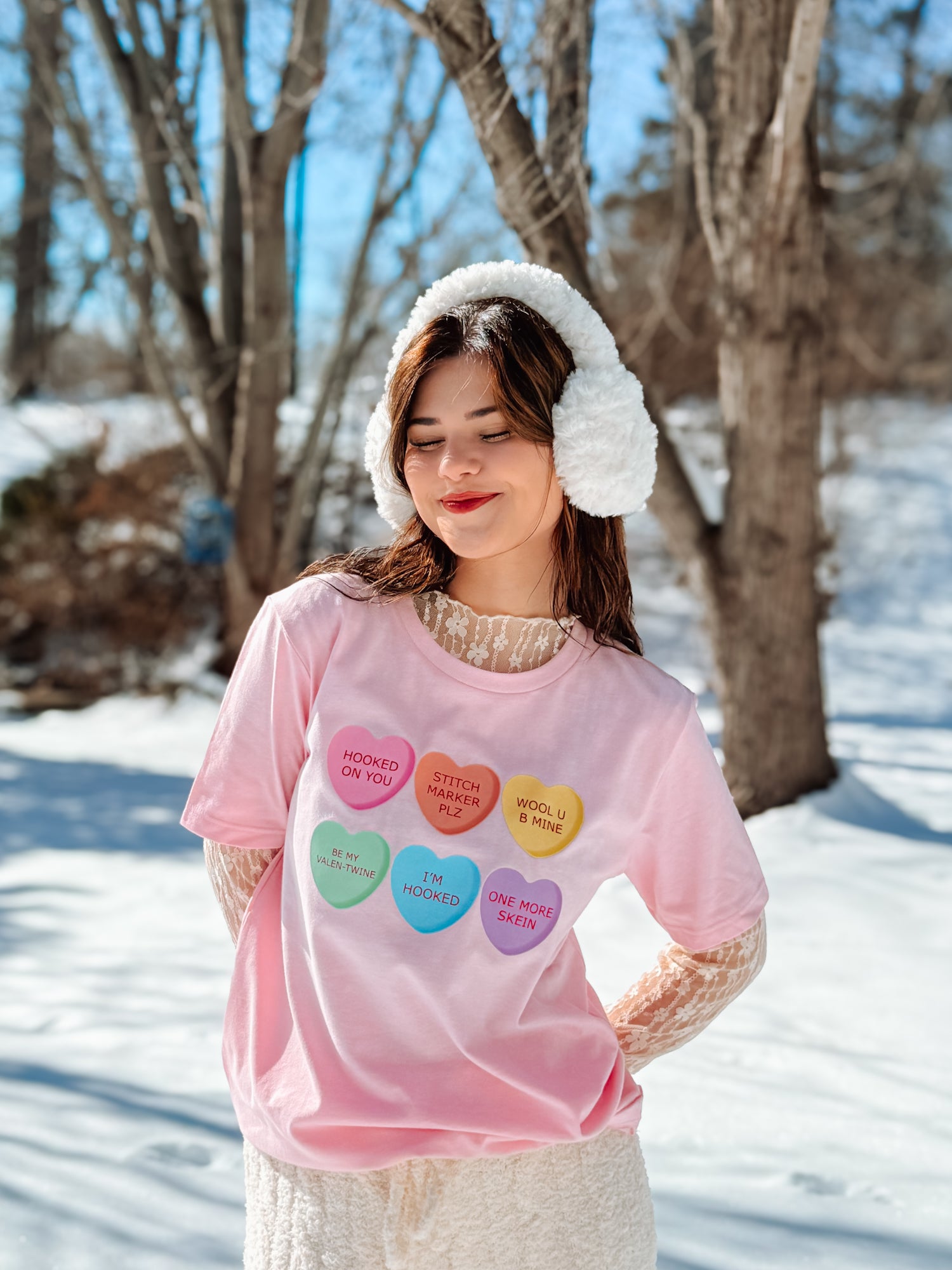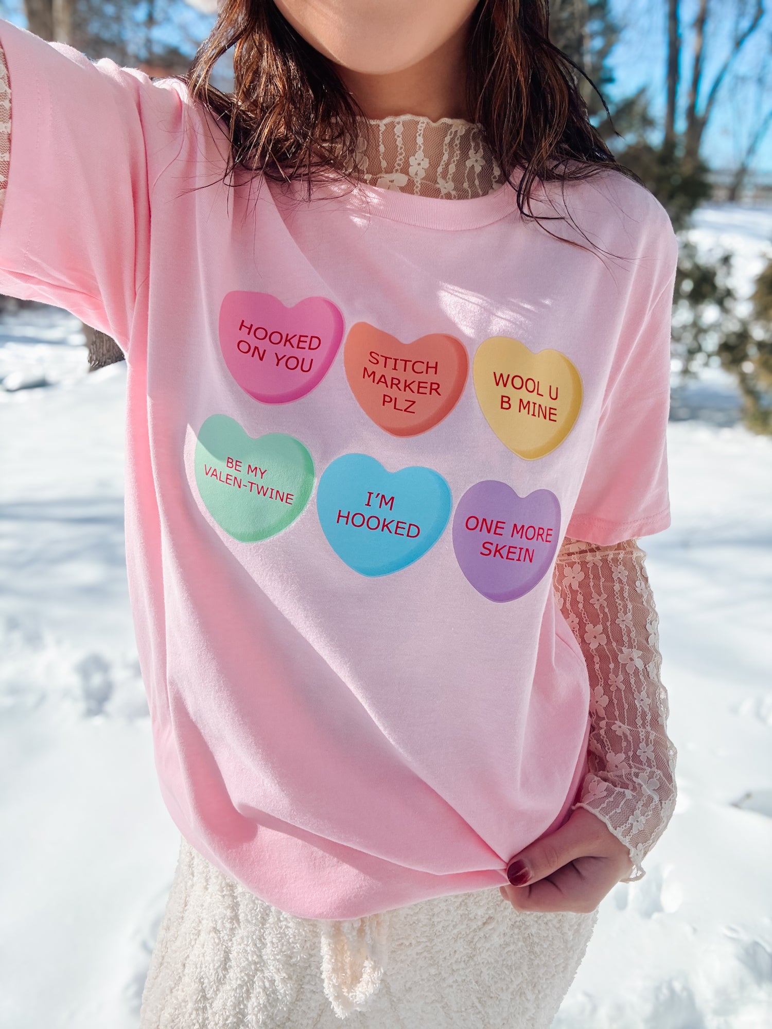 Our Sweetheart T-Shirt is the perfect blend of cozy and cute, featuring a soft pink base sprinkled with classic candy heart style sweethearts, each stamped with crochet inspired sayings we know you’ll love.