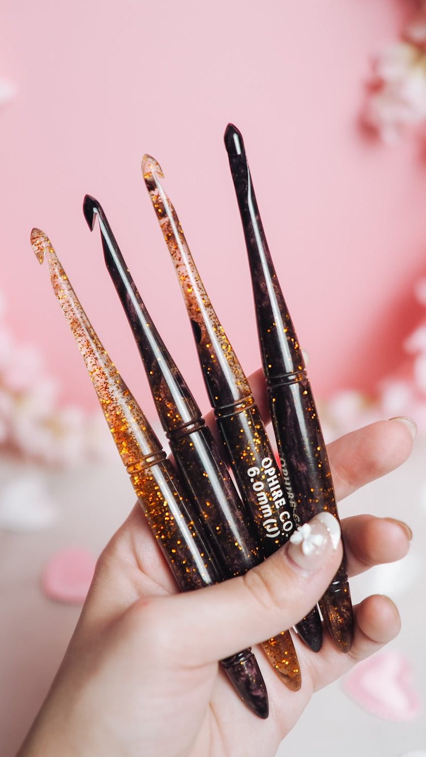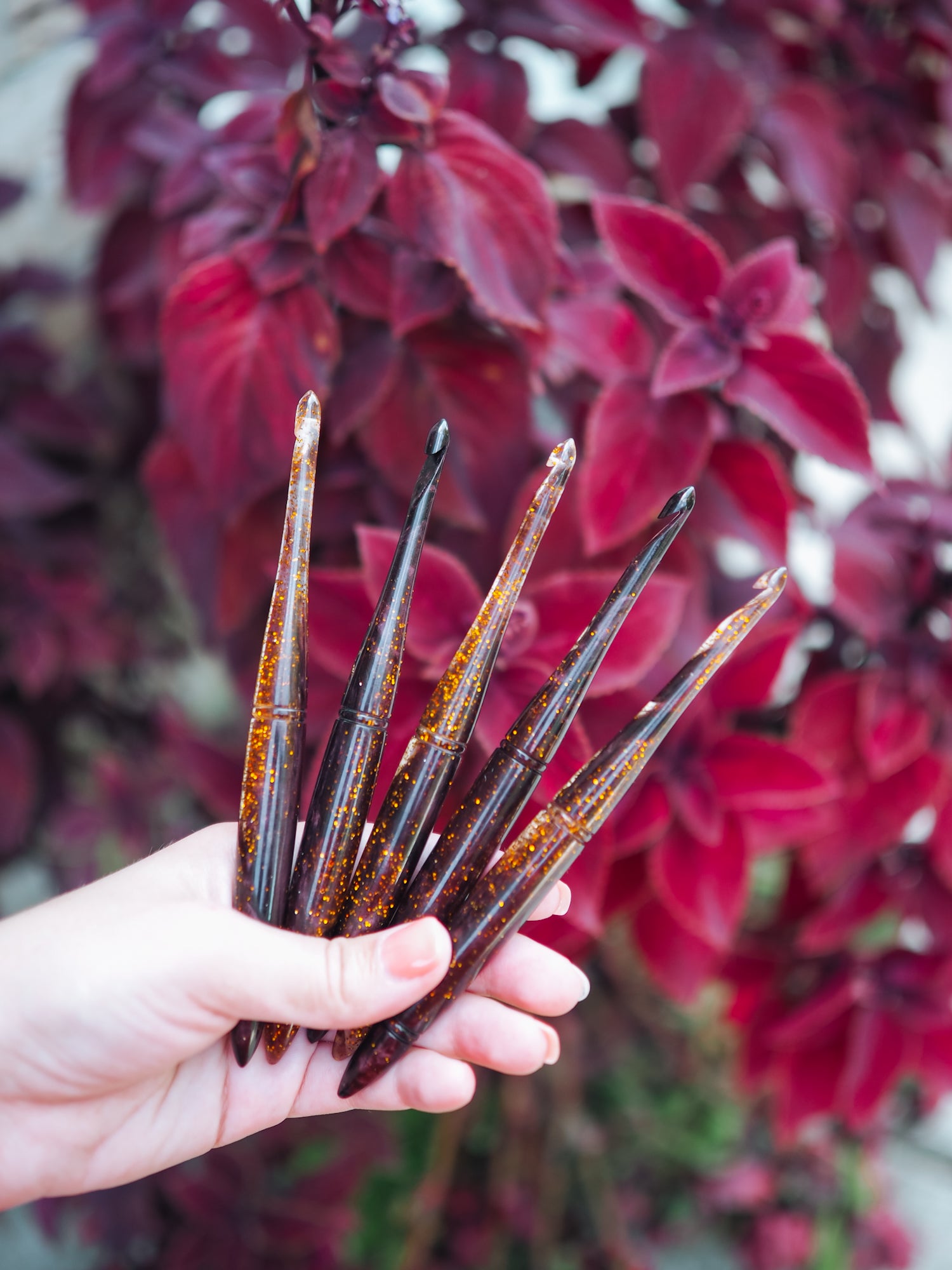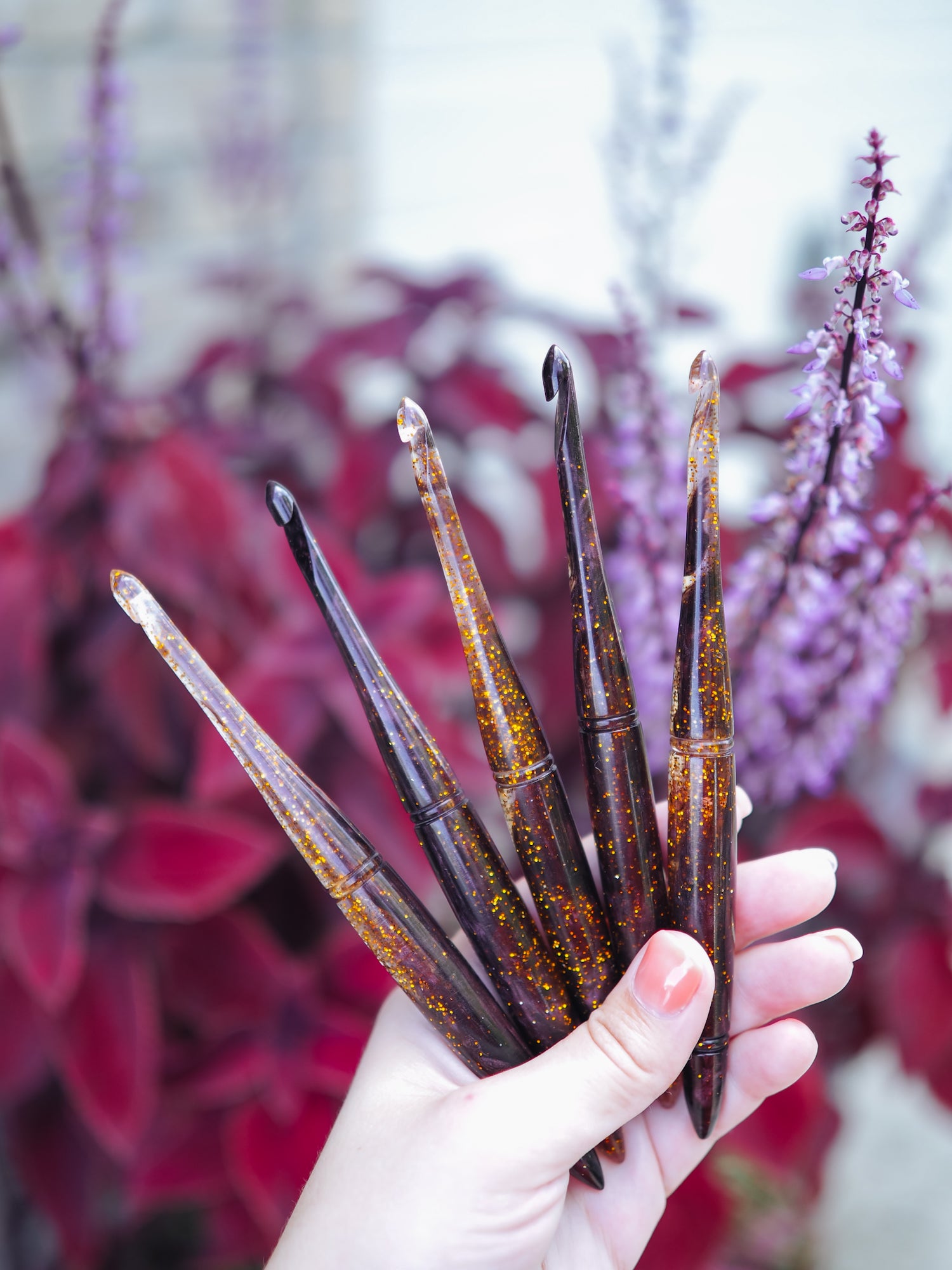 Dahlia is more than just a hook, it’s a statement piece. Its a smooth, ergonomic design that ensures comfort and ease during long hours of crocheting. The perfect hook for the fall season, Dahlia’s dark moody plum tones and golden sparkle pair beautifully with autumn yarns and cozy makes, from warm scarves to festive décor.