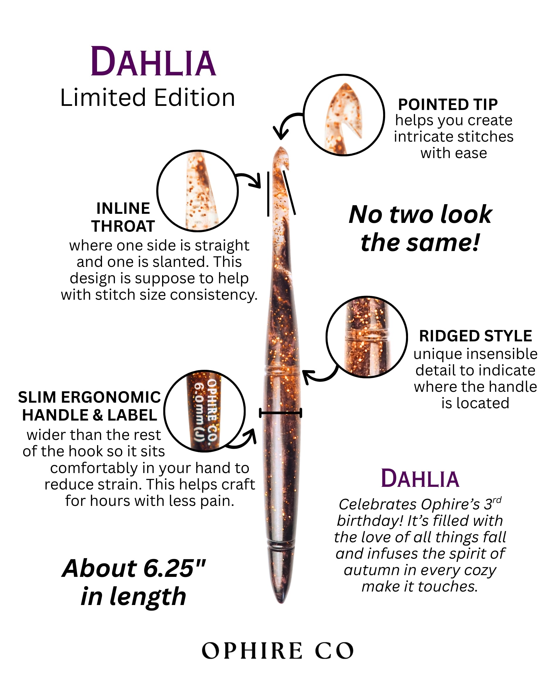 Celebrate with us as Ophire Co. turns 3! In celebration of our birthday, we present the Dahlia Crochet Hook, a striking limited edition crochet hook designed with dark moody vibes for the Fall season. This exquisite resin hook features a deep dark plum shimmer, nearly black, with radiant gold glitter throughout, reminiscent of the rich elegance of a dark blooming dahlia at twilight. Each hook is a unique work of art, blending luxury with bold sophistication.