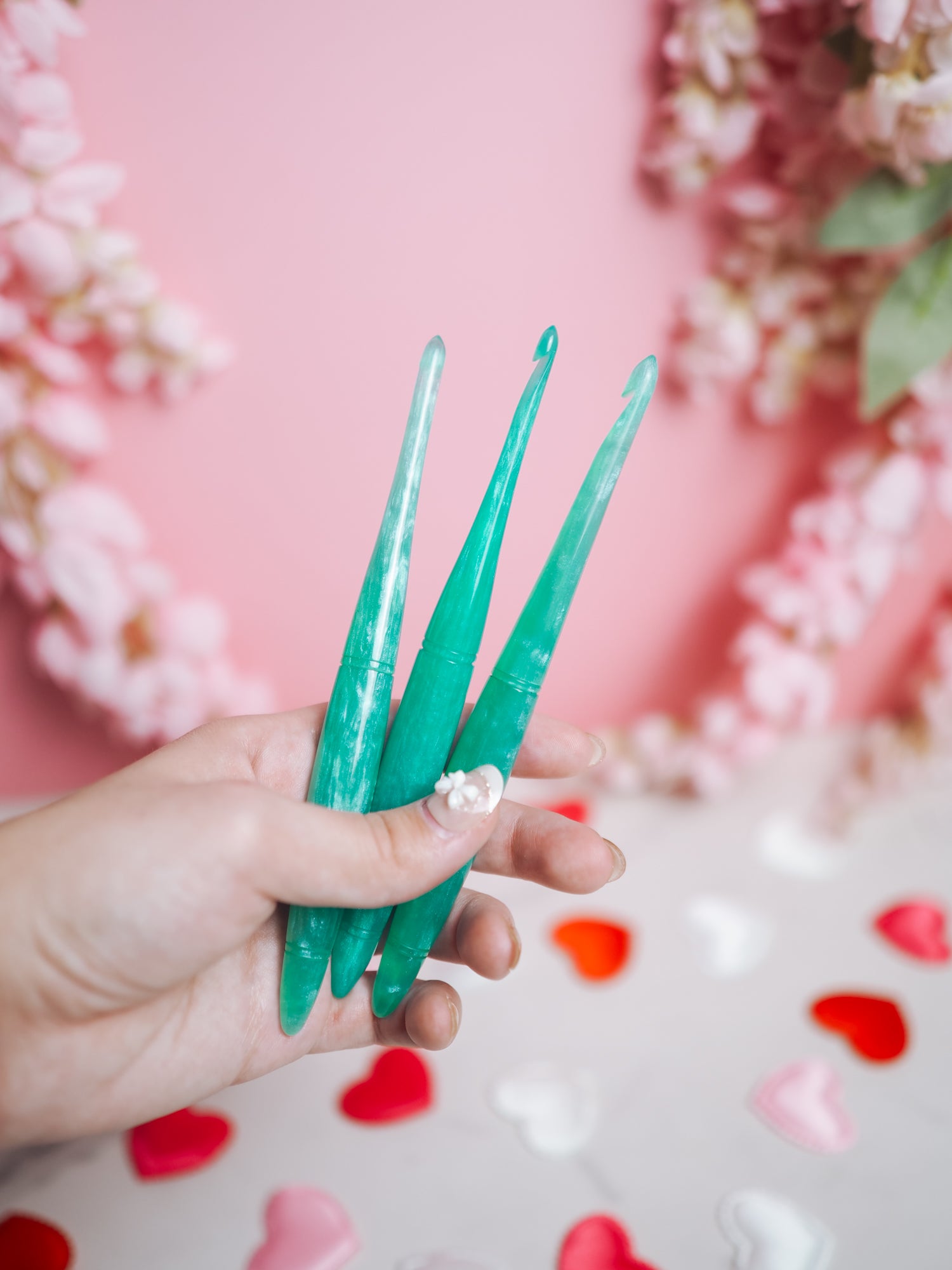 This crochet hook is a true work of art, meticulously crafted to capture the essence of Aquamarine's tranquil teal hues. The hook glistens with shades of pale teal and seafoam green, evoking the calming sensation of gentle ocean waves.
