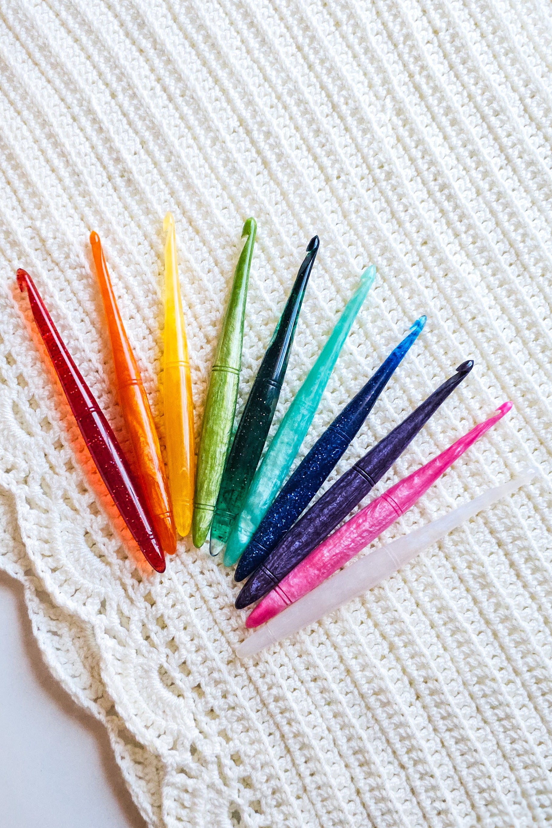 Get ready to crochet in full color with our Kaleidoscope Mixed Set! This vibrant collection includes 10 ergonomic resin hooks in a stunning range of rainbow hues. Each hook is approximately 6.25 inches long, perfectly balanced for both knife and pencil grip styles.